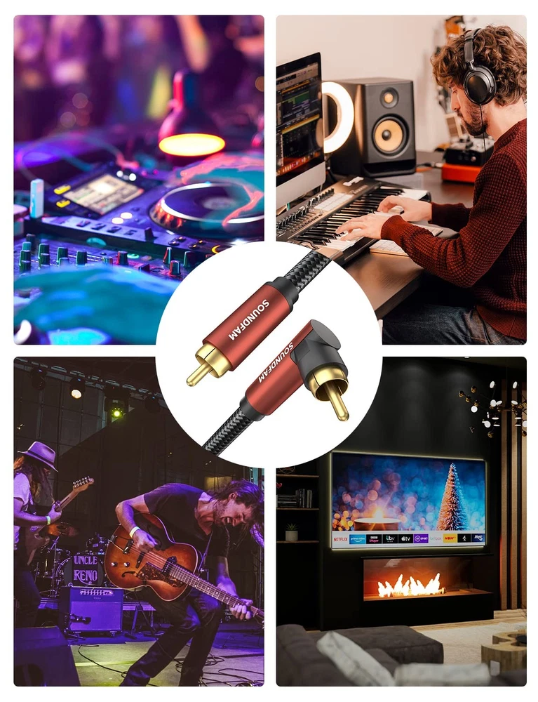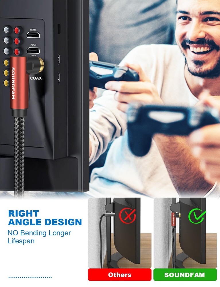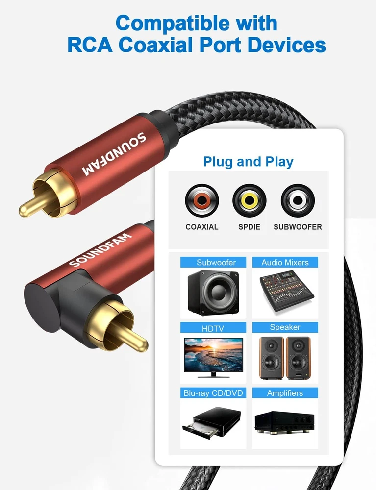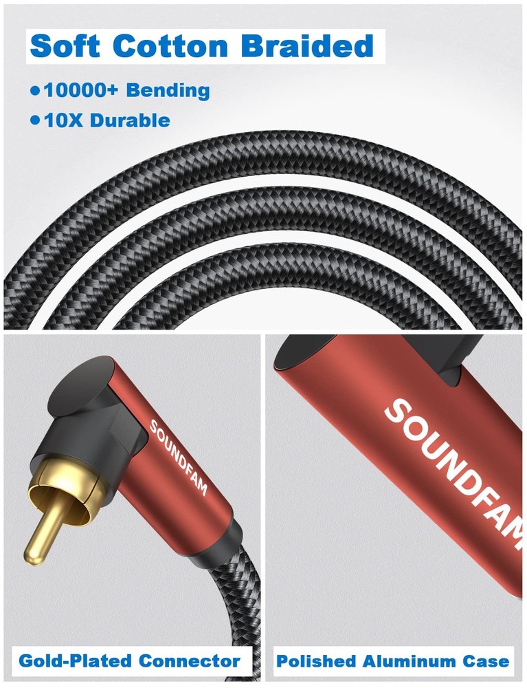 sub cable lfe subwoofer cable 90 degree RCA cable right angle subwoofer cable spdif digital audio coaxial cable elbow RCA male to RCA male audio cable shielded RCA subwoofer cable Vizio satellite RCA to speaker cable wire 【90 Degree RCA Cable】-- If you are experiencing problems with equipment in tight spaces and difficult to connect, the SOUNDFAM 90 degree RCA cable can help you solve your troubles. This RCA subwoofer cable is designed to save space, and the 90 degree connector prevents the cable from bending and lasts longer. 【Superior Sound Quality】-- This 90 degree subwoofer cable features corrosion-resistant RCA gold-plated connectors and a polished alloy housing that provides optimal conductivity and pure, clear stereo audio. Double shielded subwoofer cable, consisting of copper braided and aluminum foil, provides maximum signal power with minimum signal loss and protection against Radio Frequency Interference (RFI) and Electromagnetic Interference (EMI). 【Universal Compatibility】-- Low-loss, wide spectrum subwoofer cable, ideal for low-frequency signals produced by subwoofers, delivering deep all-round bass and precise sound quality. Compatible with devices with RCA port works with S/PDIF, digital, and composite video interfaces. 【Unparalleled Durability】-- Polished aluminum shell, 24K gold plated plugs, abrasion-resistant PVC, and soft cotton braided jacket make this RCA subwoofer cable more durable and flexible. With a flex life of over 10,000+ times, it is more durable than ordinary cable! 【What You Get】-- 1 x 90 Degree RCA Subwoofer Cable. 18 months worry-free warranty, 30 days free return. SOUNDFAM is committed to introducing quality products that are well-designed and reasonably priced, providing you with the best solutions for connecting work and life. Inquire within 12 hours for fast and efficient customer support!