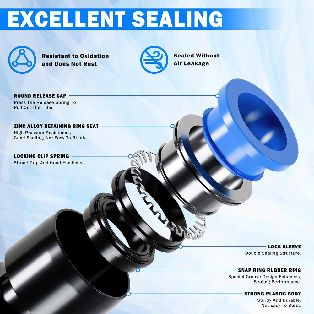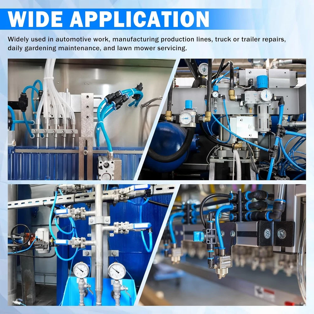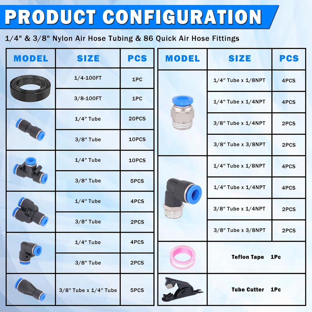 Store New Arrivals Add to Favorite View Feedback Contact 90 Pcs DOT Air Line with Quick Connect Air Fittings Kit 2 Roll 100FT 1/4" and 3/8" DOT Air Lines Kit with 88 Pcs Push Lock Air Line Fittings Pneumatic Push to Connect Air Hose Fitting Description Item model number PF-AL-100FT Item Package Quantity 1 Batteries Required? No Maximum Pressure 13.2 Bars Color Black Material Plastic, Polyamide Imide Item Weight 2.86 Kilograms Batteries Included? No Item Length 200 Feet Size 90 PCS-100FT 1/4+3/8 Included Components 100 FT 1/4" DOT AIR LINE, 100 FT 3/8" DOT AIR LINE, 86 PCS AIR HOSE FITTINGS, CUTTER & TEFLON TAPE 【90 PCS PACKAGE】- The 90 pcs air line fittings kit include 1 roll 100 ft 1/4" DOT air line, 1 roll 100 ft 3/8" DOT air line, 35 pcs straight union connectors, 15 pcs tee unions, 6 pcs 90° elbow unions, 6 pcs Y-splitter unions, 12 pcs straight push&NPT connectors, 12 pcs 90° elbow push&NPT connectors, 1 pc tube cutter, 1 pc Teflon tape. Quick connect Air line fittings types: 1/4", 3/8". 【PREMIUM DOT AIR LINE】- The 1/4" and 3/8" DOT air lines are made of high-quality Polyamide 12 nylon, meet D.O.T. FMVSS 571.106 approved, SAE J844 air brake system requirements, with corrosion resistance, high-temperature ductility, high pressure resistance and long service life. 【PNEUMATIC AIR FITTING】- The quick connect air hose fittings are made of stainless steel and high-quality polybutylene terephthalate (PBT), meet SAE J1131 air brake system requirements, with corrosion resistance, high-temperature ductility, low permeability and long service life. And they have stainless steel lock claws and good steel washers for thousands push lock and can withstand strong pressure without tripping out. 【MAX WORKING INTENSITY】- The pneumatic air fittings working pressure from air vacuum to 145 psi, 0- 0.9MPa.Temperature Range: 0°F to +60°F(32°C to +140°C),Proof pressure: 1.32Mpa. Note: see the tubing manufacturer’s recommendations for pressure and temperature limitations. 【EASY INSTALLATION】- The quick connect design and precise NPT threading make installation of air brake accessories easy, just push to connect, and bouncing up immediately when taking out the tube. And there is pre-applied sealant on NPT male thread for better sealing. 【WIDE APPLICATION】- The push-to-connect airline fittings suit PU / PA / PE /PP/ PVC tubes or hoses, can be used for air suspension systems, perfect for semi truck/trailer/RV/Automotive repair air line leak, also ideal for industrial workshops, air brake connections, daily garden or lawn mower repair, towing machine hose connection, etc. Product description 360° FREE ROTATION The air fittings can still be rotated 360° even after installation, more convenient to use, and effectively improve work efficiency. Long service life PERFECT FIT The push-to-connect airline fittings suit PU / PA / PE /PP/ PVC tubes or hoses, can be used for air suspension systems, perfect for semi truck/trailer/RV/Automotive repair air line leak, also ideal for industrial workshops, air brake connections, daily garden or lawn mower repair, towing machine hose connection, etc. LEAK-FREE STRUCTURE After multi-layer high-precision machining, equipped with stainless steel locking claws and steel washers that can withstand thousands of use. ABOUT US We offer the best prices around on high quality products. Our E-store includes media such as books, movies, music and games while offering electronics, toys, sporting apparel, clothing, tools, general home, garden items and more. SHIPPING We are always working hard to ensure your package arrives as soon as possible. Please understand that some factors like weather, high postal traffic, and the performance of shipping companies are outside of our control. We offer free shipping to the lower 48 states and ship within 2 business days of payment, usually sooner. We do not accept P.O. Boxes. Please provide a physical address. For shipping outside of the continental USA, we only use eBay's Global Shipping Program.The item is shipped to KY and then sent to the rest of the world. International customers are responsible for all duties and taxes. Continue to check out in order to calculate costs for shipping the item to your country. Messages regarding eBay's Global Shipping Program MUST be directed at eBay EXCLUSIVELY. RETURNS We offer a 30-Day Return Policy on items which you are not completely satisfied with. You have the option for a full-refund or an exchange of the item. No returns are available on items shipped outside of the USA. PAYMENT We accept PayPal. CONTACT US This page content is yet to come Please ad us to your favorite seller and visit again later Thank You CUSTOMER SATISFACTION We try our very best to make sure every customer is completely satisfied. If there's a problem, message us! We're happy to help. WE ACCEPT Copyright © 2021 AutoDS. | All Rights Reserved