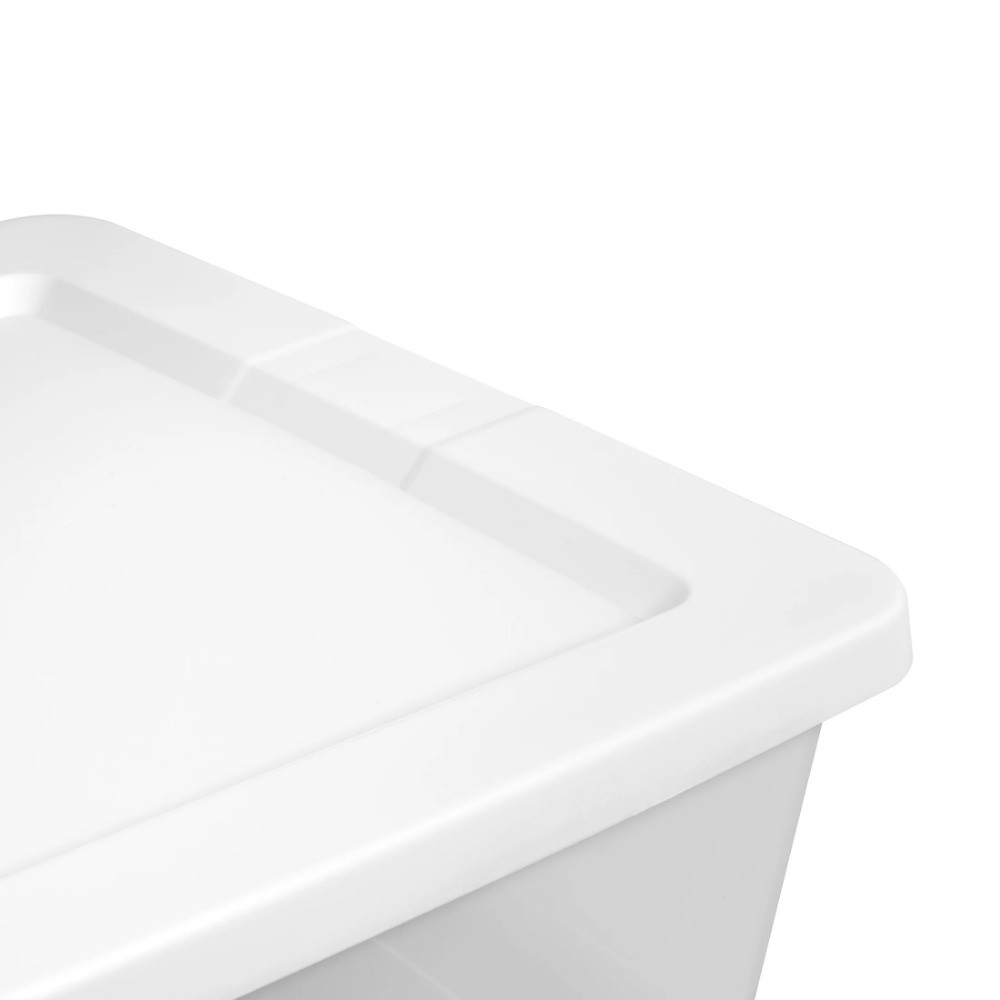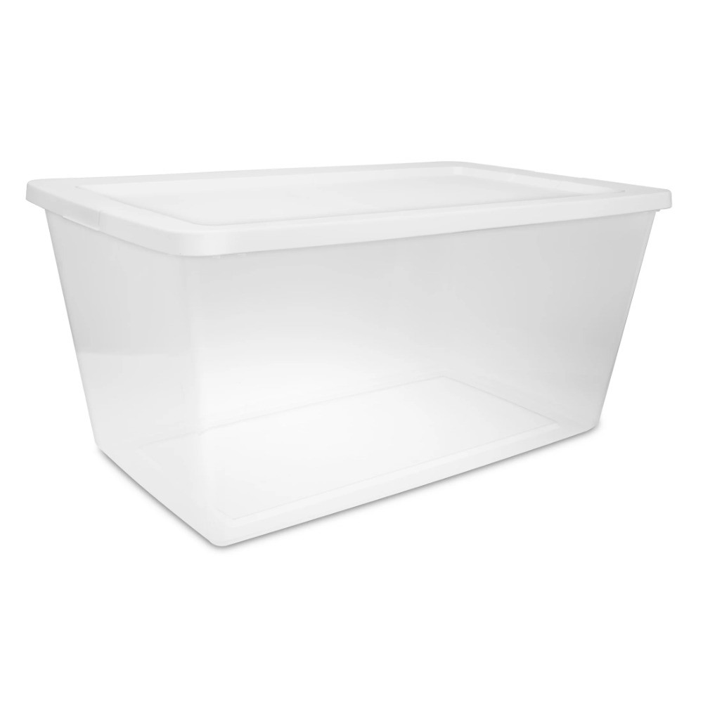 Organization is made easy with the 90 Quart Clear Storage Bin with lid! The clear base lets you see what's inside while the snap-on lid keeps everything contained. The space-efficient shape and deep recessed lids allow bins to stack securely, maximizing vertical storage space. Sort and store a variety of household items to bring order to closets, bedrooms, and more! Ideal for storing sporting gear, sleeping bags, seasonal clothing and other larger, bulkier items. Note: Use good judgment when storing items, don’t overload, keep heaviest bin at bottom, and don’t stack too high. The overall assembled dimensions of this item are 29 3/8" L x 18" W x 13 5/8" H. 90 Quart Storage Box, Clear Plastic Storage Bin with Snap-on Lid, White Outside Dimensions: 29 3/8" x 18" x 13 5/8" Interior Dimensions at bottom: 24 3/4" x 16 5/8" x 12 7/8" Clear base allows you to view contents at a glance Snap-on lids keep contents contained and are recessed to allow for stacking Large capacity is ideal for bigger, bulkier items and basic storage needs throughout the home Use good judgment when stacking items, keep heaviest bin at the bottom BPA-free and phthalate-free
