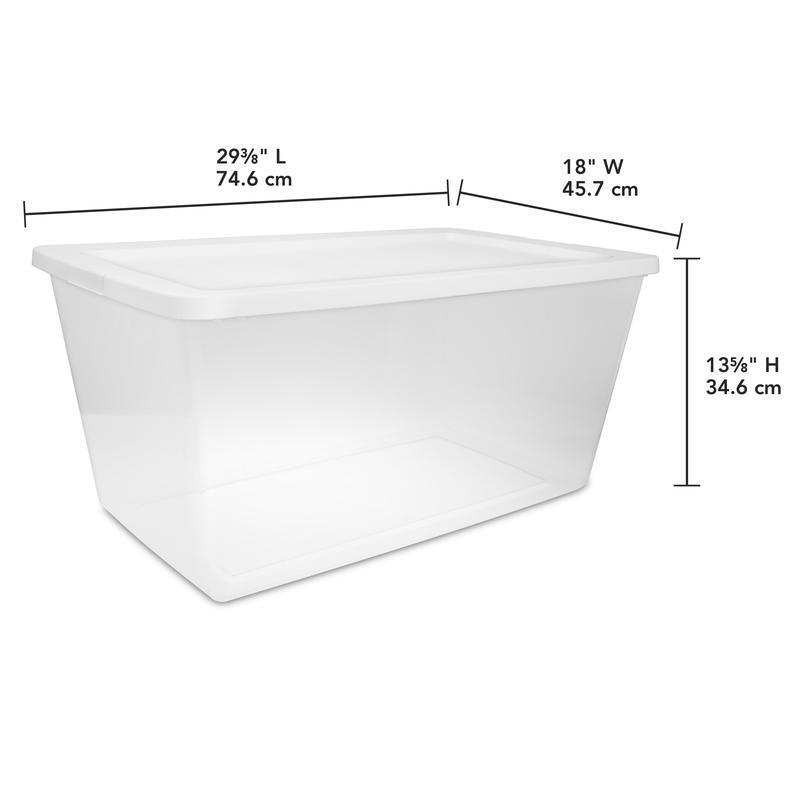 7.9 Gallon Step On Trash Can Plastic Round Kitchen Garbage Trash Can for Home US 29.8 USD Free shipping Wide 3 Drawer Rolling Storage Cart Organizer Home Office Craft Nursery New 24.94 USD Free shipping Footlocker Plastic Storage Tote Container Box w/Handles Black BPA-Free for Home 35.94 USD Free shipping No-Spill 5 Gallon Gas Can Portable Fuel Container w/Push Button Control US 35.83 USD Free shipping 2 pack 11-Piece 3/8-Inch Drive Standard Impact Socket Set SAE Size 33.27 USD Free shipping Heavy Duty Wheeled Footlocker Plastic Stackable Box Utility Storage Container 52.76 USD Free shipping Gluten Free Vegetable Stew Blend 2 Lbs No. 10 Can for Food Storage 40 Servings 26.34 USD Free shipping High-Protein Grain-Free Dry Cat Food W/ Real Chicken Adult Cats 4lb Bag New 25.14 USD Free shipping 399PC Auto Electrical Repair Kit Universal Fit Crimp Tools Durable Plastic Case 34.02 USD Free shipping 24 Can Zipperless Soft Side Cooler Insulated Bag Portable for Lunch Beach Picnic 41.92 USD Free shipping 2PC Peanut Butter Creamy 7 G Protein per Serving Shelf-Stable 80 oz Plastic Jar 25.02 USD Free shipping Diabetic Protein Shake 16 Count Low Glycemic Meal Replacement Snack Gluten Free 35.92 USD Free shipping Organization is made easy with the Sterilite 90 Quart Clear Storage Bin with lid! The clear base lets you see what's inside while the snap-on lid keeps everything contained. The space-efficient shape and deep recessed lids allow bins to stack securely, maximizing vertical storage space. Sort and store a variety of household items to bring order to closets, bedrooms, and more! Ideal for storing sporting gear, sleeping bags, seasonal clothing and other larger, bulkier items. Note: Use good judgment when storing items, don’t overload, keep heaviest bin at bottom, and don’t stack too high. The overall assembled dimensions of this item are 29 3/8" L x 18" W x 13 5/8" H. Sterilite 90 Quart Storage Box, Clear Plastic Storage Bin with Snap-on Lid, White Outside Dimensions: 29 3/8" x 18" x 13 5/8" Interior Dimensions at bottom: 24 3/4" x 16 5/8" x 12 7/8" Clear base allows you to view contents at a glance Snap-on lids keep contents contained and are recessed to allow for stacking Large capacity is ideal for bigger, bulkier items and basic storage needs throughout the home Use good judgment when stacking items, keep heaviest bin at the bottom BPA-free and phthalate-free You may also like High-Protein Grain-Free Dry Cat Food W/ Real Chicken Adult Cats 4lb Bag New 25.14 USD Free shipping 4 Piece Iron Canister Set Countertop Food Storage Container w/Lids for Home US 35.78 USD Free shipping Portable Kid's Dome Tent Easy Setup for Beach Backyard 6' x 4' x 34” US 26.32 USD Free shipping 6QT Pre-Seasoned Cast Iron Dutch Oven Pot with Cast Iron Lid and Dual Handles US 77.96 USD Free shipping Electric Gooseneck Kettle W/ Automatic Shut-Off Precision Pour Ergonomic Handle 46.76 USD Free shipping Anti-Fatigue Ultimate Comfort Kitchen Mat 32"W x 20"L Easy To Clean for Home US 26.34 USD Free shipping 2-Shelf Wood Entertainment Bar Cart Home Rolling Tray Kitchen Serving Cart NEW 99.97 USD Free shipping Heavy Duty Wheeled Footlocker Plastic Stackable Box Utility Storage Container 52.76 USD Free shipping Garden Sprayer 4 Gal Backpack Sprayer Gardening Pesticides Fertilizers Lawn Care 83.97 USD Free shipping 5-Tier 40-Pocket Canvas Carousel Organizer Shelf Closet Storage Hanging Storage 29.94 USD Free shipping Rolling Computer Writing Desk W/ 2 Storage Shelves Drawer Offices Workstation US 93.74 USD Free shipping 11-Piece 1/2" Drive 6-Point Deep Impact SAE Socket Set w/Storage Case 26.58 USD Free shipping
