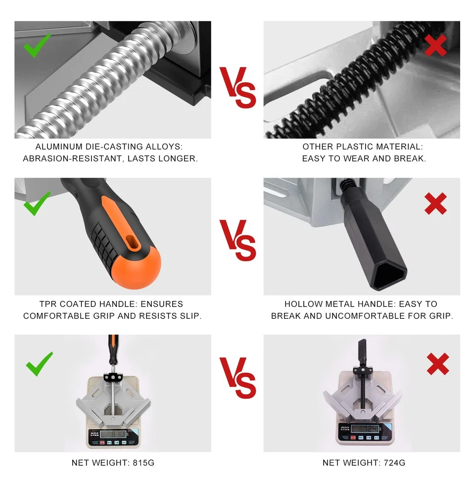 【Premium Quality Clamps for Woodworking】: Woodworking gifts for men. Sturdy 90 degree wood corner clamps, made of premium aluminum alloy die-casting material with heat treated rust proof coating, ensure abrasion-resistant, heavy-duty, and long-lasting use. 【70mm Clamping Range】: Maximum clamping range is approx. 2.75in/70mm; jaw width: 3.74in/95mm; jaw depth: 1.4in/35mm. It can accommodate metal tubes, steel rods, wood, thick glass, acrylic pieces, and more. It is wood working tools and equipment commonly used in daily life as cabinet clamps, etc. Corner clamps for woodworking are a great tool to make woodworking projects easier. 【Adjustable Swing Jaw Design】: The single-handle jaw of the Corner Clamps for Woodworking can be rotated in two-way, which allows two different thicknesses of rods or blocks to be joined at an angle of 90 degree. The design will fix your work pieces precisely. 【Ergonomic TPR Coated Handle】: Clamps for woodworking have rubber handles. Rubberized single handle offers a comfortable grip and prevents slip. Solid and anti-skid, helps to set up instantly and secure quickly. 【Versatile Use】: clamps for woodworking jig is perfect for aligning, nailing, drilling, woodworking, welding, screwing, making cabinets, assembling furniture, furniture repair connection, building wooden boxes, picture frames, birdhouse, mailbox, DIY woodworking, and dresser drawers, etc.Gifts for Men, wood worker gifts, woodworking gifts, tool gifts.