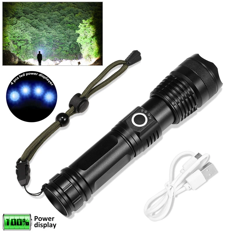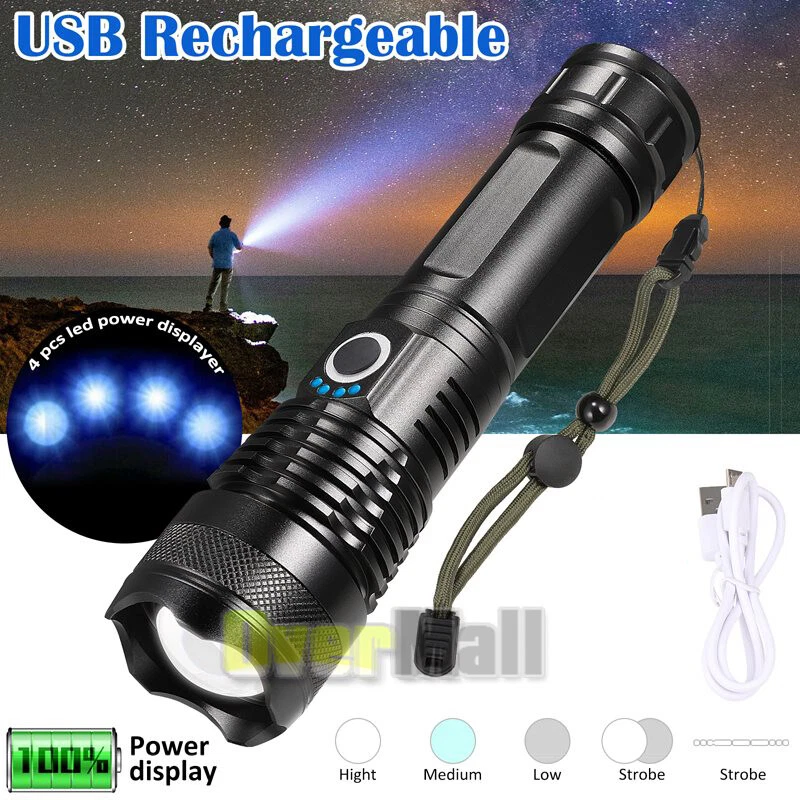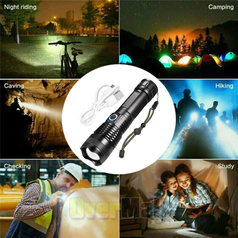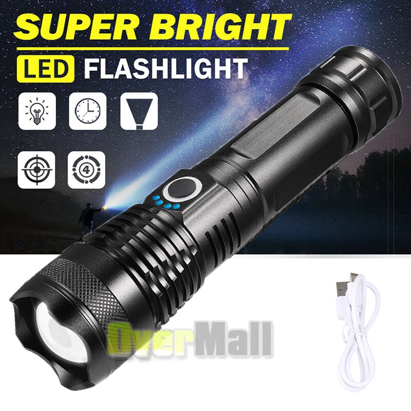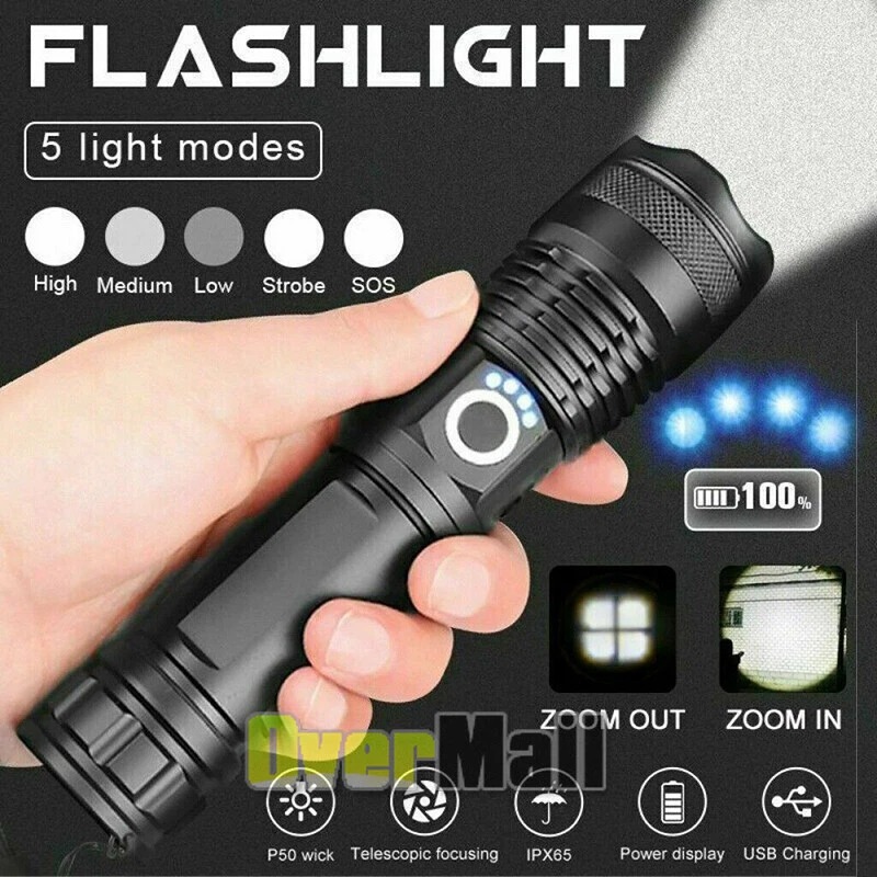 9000000 Lumens LED Flashlight Tactical Light Super Bright Torch USB Rechargeable 9000000 Lumens LED Flashlight Tactical Light Super Bright Torch USB Rechargeable BEST CUSTOMER SERVICE ON OUR sale2015express EBAY STORE↓ ↓ ↓ 〓SHIP From US Local Stock 〓FAST & Free, 1-6 Days Arrival 〓FREE Return, Seller Pay!! 〓LIFETIME Money Back Guarantee 〓LIFETIME Free Replacement Guarantee 〓LIFETIME Warranty 〓QUICKLY Reply within 24 Working Hours 〓 MOST orders ship within 1 business day with Tracking Number 〓 ANY PROBLEM please email us before feedback, thanks! Add our listing to Watchlist Or Add to Cart , you will get more discount!!! Feature: - Super Bright &wide-range illumination :The irradiation distance is 984 feet (300 meters). Equipped with high-efficiency p50 LED chip, this powerful flashlight produces 1200 lumen max of brightness -5 flash light Modes : High-Middle-Low-Strobe-SOS. And the product has a memory function. -4 Rechargeable way: It can powered by 1* 18650 lithium-ion rechargeable battery,1*26650 ,3*AAA or USB recharging for 5 hours (neither is included).Once fully charging can be used for more than 10 hours in low setting mode. -20m/65.6feet Adjustable range: Just rotate torch head to adjust the zooming for your desire range. - Intelligent power display: Red/green lights indicate battery power and charging status like showing 25% 50% 75% 100% of the battery level clearly. - IPX5 Waterproof and Durable : IPX5 waterproof rating use for rainy day, snow day, power outages and most natural disasters. -Applicable for: Hiking, camping, self-defense,emergency ,teaching, searching, hunting, daily carrying, night riding, caving, night fishing, patrol. Specification: Material: aluminum alloy USB Rechargeable: Yes Battery type: 26650*1/AAA*3/ 18650*1 (not including) Power: 10W Light source : LED Waterproof: IPX5 Brightness: 1200LM Lamp beads: P50 Range: 300m/984 feet 360 degree rotation: No Size:(up*bottom)34*42mm/1.34*1.65inch Before stretching:160mm/6.3inch After stretching:182mm/7.17inch Mode: 5 modes (High-Middle-Low-Strobe-SOS) Light color:pure white Package including: 1x Zoom LED Flashlight 1x USB Charging Cable Payment Delivery details About us Contact us Payment PayPal accepted. Payment should be expected with 4(Four) days after bid. We appreciate prompt payment and unpaid items will be filed for Final Value Fee if payment not received in 4 days. Delivery details Shipping available time: Mon. - Fri. exclude holidays Fast Package Handle-All orders will be shipped out the next business day. Tracking notification will be updated to the eBay transaction record ASAP. We Ship to Payment address ONLY. So please confirm shipping Address prior to your payment. Wrong address provided will be decided to buyer's fault. Resend rates will be charged. International Orders: The buyer is responsible for any applicable import duties and local taxes Our price does not include taxes, VAT, or other hidden charges. About us Welcome to OverMall, We pride ourselves on providing the outstanding service and high qualtiy products, make our customer feel confident buying online. For the most US address, we offer free standard shipping. By shopping with us, you can guarantee the latest technology for the best possible price. Contact us Pls contact us by ebay message if you have any problom ALL replies will be sent to your email, if you don't get response within 1-2 business days, pls check your My Messages' in case your email provider has an overly-aggressive spam filterblocking eBay's emails. Please email us AGAIN.