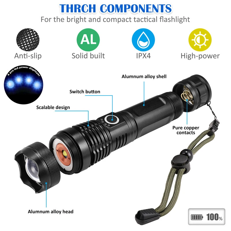 Material: Aluminum Alloy Bulb Type: LED Features: Adjustable Focus, USB Rechargeable gtin13: Does not apply Type: Tactical MPN: Does Not Apply Model: Does not apply UPC: Does not apply Brand: Unbranded