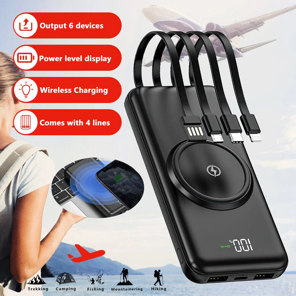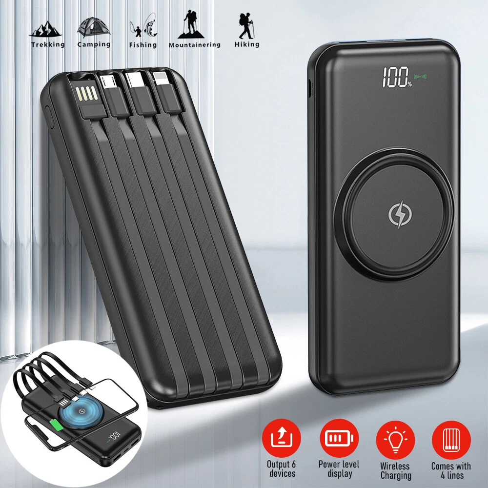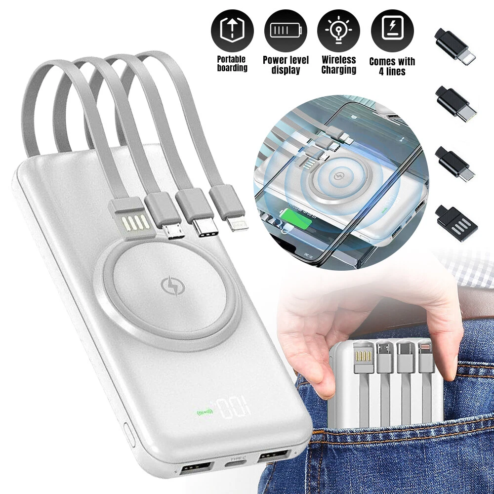 Features: 【Built-in 4 cables + 15W wireless charging】Wireless portable charger supports 5W/7.5W/10W and 15W MAX wireless fast charging; Built-in 3 5V2.1A output cables, for iPhone, Type-C, Micro, and1 USB input cable. 【The Safety Of The Power Bank】Built-in intelligent chip automatically identifies the charging device, Safety circuit design, multiple protection - overcharge, over-discharge, overcurrent, short circuit, overvoltage, overtemperature. 【Universal Compatibility】3 different built-in 3 output cables can be charged by almost kinds mobile phones, iPhone,Samsung,Nokia,Google Pixel,Nexus,Android phones,iPad and more,compatible with 90% electronic devices in the market. 【Small Slim Design & Light weight】extremely convenient for travel and daily use in charging electronic devices i.e. mobile phones,camera,headphones,player,smart watch and tablets. Compatibility: For iPhone 13 Mini/13/13 Pro/13 Pro Max For iPhone 12 Mini/12/12 Pro/12 Pro Max For iPhone 11/11 Pro /11 Pro Max For iPhone X/XS/XS MAX/XR For Apple AirPods For Samsung Phone For LG Phone For Motorola Phone For Other Phone(support wireless charging) Package included: 1x 900000 mAh power bank