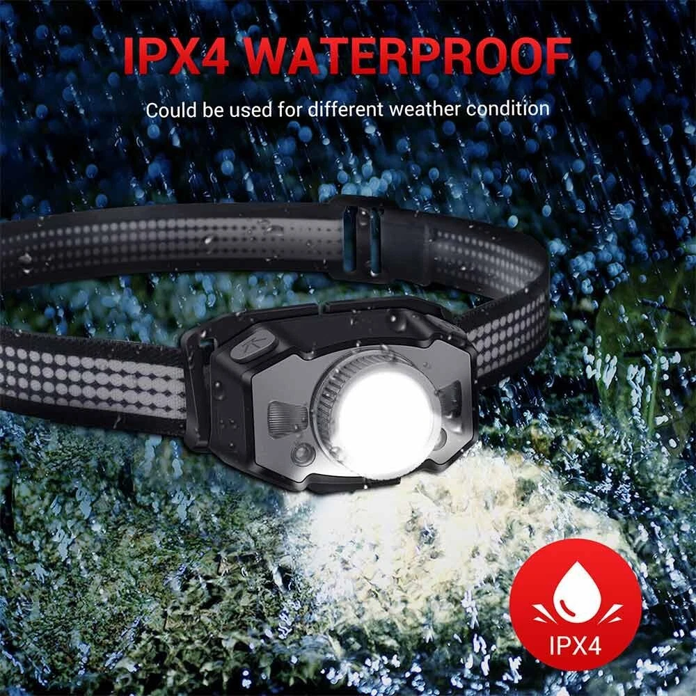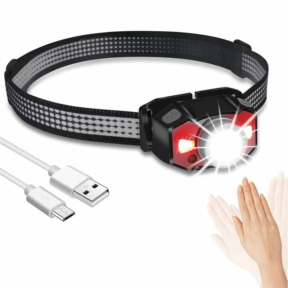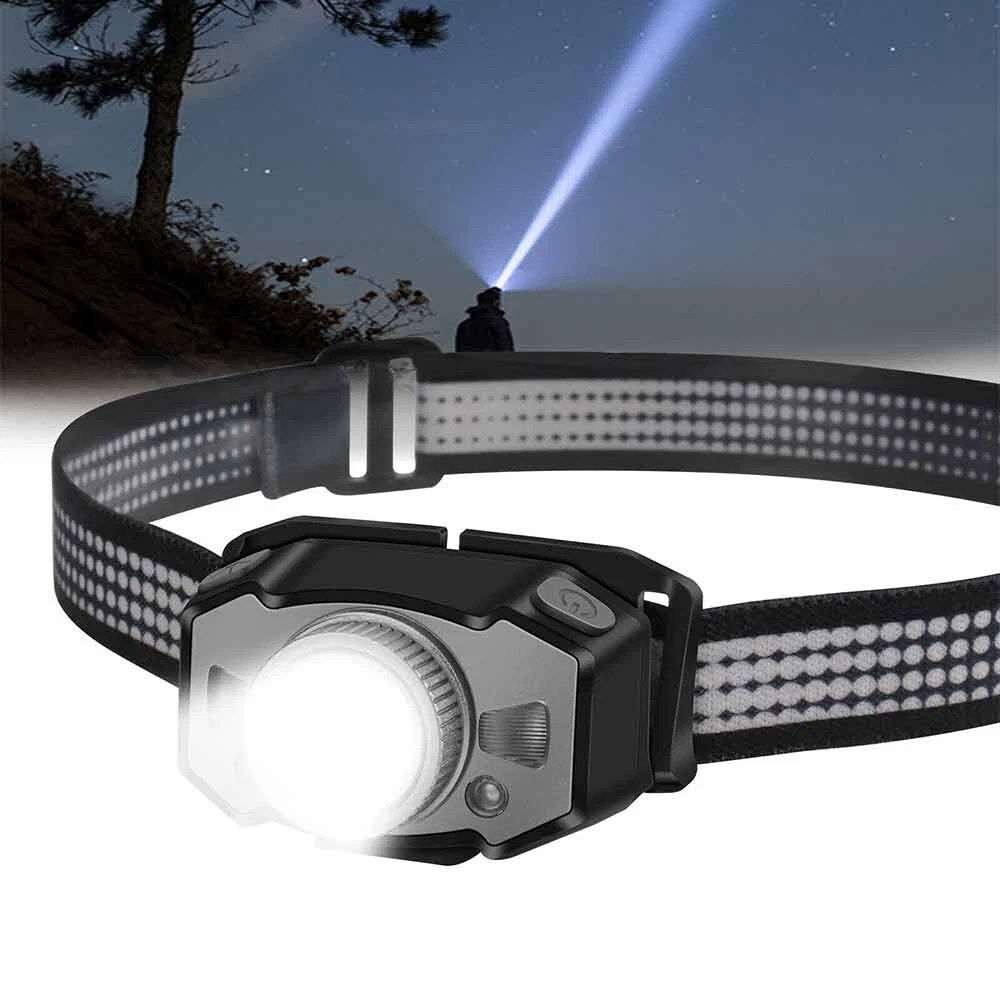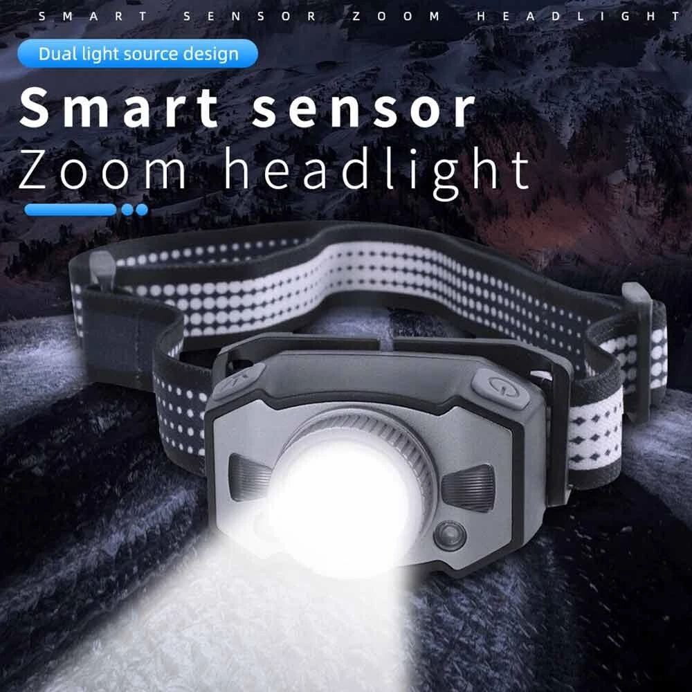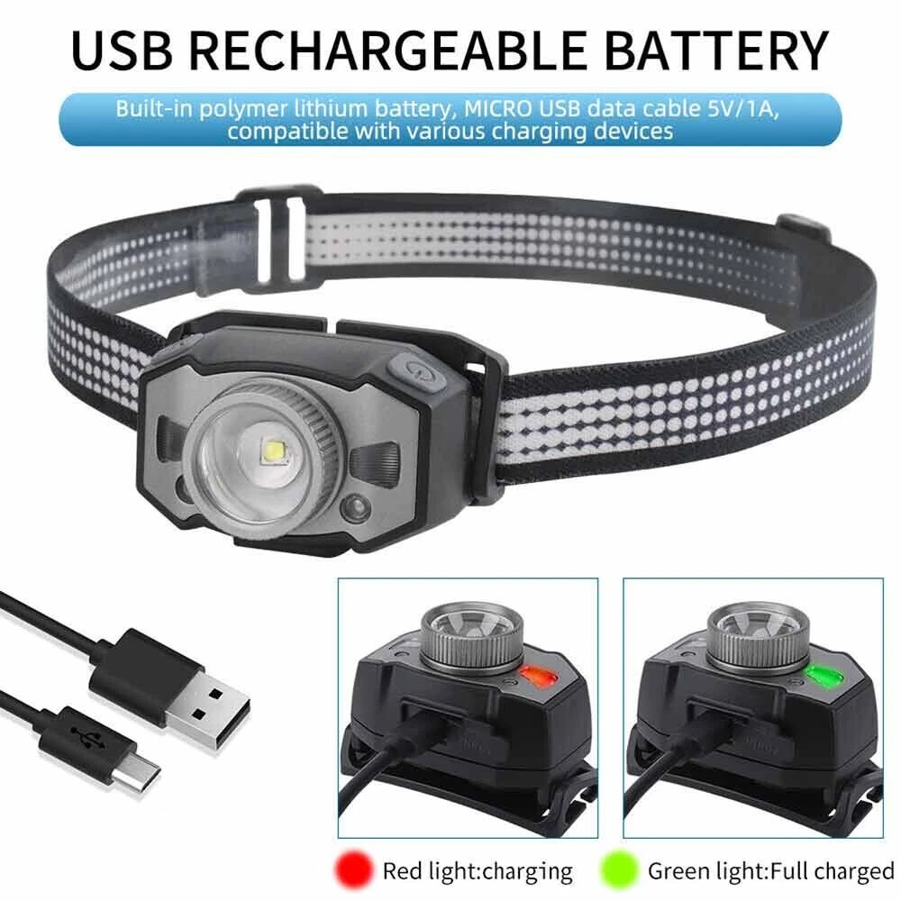 Feature: 1. 5 Light Modes: High Light--Mid Light--Low Light--Red Light--Strobe 2. Smart Wave Sensor: Just waving your hand in front of the headlamp to control it on or off ! 3. Built in 800mah battery, 4-400 hours long battery life 4. Telescopic zoom, micro usb rechargeable 5. Applicable scenes: hiking, cycling, camping, exploration, rock climbing, hunting, fishing, construction, maintenance, home, etc Specification: Product name: B33-1 focusing headlamp Material: PC+aluminum alloy Power specification: built-in polymer battery Battery capacity (MA): 800MAH Rated voltage (V): 3.7 V Static power consumption (UA): 2 Charging interface: MICRO USB Charging indicator: red when charging, green when fully charged Charging time: 3H Discharge time: strong light 4H medium light 5.5H weak light 15H red light normally bright 120H red light flickering 400H Intelligent wave sensing: wave the control switch 10CM from the lamp head Radiation distance: 72M Lens: frog eye convex lens (focus display dot) Focusing: 360 degree rotating focusing (astigmatism focus) Lamp body adjustment: adjust the irradiation direction up and down at 45 degrees Waterproof grade: IPX5 Anti falling height: 1m Applicable population: 15+ Product weight: 69g Package List: 1X Headlamp 1X USB Cable 1X Box