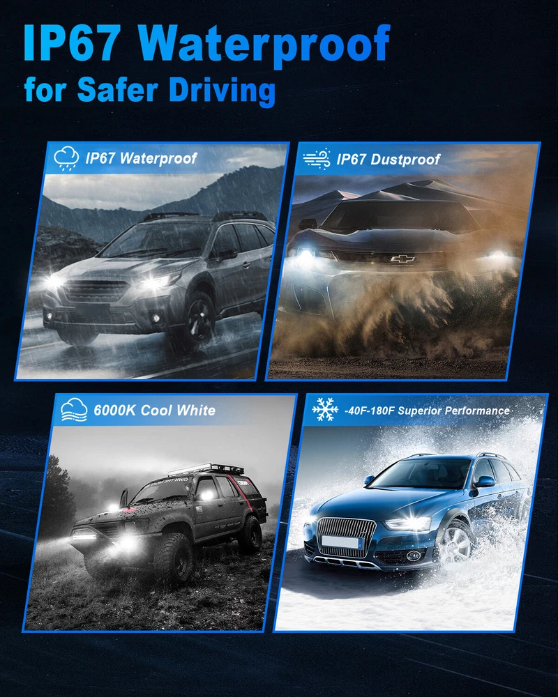 Specifications: Bulb Size : 9006/HB4 Usage : Low Beam or Fog Light Package includes : 2 Bulbs Voltage : DC 9-16V Light Power : 100W/set (50W/bulb) Luminous Flux : 36000LM/set (18000LM/bulb) Color Temperature : 6,000K Xenon White Lifespan : Over 30,000 hours Certification : IP67 Waterproof, CE, RoHS NOTICE: 1. This product is polarized, with positive (+) and negative (−) symbols on the plugs. If it doesn't work, try reversing the plug and inserting it again. 2. Our LEDs are designed to replace halogen bulbs only and will not fit vehicles with factory LEDs or HIDs. Features SUPER BRIGHT : 100W, 36000LM per pair with stronger, more concentrated light output, 600% brighter than the original halogen bulbs, allowing you to see more clearly when driving at night. OPTIMAL BEAM PATTERN : Our LEDs have the same beam pattern as the halogen bulbs with a clear cut off line, without any dark spots or shadow areas and no glare to oncoming traffic. 5 - M INUTE INSTALLATION : All-in-one design, bulid-in driver for taking up less space in housing, no bulky external driver, no extended bulb base, no more modification on housing or cover. Real plug and play, smoothly fits into vehicle's housing and factory sockets even with limited space in original housing. LONG LIFESPAN : The efficient cooling system with integral aerospace aluminum body, unique hollow engraved heat sink design and smart IC ensures a longer life for the LED conversion kit. NOTE: 1. Our LEDs replace halogen only, they don’t fit your vehicle with factory LEDs and HIDs. 2. Fitment Compatibility may not be 100% accurate, if you are not sure which bulb size you need, please check your vehicle manual or stock bulb model. 3. LED bulb is low power device, the following issues may occur if you want to use LED bulb on some European vehicles: Hyper Flashing, No Flashing, or Error Code. Those are NOT problems of LED bulb and NOT covered by warranty. You may simply add a set of load resistor (NOT included) to avoid those issues. It can be solved with a decoder (decoder must be purchased separately). Payment Shipping Return Contact us FAQ Payment 1. We gladly accepts payment via PayPal, We will ship your item(s) within 24 hours. 2. Before payment, please keep the consistency of Paypal address and ebay address. 3. Quantity orders are welcome. Shipping 1. All items will be shipped in 24 hours after receiving your payment. 2. We ship this item to US only via USPS or UPS. It usually takes 3-6 working days for delivery. Return 1. We offer a 30 days return policy. Please contact us within 30 days of receiving your order if you have any issues about the product or would like to return it. Refunds will be sent after we receive your returned package. 2. All returned items should be in the original packaging, return tracking information should be provided. 3. Buyer is responsible for return shipping cost due to the problem not caused by item quality itself . Contact us 1. We maintain high standards of excellenceand strive for 100% customer satisfaction. If you have any questions, please feel free to contact us. 2. Negative feedback won't help solve any issues, please contact us via eBay messages before leaving negative feedback. The customer service will make every effort to help you solve your issues. 3. Feedback is very important to us. We request that you contact us immediately before giving us neutral or negative feedback so that we can address your concern satisfactorily. FAQ Q1: Will this bulb fit my vehicle? A: We can match almost any vehicle to one of our bulb sizes. eBay only lets us include some vehicle fitments per listing, but if your vehicle does not show up on the compatibility table at the top of our listings, welcome you to contact us for free consulation before purchasing a product. Q2: My item has not arrived, what's taking so long? A: Sometimes items take longer than expected, especially if it’s going far or to rural area. Check with your post office to see if your item has been held up. Sometimes USPS will not update a tracking number until it has arrived at its destination. If your item still has not arrived after a few days, let us know so we can double check for you and help solve it asap. Q3: Do I need to mention the Year, Make and Model in the notes when place order? A: YES. Please include the Year, Make, and Model in the notes section during checkout to ensure you receive everything needed for your kit! Q4: My bulbs won't fit, help! A: Special bulb holder may be required. See if you can take the holder from the stock bulb. If not, let us know. The bulb size may be wrong, double check the item you received with the item you ordered. Do you have an aftermarket lighting housing? These may not be perfectly fitted for aftermarket bulbs and will require some manual modifications. Q5: Neither side lighting up? Both sides flicker, flash, or work inconsistantly. A:Check the headlight fuses, and then check the ballast plugs to insure correct installation. If this doesn't work, there may be a voltage problem with the vehicle. You probably just need a relay or capacitor (decoder must be purchased separately). Q6: WARNING ABOUT POLARITY Unlike halogen bulbs, LED are polarity sensitive. BEFORE you start your LED kit installation, verify the polarity on your vehicle by simply plugging the LED bulb into your vehicle socket. - if your light turns on, please proceed to install both bulbs onto your vehicle. - if your light DOES NOT turn on, disconnect the bulb and flip the socket in order to reverse the polarity (this will not damage your vehicle electrical system in any way). Once you made sure the LED bulb turns on, please proceed to install both bulbs onto your vehicle. Note: There is no convention when it comes to polarity. Different car manufactures have different polarity setup, even within the car model the polarity setup on your low beams and high beams might be different. On Nov 20, 2024 at 08:07:12 PST, seller added the following informati