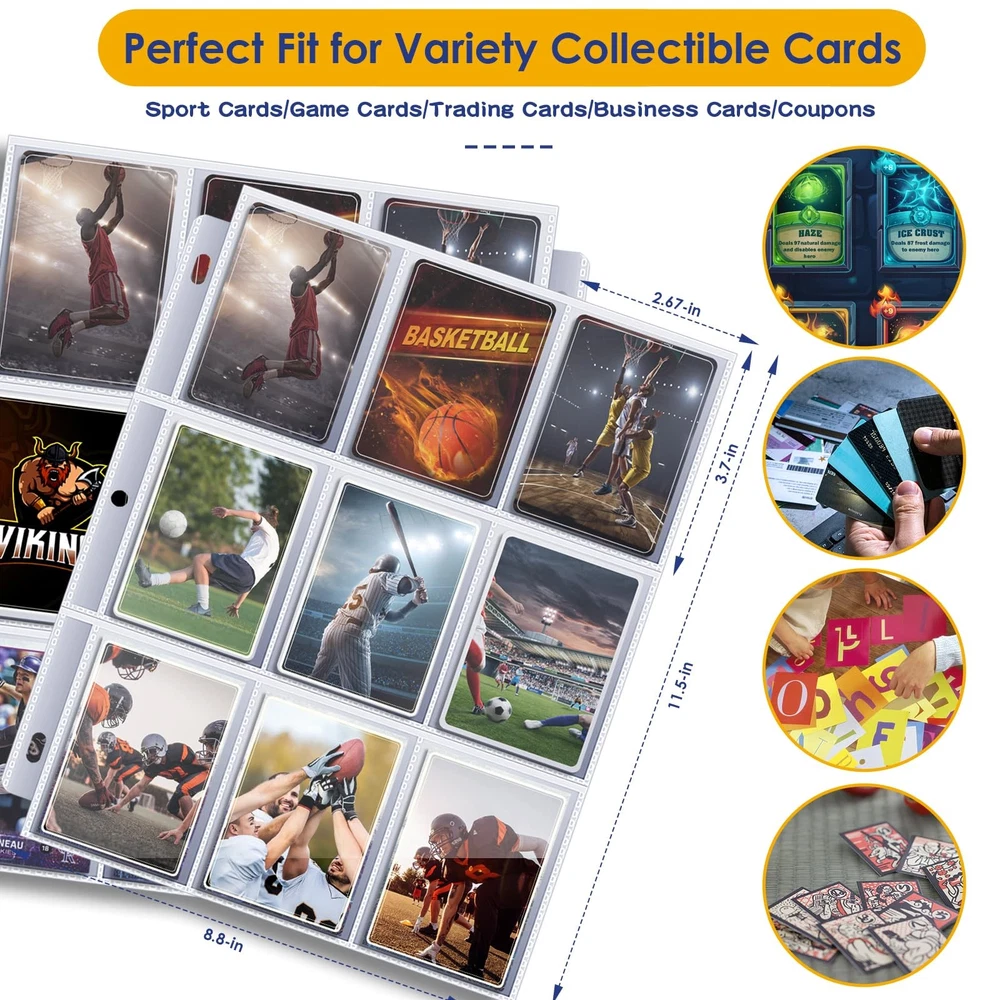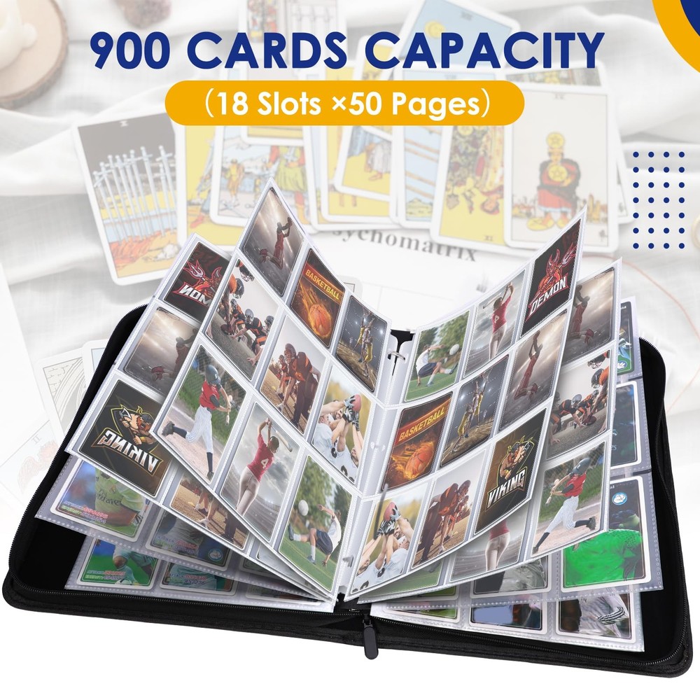 9 Pocket Trading Card Binder Package Include: One pakage including a Baseball Cards Binder with 50 durable page holding 900 cards (with 9 pockets per page) Trading Cards are NOT INCLUDED. Large Capacity Card Storage: card binder contains 50 pages of card sleeve pages, each page is double-sided, each side has 9 pockets. It providing plenty of space to get all your cards organized, great for card storage and display. Effective Protection: Made by high-density EVA foam and PU leather Material, the product thereof is waterproof and exterior is comfortable to touch and hold in hands. Equipped with easy-pulled zipper, it is portable for you to keep the card binder and prevent it from losing. Double Side Pockets: It can keep cards securely stored and easy to access, but won't slide out easily. Card Binder is convenient for inserting and removing cards frequently. Wide Application: Our Cards Binder fit for all standard sized trading cards such as, Baseball Cards, Sports Cards, Playing Cards, Top Trumps, Gaming Cards, attack cards, 3 inch photos, coupons, business cards etc.