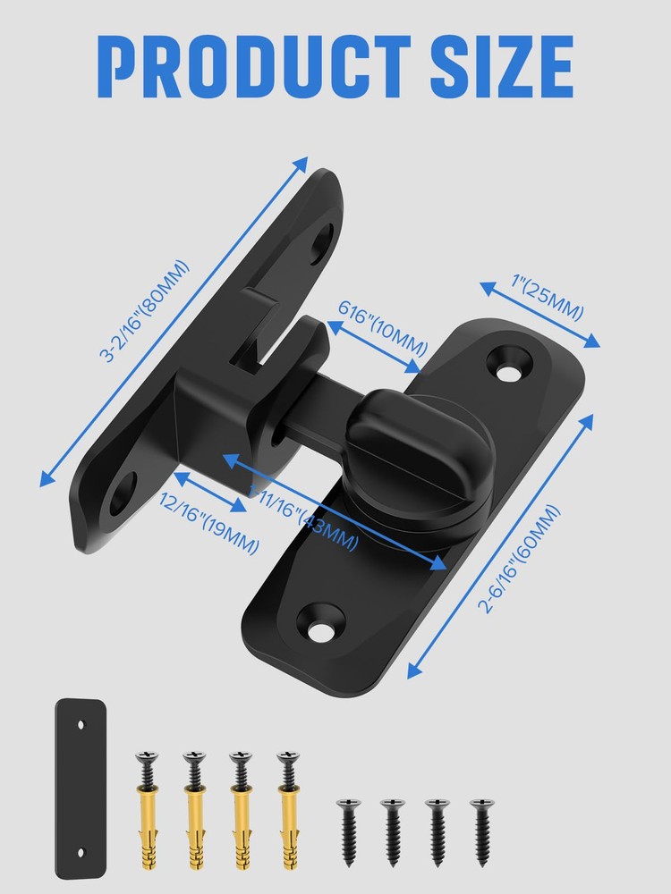 90/180 Degree Flip Barn Door Lock, Protect Privacy - Security Door Latch, Small Gate Latches Hardware for Barn, Garden, Bathroom, Cabinet, Window, Sliding Door (Black-2PCS) Upgraded 2-IN-1 Quality Door Lock: The 90/180 Degree barn door lock can be mounted at 90° right angles, also can be mounted at 180 degree angles for even more space-saving use. Ideal for family bedrooms, doors, bathrooms, gates, sheds, cabins, windows, cabinets, kitchens, offices, barn door latches and more Heavy Duty Material: The quality flip latch lock is made of zinc alloy material with multi-layer polishing technology on the surface, it is moisture-proof and anti-corrosion, will not rust and change color, to ensure safe use of a long time 2.5mm Thick Door Latch Spacer: The spacer is made of solid aluminium alloy material; Thickness: 2.5 mm; Length: 80 mm; Width: 25 mm; If the door and the frame/wall are not in the same plane, the sliding barn door locks can be installed by adding this spacer (for example, if the door gap ≤ 2.5 mm, you can add one 2.5 mm spacer; if 2.5 mm<the door gap ≤ 5 mm, you need add two 2.5 mm spacer) Quick to Install and Maintain: The barn door lock is suitable for left or right installation, and installation at an angle of 90° and 180°. Simply fit the door latch lock to your door frame, mark the height and mounting holes and mount to your door jam with the supplied screws Multi-Scene Use: door lock suitable for most door, It is suitable for bedroom, balcony, garage, window, barn, sliding door, kitchen, bathroom, cabinet, drawer, pet lock, etc. The barn door lock is a safety measure for your family, preventing unwanted entry and keeping toddlers and pets safely inside