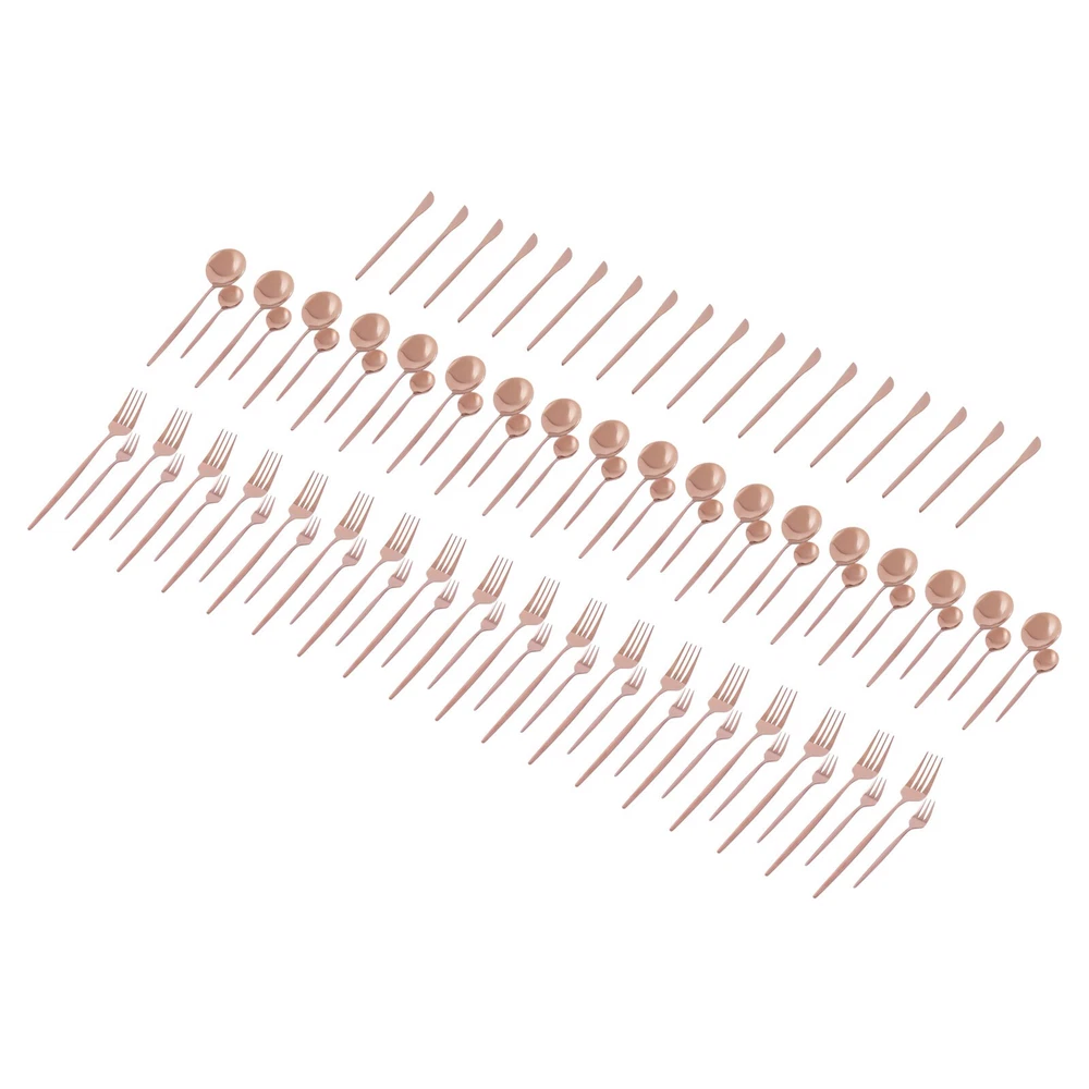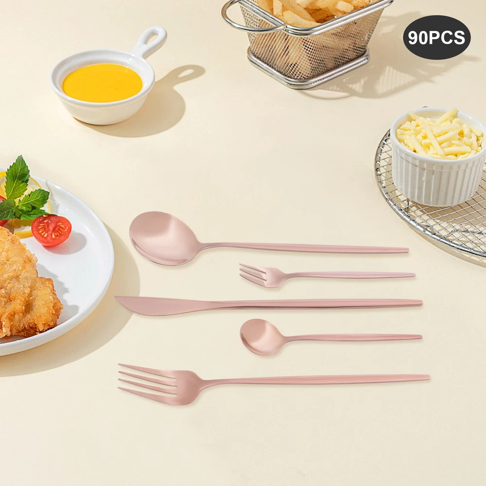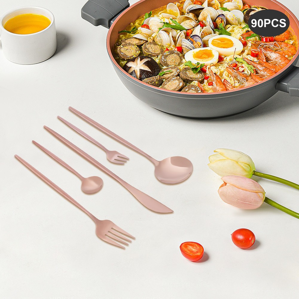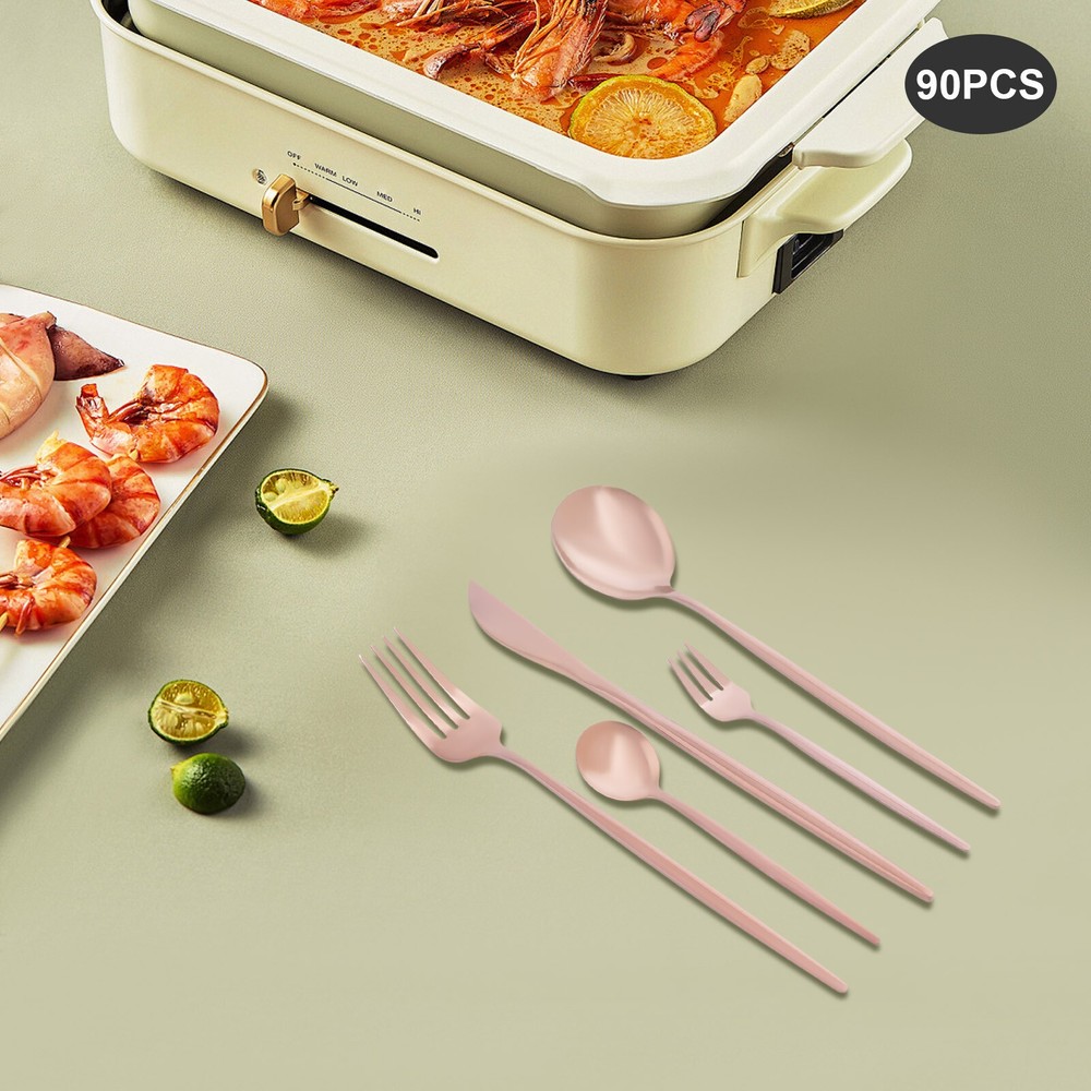 90Pcs Tableware Set for 18 Stainless Steel Flatware set Cutlery Utensil Kitchen Description Description Our cutlery set is not only designed for ultimate aesthetics but also carefully considered in terms of practicality. Each individual piece undergoes stringent quality control to ensure its durability and comfort, making it ideal for both everyday family meals and special occasion banquets. The selected materials not only ensure the safety and hygiene of the tableware but also give them a unique texture and luster, making every use a pleasure. Key Features Sturdy and Durable: It is made of high-class 410 stainless steel with a polishing treatment, which is eco-friendly, odorless, anti-corrosion, and rust-resistant , ensuring its beauty and long-time use. 90 Pieces: This set includes dinner forks, salad forks, dinner spoons, teaspoons, and knives, so you can enjoy your meal with a wide variety of cutlery. Economical and Practical: With it, you can enjoy a variety of food on the table, and the 90-piece package can also be well suited for parties or business meals, very cost-effective. Exquisite Appearance: The rose gold color with a smooth exterior makes it look generous and elegant. It will shine under the dining room lights and become the most exquisite setting on the table. Effortless Clean: Thanks to its smooth surface, simple construction, and machine-washable features, you can clean it with ease. Ready to Go : The one-piece construction allows you to use it directly after receiving it, which is very time-saving and convenient. Ideal Gift: Thanks to its practicality, it will make a fine gift for family, friends, and loved ones on Christmas, Father's Day, Mother's Day, birthdays, anniversaries, and holidays. Customer Service : We aim to provide quality products and services. If you have any problems, please feel free to contact us. We will reply and solve the problem for you as soon as possible. Details Rounded Corners: The rounded edges are burr-free , which is comfortable to touch a nd enhances the safety of use. Comfortable Handle: The curved design of the ergonomic long handle is properly weighted and balanced to ensure a comfortable grip and no fatigue from prolonged use. Sharp Dinner Knives: The table knife has a toothed edge for easy cutting of food, while the compact tip facilitates precise cutting. Rounded Spoon Head: It is widened and deepened to make it easier for you to scoop soups, cakes, creams, etc. Application It is suitable for any family gathering, party, restaurant, hotel, cafeteria, camping or wedding reception, both residential, and commercial. Specification Material: 410 Stainless Steel Color: Rose Gold Style: Modern Process: Polishing Number of Pieces: 90 Is Machine Wash Safe: Yes Dinner Knife Length: 22cm/8.66in Dinner Fork Length: 21.5cm/8.46in Dinner Spoon Length: 20.8cm/8.19in Teaspoon Length: 13.1cm/5.16in Salad Fork Length: 13.5cm/5.31in Single Dinner Knife Weight: 42g/0.0926lbs Single Dinner Fork Weight: 24g/0.053lbs Single Dinner Spoon Weight: 33g/0.0728lbs Single Teaspoon Weight: 12g/0.0265lbs Single Salad Fork Weight: 11g/0.0243lbs Packing Size: 26*15*5cm/10.24*5.9*1.97in Net Weight: 2.19kg/4.83lbs Gross Weight: 2.3kg/5.07lbs Package Included 18* Dinner Knives 18* Dinner Forks 18* Dinner Spoons 18* Teaspoons 18* Salad Forks Notes Please be careful not to scrape and wash with hard objects such as wire balls to avoid scratches on the tableware. Please note that it should not be placed in high temperature, strong acid, strong alkali, or solution soaking. After washing the utensils with water, dry them with a cloth and do not place them in a humid and corrosive environment. Please allow the slight color difference caused by the shooting light and 1-3 cm error due to manual measurement, and make sure you do not mind before ordering. Payment Delivery details Terms of sales About us Contact us Payment We accept ebay payment 。 Fees such as import duties, taxes are not included in the item price or shipping costs. These charges are the buyer's responsibility. Delivery details Shipping: 2-9 working days to: USA Terms of sales We maintain high standards of excellence and strive for hundred percent customer satisfaction. Feedback is very important to us. We hope that you contact us immediately before you give neutral or negative feedback, so that we can address your concerns. It is impossible to address issues if we do not know about them! About us Your satis faction is our ultimate goal. We work hard to earn your trust and future business. Our certified technicians have tested each item before shipping. The unit comes with 1 year limited warranty on all manufacturing defects. a) If you receive a defective item, you may return it or ask for a discount. Please contact us within 14 days after you receive the package. b) What you returned must be intact and in its original packaging as re? u. Customer is responsible for shipping costs of the returned item. c) We will cover the cost of shipping back t with the shipping rate indicated in the registration page. We will send you a new unit or refund the full payment you paid. Thank you. Contact us Business Hour Business Hour: Monday To Friday: 8:30 AM to 5:00 PM (Beijing China time) Due to time zones, our reply to your questions may not be immediately. But within above working time, we will reply your email within 24 hours. If it's non-workdays, please kindly be patient and wait till Monday. Please contact us with ebay message. Please feel free to contact us if you have any questions. Monday To Friday: 8:30 AM to 5:00 PM (Beijing China time) Due to time zones, our reply to your questions may not be immediately. But within above working time, we will reply your email within 24 hours. If it's non-workdays, please kindly be patient and wait till Monday. Please contact us with ebay message. Please feel free to contact us if you have any questions.