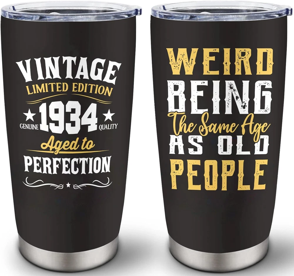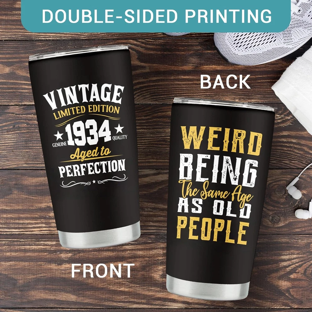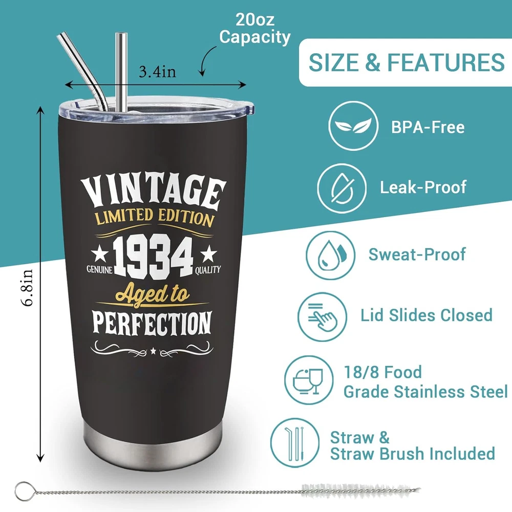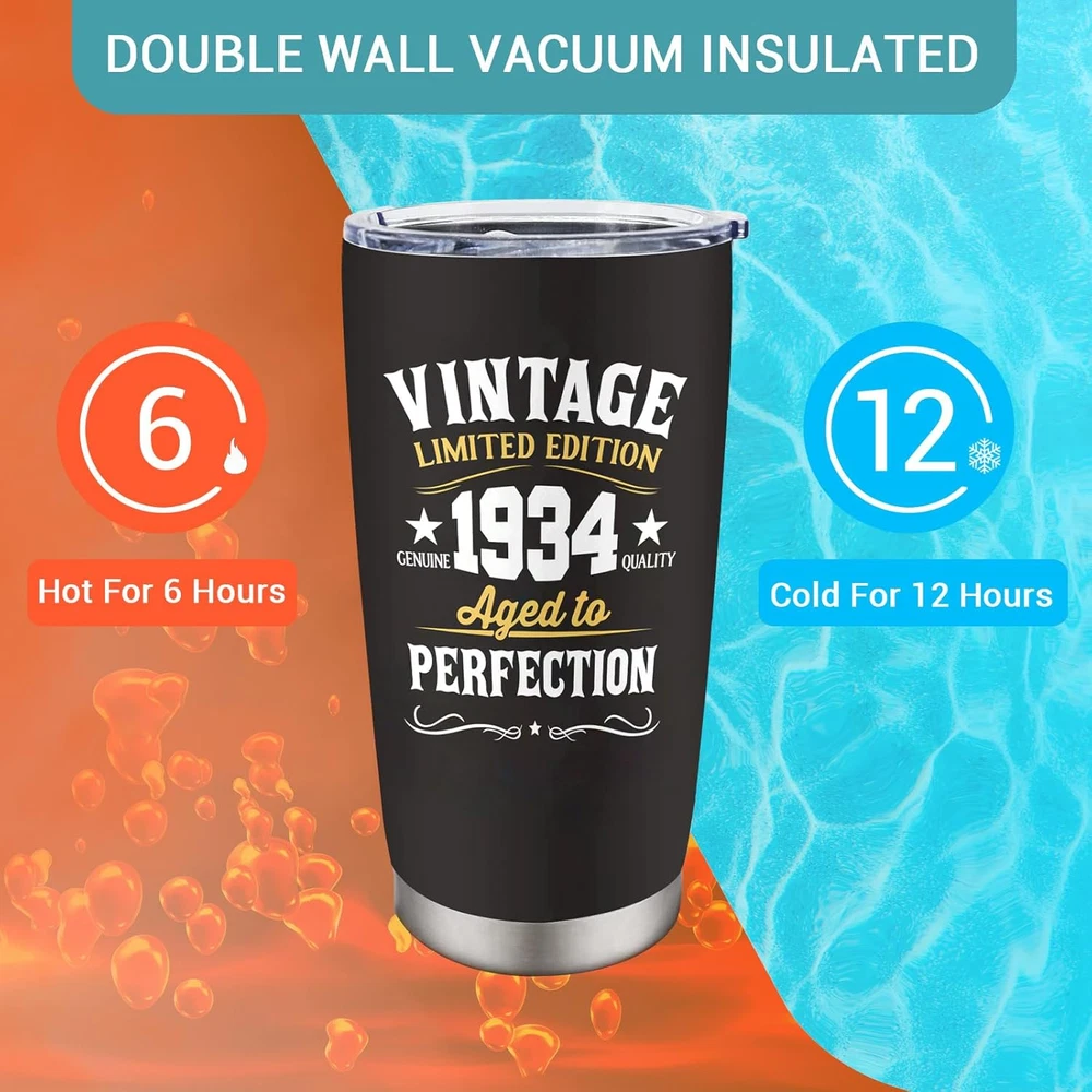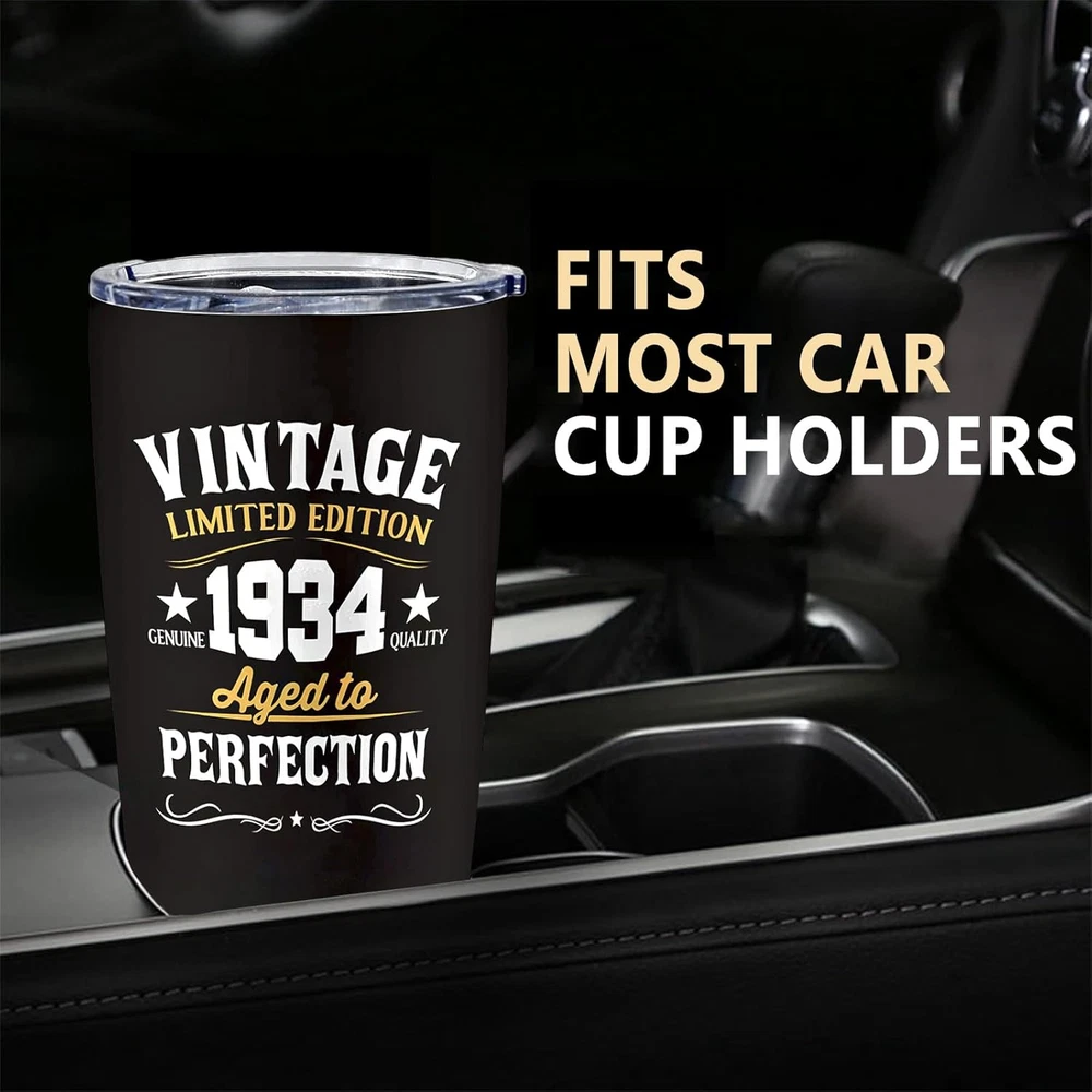 Gifts for 90th Birthday Men and Women: The 90th birthday is a day worth celebrating. This cup is very suitable for you to give to your grandpa, grandma, dad, mom, wife, or friend on this holiday. The cup uses high-quality printing technology, and the pattern and text on it will surprise him or her. Use this gift to express your love for him or her. 90th Birthday Decorations Gifts: Everyone who turns 90 deserves a satisfying gift, and this 90th-themed coffee mug is an ideal gift. Use this mug to satisfy his or her needs and create beautiful memories of this day. This gift is also suitable for decorating your life and serving as a commemoration of this day. Premium Material: Our coffee tumblers are made from premium 18/8 food-grade stainless steel, making them strong and sturdy. Its BPA-free clear lid ensures a spill-proof seal, giving you peace of mind during your use. This tumbler is an essential companion for life, guaranteeing reliability and convenience. Temperature Maintenance: With its double-wall vacuum insulation, this 20oz tumbler ensures your hot drinks stay warm for up to 6 hours and your cold drinks chilly for up to 12 hours. You can enjoy your preferred beverage at the perfect temperature, whether it's coffee, iced tea, hot water, or any other drink of choice. Convenient Coffee Cup: This mother of the bride mug fits most car cup holders, making it easy for you to carry and more stable when you drive. The design is also easy to clean and can be rinsed clean with water. The perfect birthday gift for 90th - A great birthday gift for the 90th, its leak-proof clear lid ensures no spills or messes and is perfect for use on the go. Double wall vacuum insulation keeps hot for up to 6 hours and cold for up to 12 hours. This is the best birthday idea gift for the 90th. This versatile tumbler is a fun 90th birthday gift idea that fits most car cup holders and is a must-have gift indoors and out. Show them your appreciation and wish them a great day! Versatile and practical, it is not limited to a specific environment. Whether at home enjoying your morning coffee or on the way to work, they're the perfect gift for your 90th birthday. Premium material design, the tumbler is made of 18/8 food-grade stainless steel, which is very sturdy. Suitable for indoor and outdoor use, you can enjoy your favorite drinks anytime, anywhere.