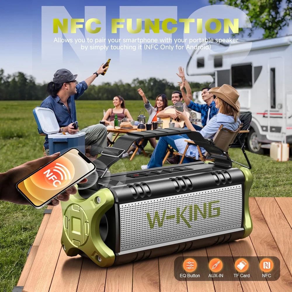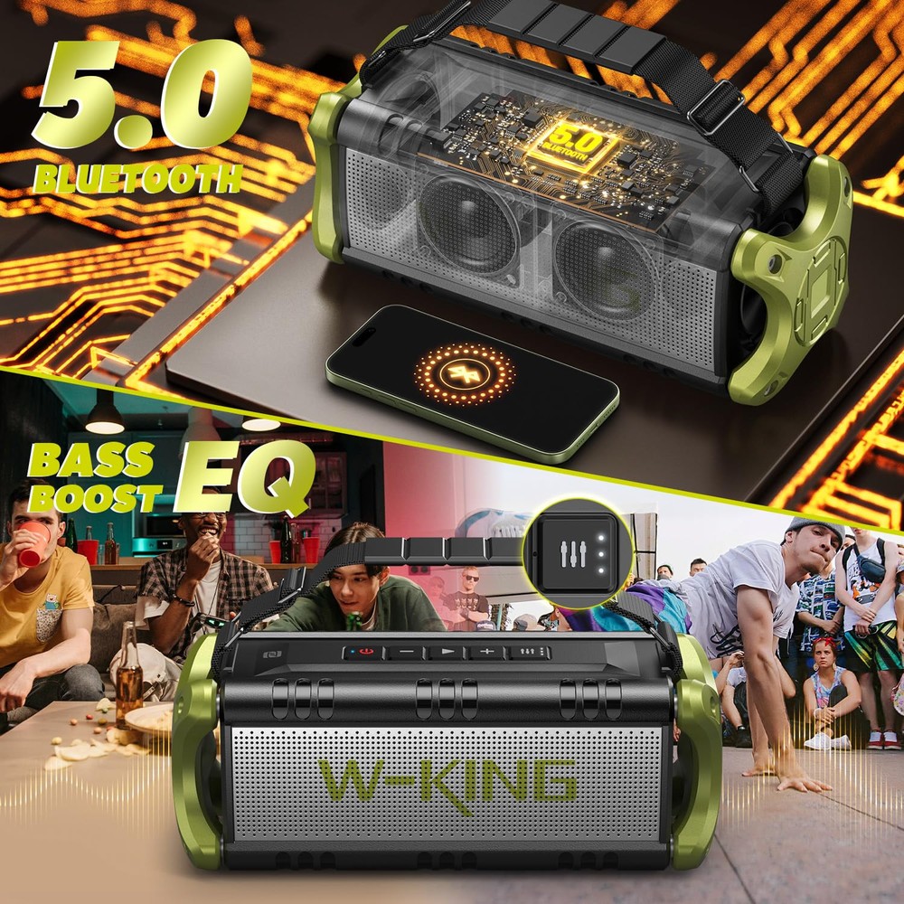 90W Max Crazy Bass: W-king D8 loud bluetooth speaker has 2 powerful subwoofers which deliver punchy and booming bass, 2 tweeters product crisp treble, 2 passive radiators extremely compress air to greatly enhances the impact of the bass. So turn on the loud bluetooth speaker to feel the power of the bass and clear vocal in every song. The loud bluetooth speaker has left and right channels. When you play songs with distinct left and right channels, this Bluetooth speaker will give you a stereo surround immersive audio experience Hi-Fi Audio and Bass Up: The Portable speaker matches an advanced DSP chip which achieves zero-distortion and reproducts orignal sound and enhances 30% bass. Let you listen to your favorite singer live as if you were there. And the portable speaker has bass EQ button, only one press to adjust your audio signal, find the right balance, and enjoy deep bass, clear mids, and crisp treble. There is no double that the portable speaker is suitable for all music genres. It is ideal for outdoor, home, party, gift 180W PEAK Super Powerful Stereo Sound: Easily pair 2 W-KING D8 bluetooth speakers wireless, upgrading 180W MAX 100W RMS stereo surround sound immediately to bring you an ultra-portable home theater experience. At this time, the two speakers form the left and right channels. Through the reflection of the surroundings, surrounds you in the sound, and gives you a super stereo surround audio experience. Take bluetooth speakers wireless for movie, party, game, gym, camping, BBQ, travel, pool party IPX6 Waterproof & 40H Playback: W-KING D8 waterproof bluetooth speaker features IPX6 waterproof and shockproof mechanical casings which are suitable for outdoor adventures. No need to worry when using by the beach, pool, on a boat, or in a shower room. With a massive rechargeable battery, a single charge gives you enough juice to 40 hours playback (lowest volum). 70% volume -13 hours. 100% volume - 5 hours. Take the waterproof bluetooth speaker to enjoy powerful bass and clear vocals for pool, beach, home, garage, wedding Power Bank & Hands-Free Calling & Adjustable strap: The outdoor bluetooth speaker large can be used as a power bank to provides the ability to charge your smart devices. The outdoor speakers is built-in microphone to provide a hands-free of your call. The outdoor speaker has a adjustable strap, allowing you to carry it with you wherever you go. And featuring air protective covers, the big speaker safeguard itself from accidental drops. The bluetooth speaker large is a ideal gift for men, women, New Year, Birthday, Holiday Supported Advanced Bluetooth 5.0/AUX/TF Card & NFC Connection: With V5.0 wireless bluetooth speaker, you can communicate with the phone assistant and never worry about sudden Bluetooth disconnection while using! Have a wireless connection range of 100ft, creating a fast and stable signal transmission. The wireless speaker support 3.5mm AUX and TF-Card. NFC connection allows you to pair your smartphone with the waterproof speaker by simply touching it (NFC Only for Android)