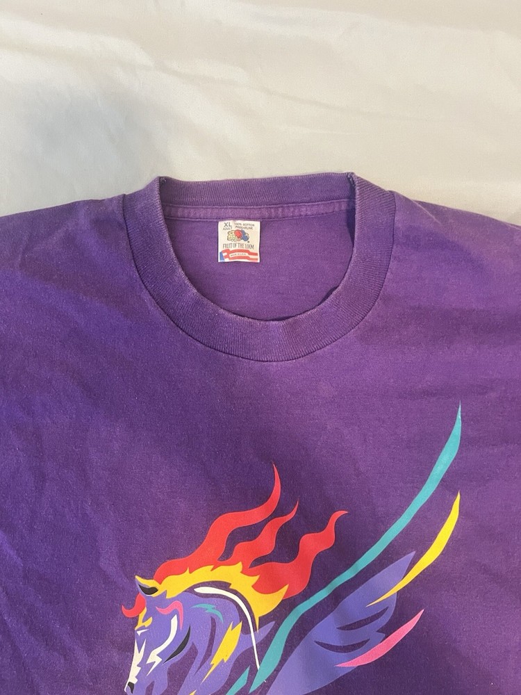 This vintage T-shirt is a must-have for any fan of the Kentucky Derby Festival. With a classic 90s theme, this regular size XL shirt features short sleeves and a single stitch design. The vibrant purple color adds a pop of fun to any outfit, while the Stitch character adds a touch of nostalgia. Perfect for any casual occasion, this T-shirt is a unique addition to any wardrobe.
