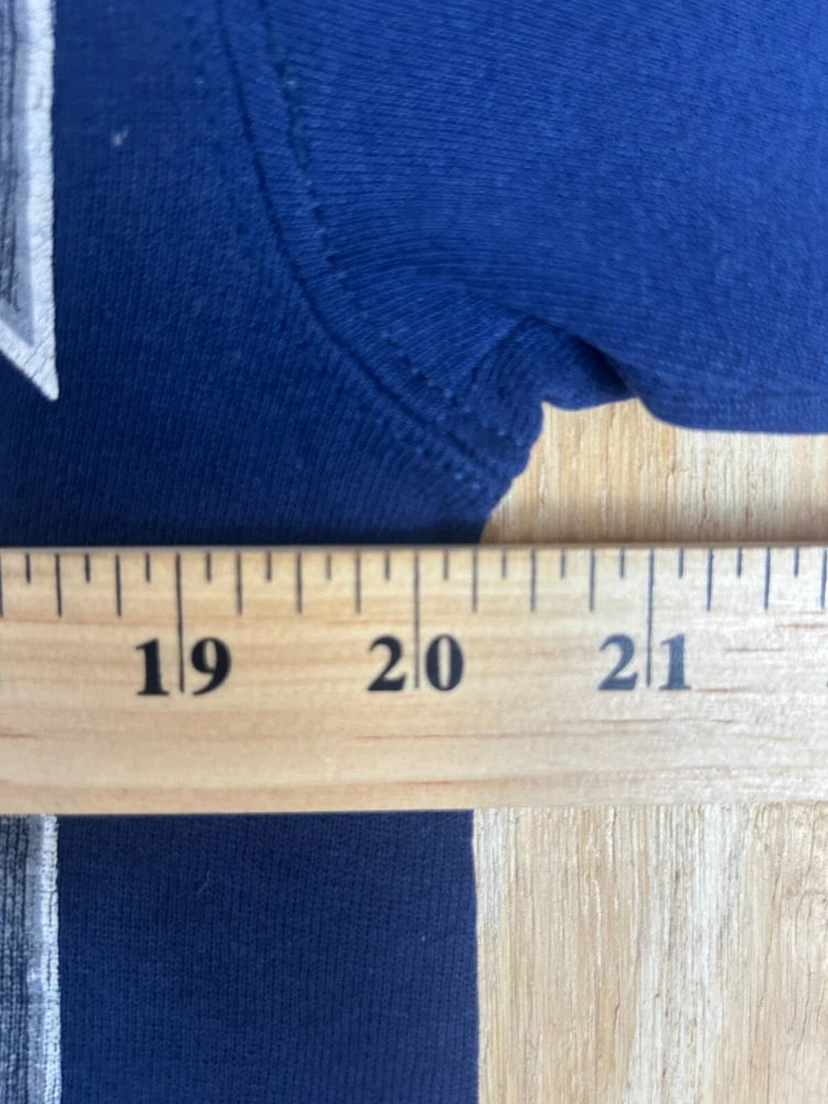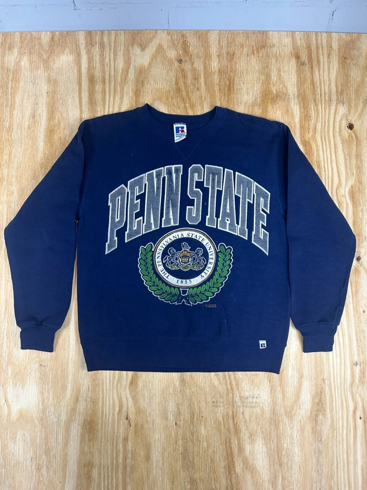 This vintage Russell Athletic sweatshirt is a must-have for any Penn State fan. The blue cotton blend material is comfortable and machine washable, making it perfect for any season. The pullover style features a crew neck and long sleeves, with a solid pattern and graphic print of the Penn State logo. This sweatshirt is a size medium and has a regular fit, with no personalization. It's suitable for various activities, including gym training, walking, and football. The sweatshirt is a 90s vintage item, perfect for those who love University and College themes. It's made in the United States and is a great addition to any wardrobe. SKU: 15003