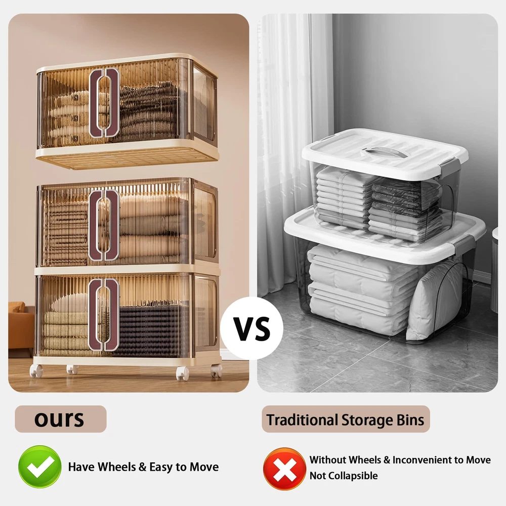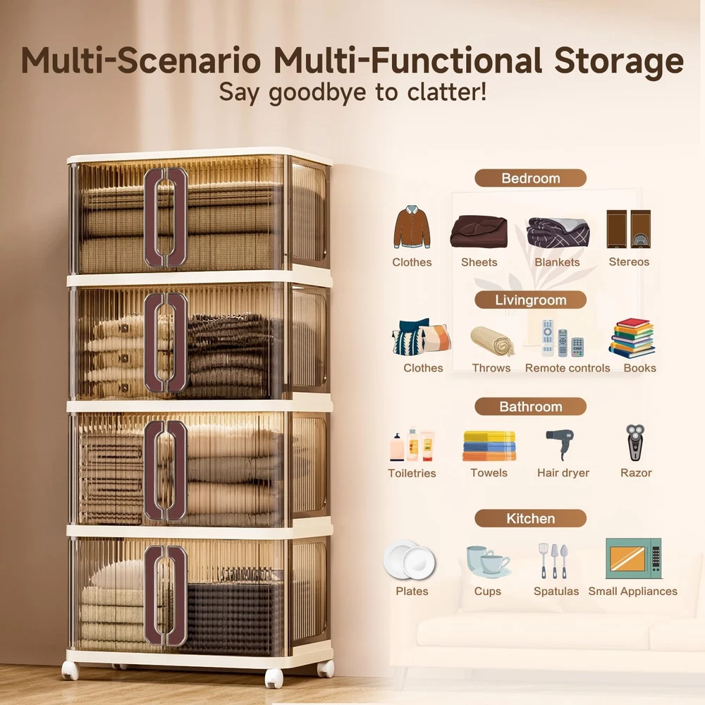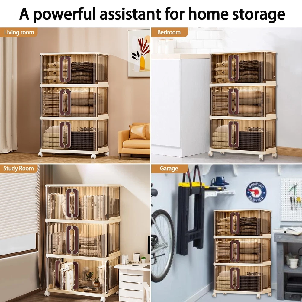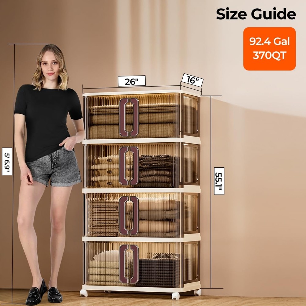collapsible bin extra large storage bins with lids plastic cabinet storage big storage bins for dorm home craft storage closer organizers and storage outdoor towel storage small space storage dorm supplies storage 4 Tiers Large Capacity&Small Space:Stackable Storage Bins measure 26" in length and 16" in width, designed for boasting a small footprint but maximize space efficiency by 55.1" height. And 3-pack stackable cabinet provide up to92.4 Gal/370Q large capacity, perfect for everyday items likes clothes, small appliances, crafts, yarn, and other household items. Whether in the living room, bedroom, office, or indoor garage, these storage bin are essential for creating a tidy space! Stackable&Foldable: This plastic storage cabinet requires no tools for assembly—just stack one on top of the other less than 3 minutes! With 4 upgraded reinforced latches are located at each top to ensure studiness stack, hidden and more stable secure when tilted or moved, ensuring maximum safety during use. When not in use, simply disassemble and fold the bins flat. They’ll fit easily under the bed or in the trunk, saving valuable space.(Each items comes with only one lids for top cover) Easy-Access Sliding Door: Built with upgraded sliding door design make access more convenient than traditional Front open stackable storage bins. Just one hand can pulls away to the left and right to open and close. When opened, the door slides back and hides behind, saving storage space both horizontally and vertically. And the top and bottom with lack for safe use. The top bins can open to access the large item. 360° Flexible Mobility: Equipped with durable casters, these wheeled storage containers moved smoothly—making it easy to move them around for versatile use or to clean the floor, even when fully loaded. Simply press down the clips to lock 2 of the casters, keeping the unit stable. For long-term fixed placement, the casters can be detached. Exquisite Craftsmanship: Our stackable storage bins offer excellent load capacity and long-lasting durability, thanks to thick, high-density PP material, and safely hold various household items. Designed with French-style sliding doors that elevate room decor, they also feature hidden top latches that add a premium touch—keeping the look neat and modern. Blending function with elegance, these bins redefine contemporary home storage.