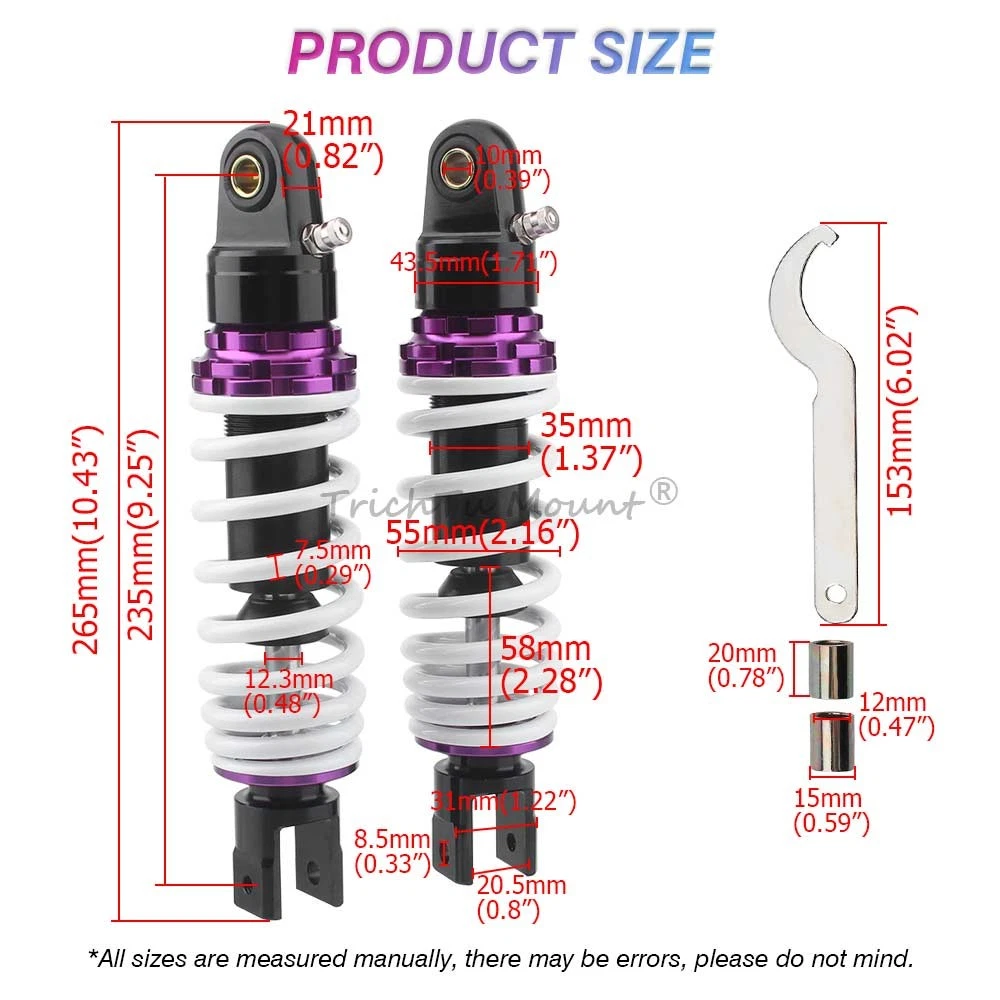 You may also like Chrome Adjustable Handlebar Risers Adapter For Honda Goldwing 1800 GL1800 01-17 19.95 USD 21.0 USD Free shipping 5% off Black Handlebar Adjustable Clamp Risers Adapter For Honda Goldwing GL1800 01-15 22.8 USD 24.0 USD Free shipping 5% off Universal 17"x16" Smoke Windshield For Harley Honda 7/8" 1" Handlebar Motorcycle 59.13 USD 62.24 USD Free shipping 5% off Motorcycle Rider Backrest Organizer Bag for Harley 09+ Honda GL1800 Spyder RT 22.5 USD 23.68 USD Free shipping 5% off For Honda XL100 XL125 XL185 TL125 Rear Air Shock Absorber Suspension 2PCS 400mm 74.98 USD 78.93 USD Free shipping 5% off For Honda VTX 1300 1800 GL1800 For Yamaha XVS650 XV1900 Chrome Front Fender Trim 15.57 USD 16.39 USD Free shipping 5% off Universal 17"x16" Clear Windshield For Harley Honda 7/8" 1" Handlebar Motorcycle 59.89 USD 63.04 USD Free shipping 5% off For Honda Goldwing GL1800 2001-11 Chrome Turn Signal Light Decoration Trim Cover 17.25 USD 18.16 USD Free shipping 5% off Chrome Front Fender Decoration Fairing Tip Accent Trim For Honda Goldwing GL1800 14.33 USD 15.08 USD Free shipping 5% off Adjustable Rear Shock Absorbers Suspension 14" 330mm Universal For Honda Suzuki 128.99 USD 135.78 USD Free shipping 5% off Universal Motorcycle Headlight Fairing Windshield Windscreen 5-7'' Fit For Honda 21.98 USD 23.14 USD Free shipping 5% off 3 Holes Windshield Windscreen Clear For Honda Gold Wing Audio / Comfort GL1800HP 139.98 USD 147.35 USD Free shipping 5% off Product Description Description: Material: high quality Solid Steel+Aluminium Alloy Color: Black + purple + White Total Length: 265mm (10.43 inch) Length of Eye to Eye Core: 235mm(9.25 inch) Eye Diameter Top: available 10mm, 12mm Eye Diameter Bottom: M8 threaded hole and 8.5mm hole Eye Width : 21mm Clevis-Width: 21mm Spring thickness: 7mm Spring Width: 58mm Nitrogen Pre-filled Working stroke: 40mm Max loading: 150kgs(330LBS)/1pcs Feature: High-performance air shock absorber: The suspension provides smoother driving and better overall damping management, provides excellent rearg performance even when fully loaded with luggage,improving driving comfort, motorcycle handling and driving safety. Adjustable spring preload. wrench tool is included for easy adjustment. Highpressure nitrogen shock absorbers are safer, more comfortable and have stable performance. The difference between nitrogen shock absorbers and ordinary shock absorbers is that nitrogen shock absorbers are more stable in driving because nitrogen is more thermally stable than air. The heat-dissipating aluminum tube reduces heat avalanche (cavitation) from the sliding motion of the damping force, resulting in continuous and stable performance. Fitment: Universal fit for the MODELS that length of eye center to eye center 235mm,Eye Diameter 10mm,12mm,and Bottom is U-style,Eye Width 21mm Such as compatible with HONDA YAMAHA ,JOG 3KJ dio50 60 90 100: Fit For HONDA DIO Fit For HONDA DIO CESTA Fit For HONDA Byte Fit For HONDA SMART DIO Fit For HONDA SMART DIODX Fit For HONDA SMART DIOZ Fit For HONDA TACT Fit For HONDA TACTS Fit For HONDA DJ1-RR Fit For HONDA ZOOMER Fit For HONDA TODAY Fit For HONDA DIO Fit For YAMAHA CHAMP Fit For YAMAHA JOG-Z Fit For YAMAHA JOG Fit For YAMAHA JOG Sports Fit For YAMAHA Vino Fit For YAMAHA VOX Fit For YAMAHA AXIS50 Fit For YAMAHA SUPER JOG ZR Fit For YAMAHA APRIO Type 2 Fit For YAMAHA APRIO Fit For YAMAHA APRIOEX Fit For YAMAHA JOG Z II Fit For YAMAHA JOG [3YJ] Fit For YAMAHA SUPER JOG Z Fit For YAMAHA JOG-Z EX Fit For YAMAHA AXIS90 Fit For YAMAHA JOG90 Fit For YAMAHA JOG C Fit For YAMAHA JOG-Z II Fit For YAMAHA BJ Fit For YAMAHA GRAND AXIS Fit For SUZUKI LETS Fit For SUZUKI VERDE please make sure it suits your model before purchase Package Included:A set of shock absorbers About Us Stagparts888 is a professional Motorcycle parts retailer committed to becoming the most loved and trusted seller on eBay. We focus on eBay Motor with various products in motorcycle parts. We are pursuing the goals by offering a best shopping experience and excellent customer service. We've dedicated ourselves to making sure that everyone enjoys shopping from us, and are so proud of working passionately to exceed your expectations when you shop with us. Wholesale purchase & large amount, you can leave me message to get the best price. We have our own factory, offer the modification, customized product service and factory price to you. if you have any problems or questions, please feel free to contact us. It's our great pleasure to serve you. Payment We only accept PayPal payments, and we only ship to the PayPal address. Please make sure your detail address and full name in PayPal is absolutely correct. If you participate in the auction, please complete the payment within 7 days after the auction ends. If you don't have a PayPal account, we recommend registering for one or asking a friend to assist with the payment. Shipping We will ship your order within 1-3 business day after receiving your verified payment (Excluding Weekends and Public Holidays).To ensure orders can be delivered to you without any problem, your complete and correct physical shipping address should be provided when you place an order. We ship to USA Lower 48 States Only. The estimated delivery time is within 3-7 working days (not including the weekend).We do not ship to FPO, APO or PO Box , Alaska, Hawaii, Puerto Rico addresses. International Buyers – Please Note: Import duties, taxes, and charges are not included in the item price or shipping cost. These charges are the buyer's responsibility. Please check with your country's customs office to determine what these additional costs will be prior to bidding or buying. Since this is an international shipment, the shipping time will depend on the logistics company and local customers or tariffs. Thank you for your understanding. International Shipping Time: USA, UK, Canada and Australia need around 8-15 business days(Excluding weekend and Holidays).Other countri
