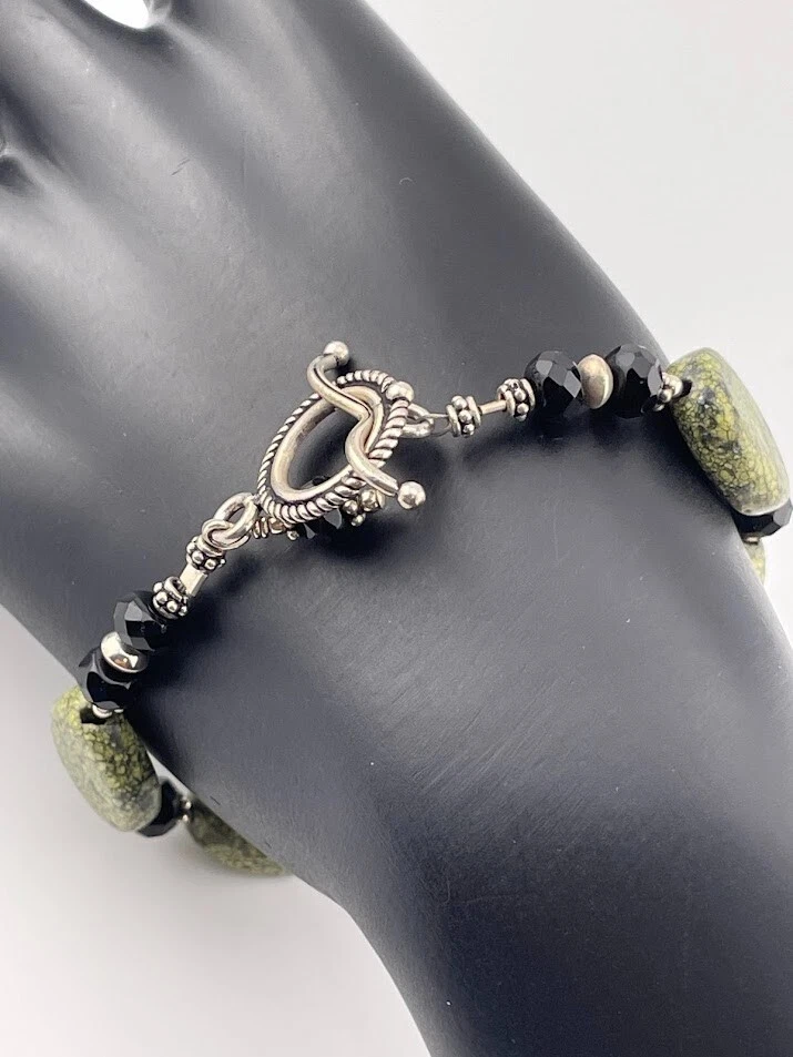 925 STERLING SILVER GREEN SERPENTINE ONYX BRACELET 7.5" BALI STYLE SOUTHWEST 544 UNMARKED BUT TESTED ****************************** Thank you for your interest in our jewelry. We?d like to introduce ourselves. We are just a retired couple who love matching our customers with great jewelry. We?re not professional jewelers. To have the best shopping experience we like to recommend the following: Please measure your hand, wrist, finger or neck to ensure the best fit. We can use your measurements to help with sizing. Please ask all the questions you want. We know some stuff and, if we don?t, we?ll do the research. We like to learn too. More Stuff: If an item is described as ?gold over 925 sterling silver? this means it is gold vermeil. Vermeil is the process by which a layer of gold (usually 14k or 18k) is bonded to sterling silver. We only clean with gentle soap and warm water to avoid damage. The items we sell may be new or pre-owned and may have normal wear, slight damage, and/or tarnish. We make every effort to ensure the items we sell are as described. This includes testing to confirm metal purity if the item isn?t marked, and testing for gemstone identity. We try to put measurements in the jewelry description and include a photo of each piece with a U.S. quarter (25mm).