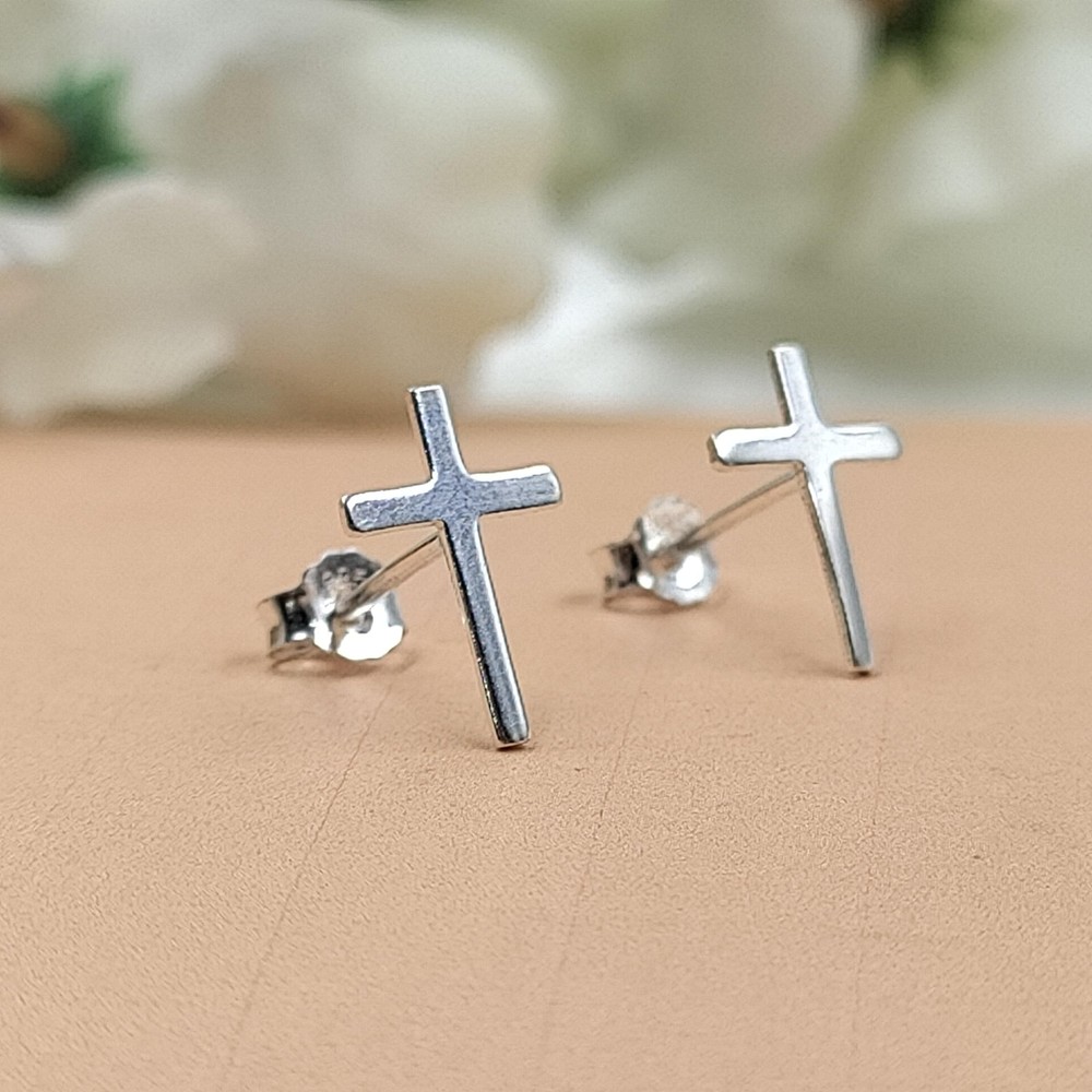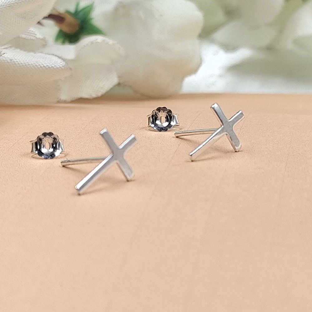 925 Silver Cross Flathead Earrings Spiritual Baptism Gift Stud 5x7.5mm