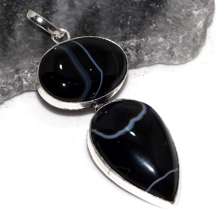925 Silver Plated Banded Black Onyx Jewellery Pendant Handmade Size 2.5" JW