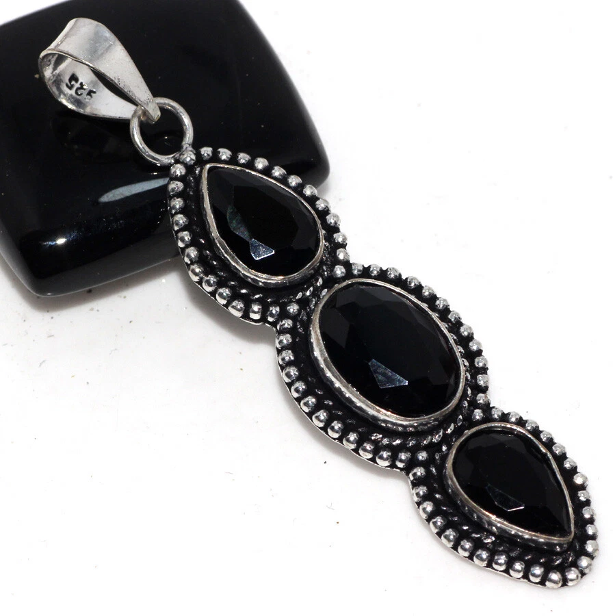 925 Silver Plated Black Onyx Ethnic Long Pendant Handmade Jewelry Size 2.5" JW