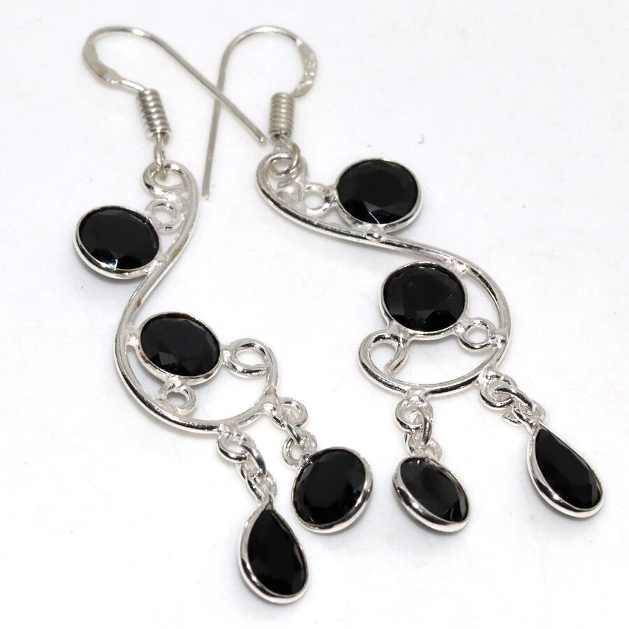 925 Silver Plated Black Onyx Faceted Long Earrings Jewelry Size 2.3" JW
