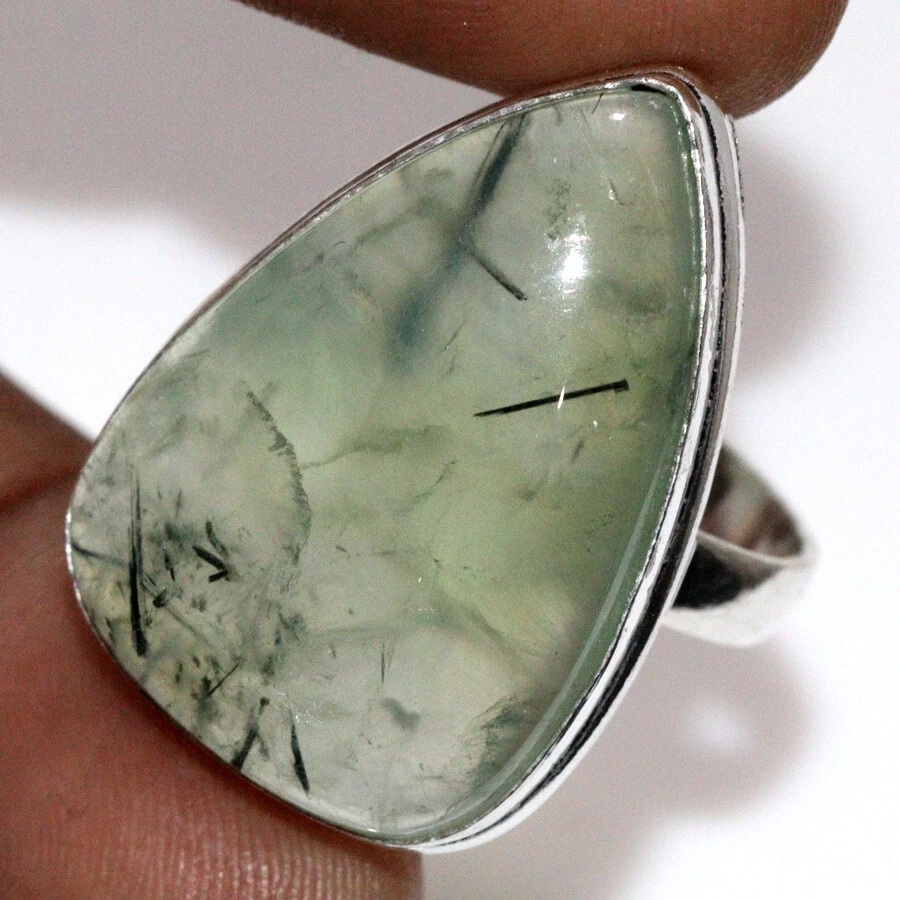925 Silver Plated Moss Prehnite Ethnic Ring Handmade Jewelry Size US 9 JW