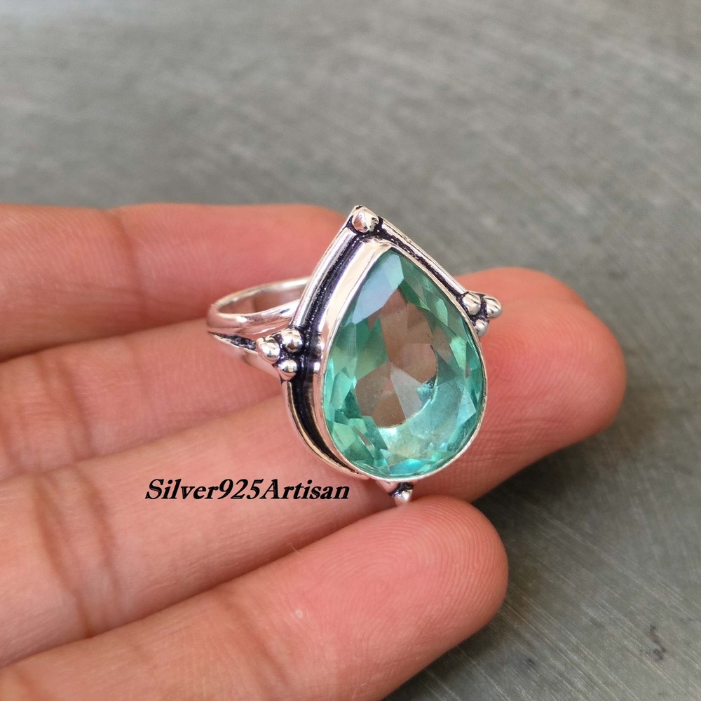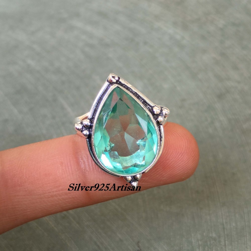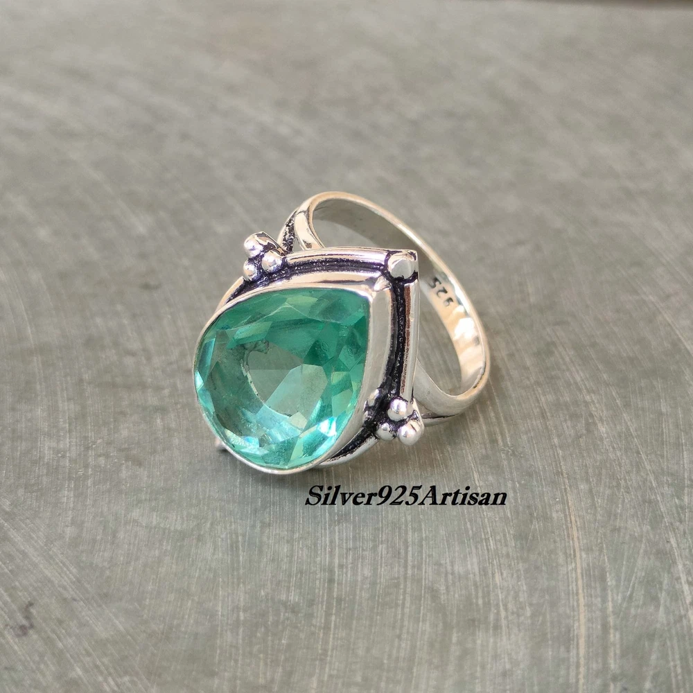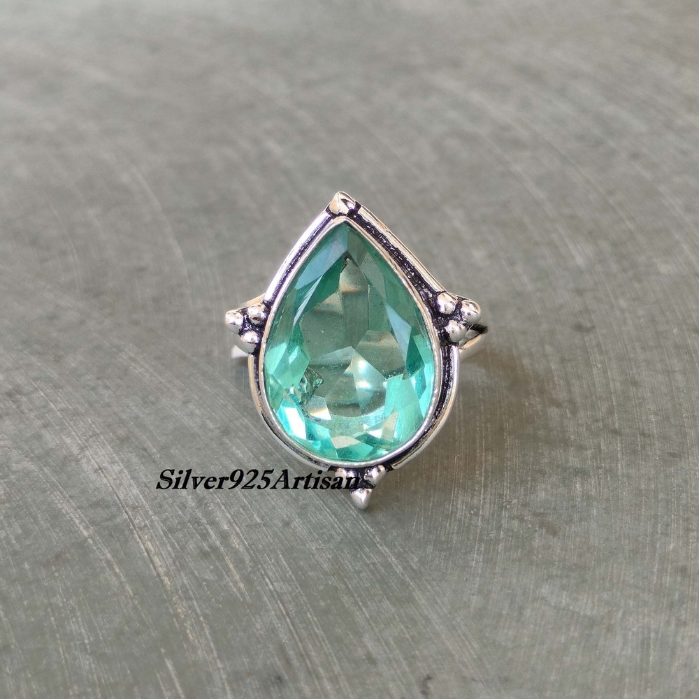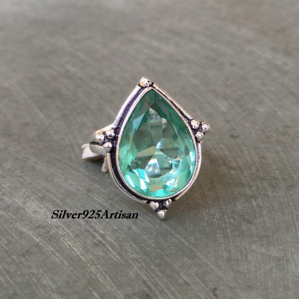 925 Sterling Silver Aquamarine Teardrop Designer Handmade Women's Ring AK4085 This 925 Sterling Silver Aquamarine Teardrop Designer Handmade Women's Ring is a beautiful and elegant piece of jewelry perfect for various occasions such as Mother's Day, weddings, anniversaries, birthdays, and Valentine's Day. The aquamarine stone, with a pear shape and blue color, adds a touch of beauty to the ring. Handmade with excellent craftsmanship, this ring is stackable and has a bezel setting style. The metal purity is 925 sterling silver, and it comes with a seller warranty. Made in India, this ring is a unique and exquisite piece that adds a touch of nature, luck, and bohemian style to any outfit.