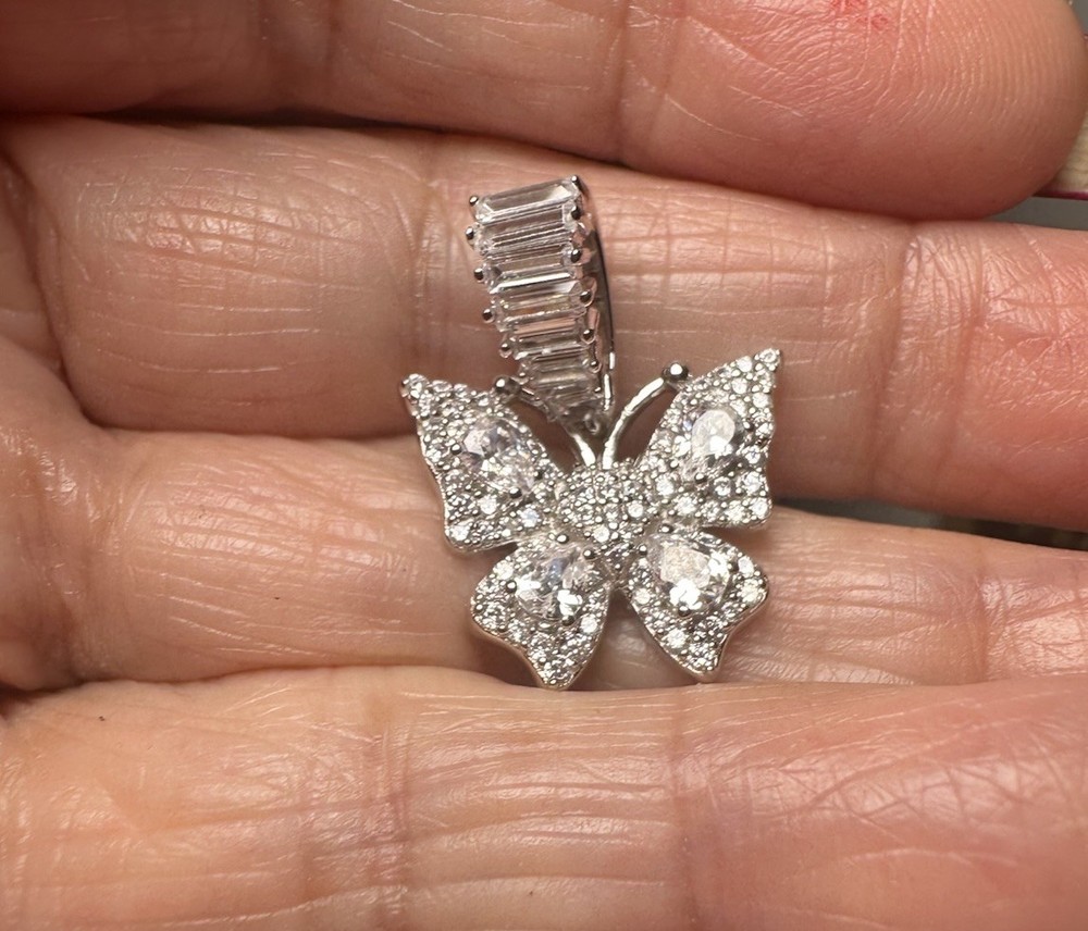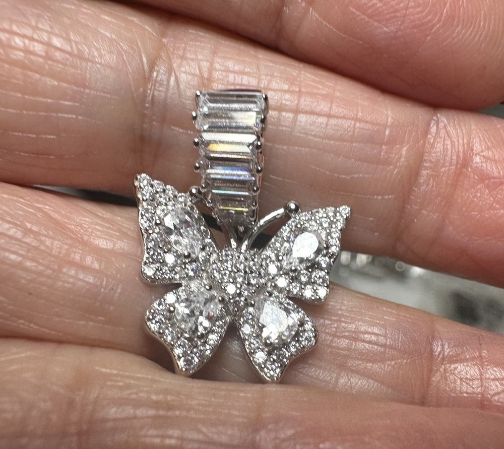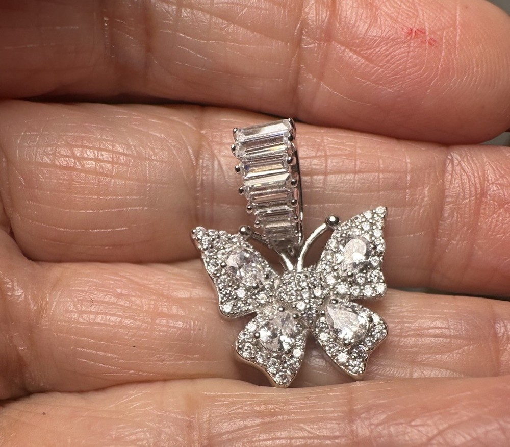This stunning pendant is perfect for any occasion. This butterfly pendant features sparkling cubic zirconia stones and delicate bagettes on the hanging area. The pendant is made of 925 sterling silver and is designed to last. This piece is perfect for those who love butterflies and want to add a touch of elegance to their outfit.