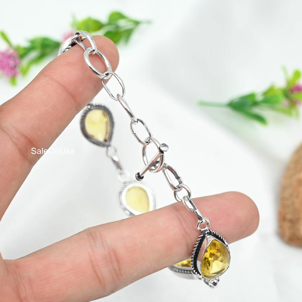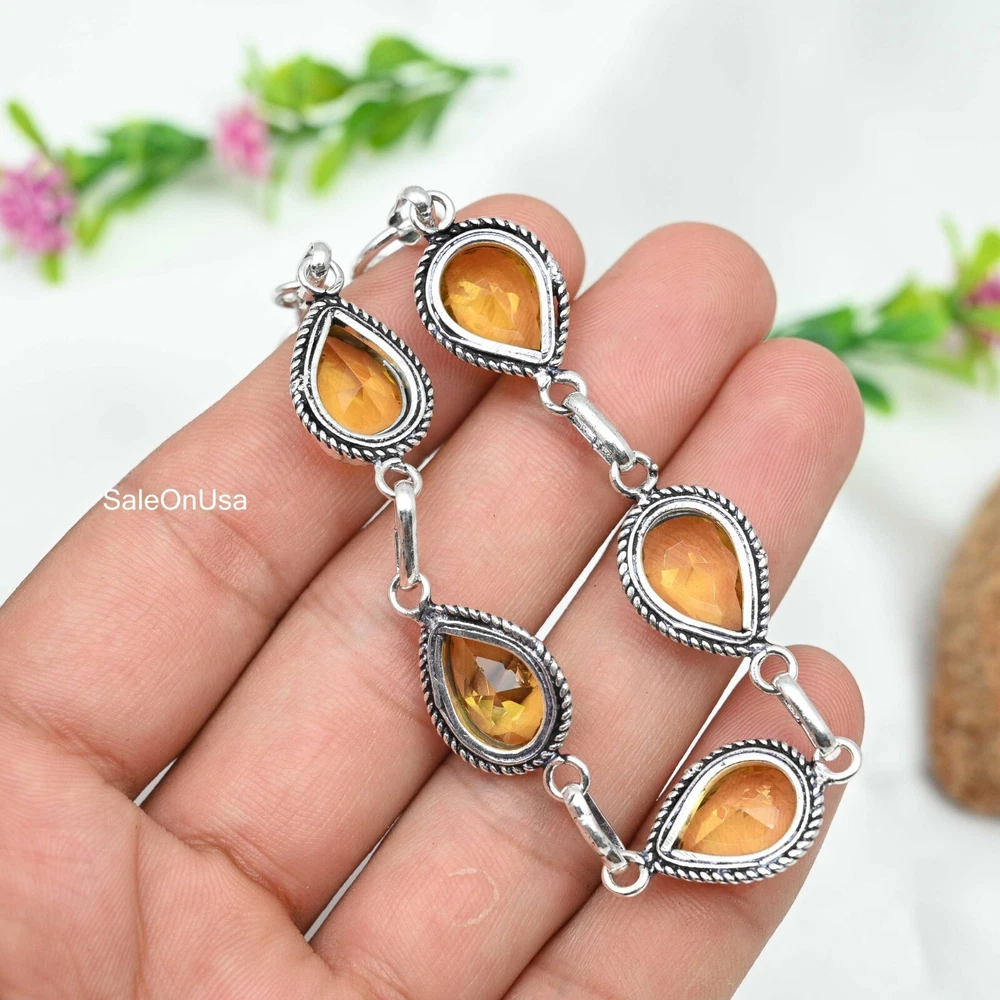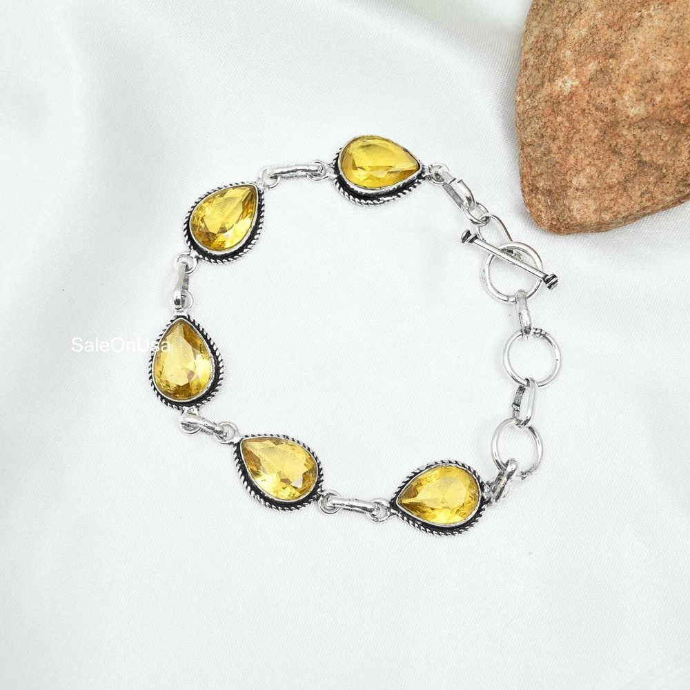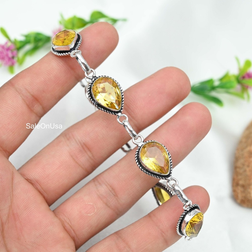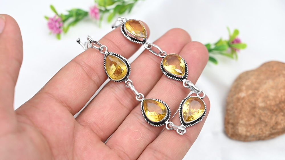 Main Stone Color:YellowMetal Purity:925Main Stone Width:N/AOccasion:Anniversary, Birthday, Christmas, Engagement, Mother's Day, Valentine's Day, WeddingMain Stone Shape:PearClosure:ToggleMain Stone Depth:N/ABrand:HandmadeNumber of Diamonds:N/AType:BraceletCollection:HandmadeTotal Carat Weight:10 carat and aboveSetting Style:BezelChain Type:N/ATheme:Beauty, Bohemian, Ethnic, Halloween, LoveDiamond Clarity Grade:N/AMain Stone Creation:Lab-CreatedNumber of Gemstones:5Main Stone Treatment:Not EnhancedColor:SilverStyle:ChainMain Stone:CitrineSecondary Stone:CitrineCharm Type:Same As PictureMaterial:GemstoneFeatures:AdjustableCountry/Region of Manufacture:IndiaBase Metal:Sterling SilverMain Stone Length:N/AItem Length:8 inches with Adjustable ChainCountry of Origin:IndiaMetal:Sterling SilverShape:Same As PictureCut Grade:ExcellentCertification:N/ADiamond Color Grade:N/AColored Diamond Intensity:N/A