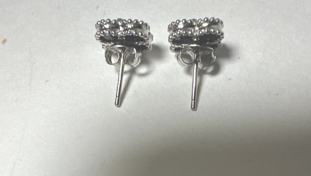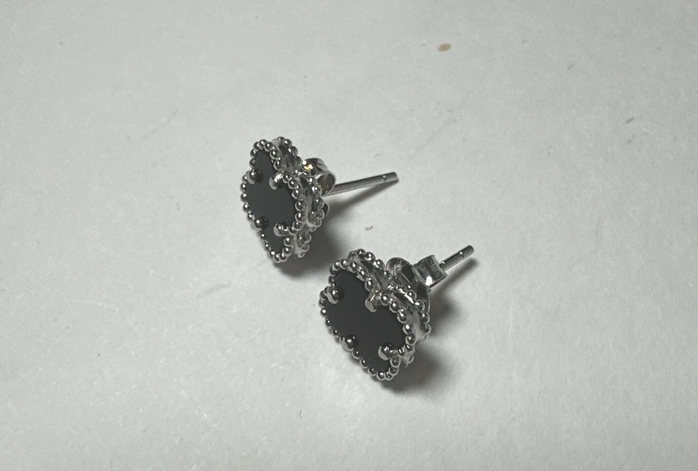 These are small 925 Sterling Silver Clover Stud Earrings with a butterfly closure. The earrings are black in color and have a stylish stud design. Earrings are size small which are a little bigger than the mini clover.