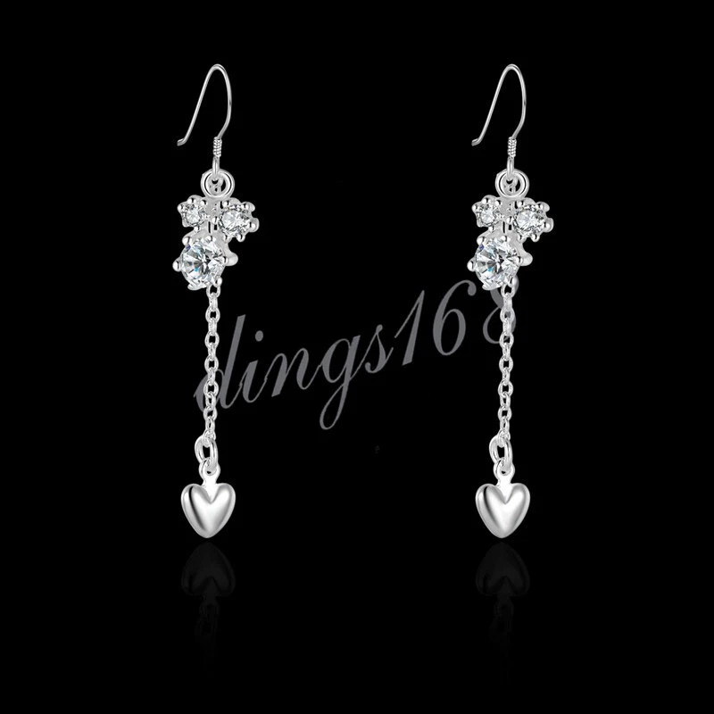 925 Sterling Silver Hypoallergenic Crystal 2"Threader Heart Dangle Earrings H686