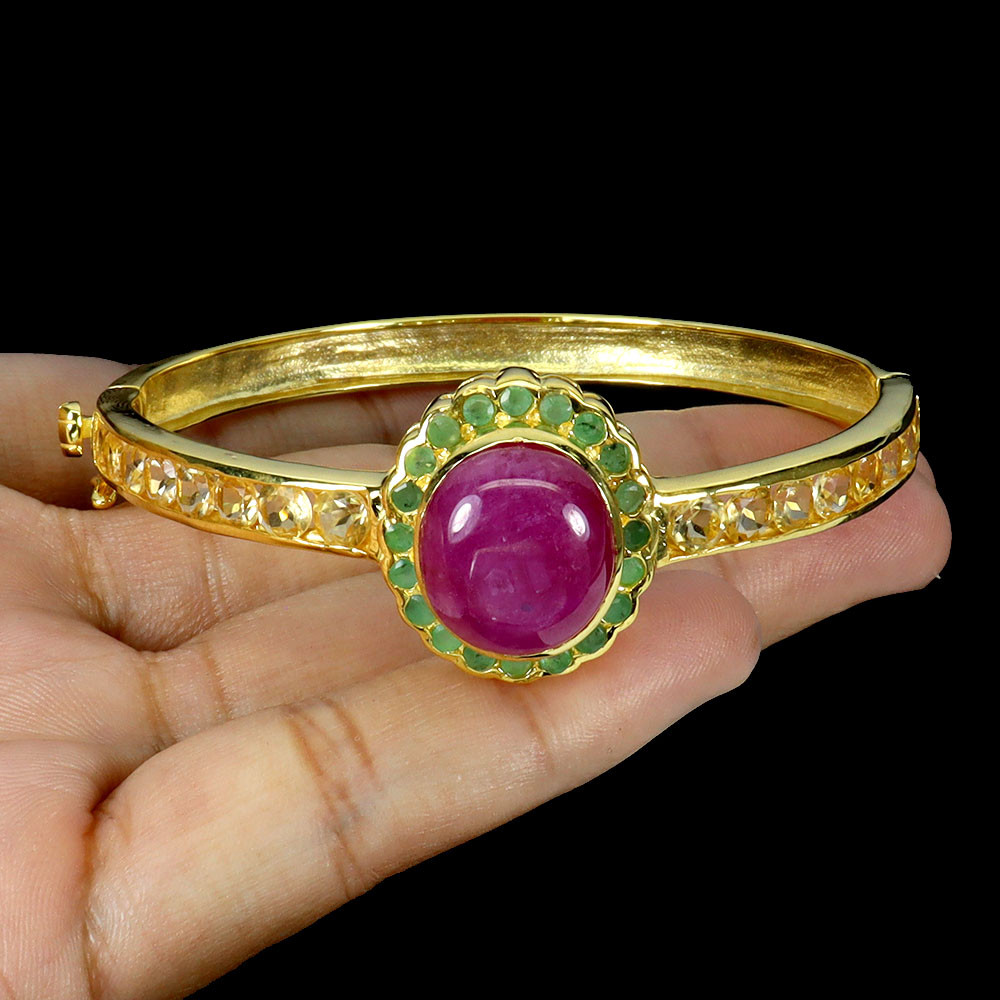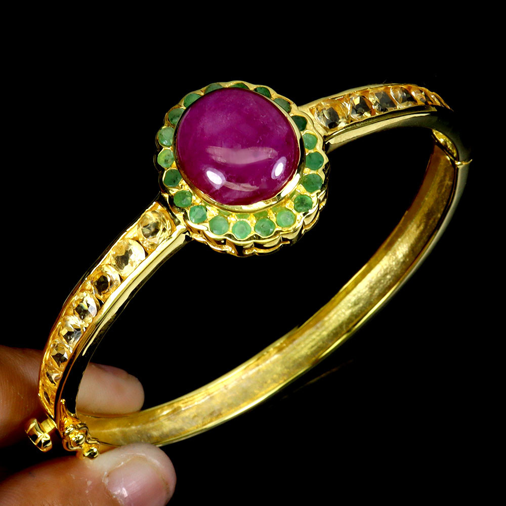 925 Sterling Silver Bangle Oval Ruby Citrine Emerald Natural Gemstone Jewelry 2in PRODUCT ID BG2412020107 PRODUCT TYPE Bangle TYPE OF METAL 925 Sterling Silver PLATE 14k Yellow Gold Ring size/Length (inches) 2 MAIN STONE Ruby OTHER GEMS Citrine, Emerald TOTAL weight 18.93 gram (total weight of silver + stone) DIMENSION * STONE 2.0 TO 15.0 X 12.0 MM. * DIAMETER 2.0 INCHES. * FACE BANGLE 60.0 X 21.0 MM. MAIN STONE SHAPE Oval Cabochon MAIN STONE COLOR Top Rich Red Pink CLARITY/GRADE Opaque LUSTER Precious TREATMENT Heated ORIGIN Africa HARDNESS 9 IF very high quality & Free from inclushions. VVS high quality with very slight inclushions. SI1 Good Quality with slight inclusions visible to the naked eye. SI2 include becoming prominent to the eye. I included. "Delivering excellent with eBay" we accept: PayPal payment which we prefer. FOR US BUYER >>>> PLEASE READ We are genuine seller from THAILAND. All products are originally 100% manufactured in THAILAND. Every items are 100% exported directly from THAILAND. However, we use shipping provider 'Webgistix' who is a US distributor. The items will be allocated from Webgistix's distribution office in Las Vegas, NV by USPS. Please understand that the tracking status will show starting from Las Vegas when you track the items. Feel free to ask for more details. We ship item(s) from Thailand to Worldwide in 24 hr. ( in working day ) after the payment was cleared. $10 - flat rate for a registered airmail, takes 20 - 40 days delivery. Thailand Post stops the service to Latvia, Lithuania, Malta, Moldova, Estonia, Georgia and Israel. Fedex cost up on destination with insure and online tracking. Destinations Asia NORTH AMERICA, CANADA EUROPE (WEST) EUROPE (EAST), SCANDINAVIA, MIDDLE EAST SOUTH AMERICA, AFRICA FEDEX EXPRESS (minimum) $70 $70 $70 $80 $80 Fedex rate will be charged by weight and destination area. A combine package is limited at 10 items within 10 days. Do not send your payment directly, just contact us to request total when you finish bidding (ebay cannot automatic combine items). Any single item weigh over 300ct is not eligible to combine. Buy over US $999 in one payment (10 items within 10days), Get Free FedEx shipment. TAX/CUSTOM: Custom fee is out of seller control. Buyer is responsible for the cost at arrived. Please give us an opportunity when you have questions with item received. Buyer can make agreement on discount or return the shipping in case of damage item. Seller is located in Thailand. So please contact seller for the instruction before return any item. Your communication is most important to solve the problem. International buyers note: Import duties, taxes, and charges are not included in the item price. These charges are the buyer's responsibility. Please check with your country's customs office to determine what these additional costs will be prior to bidding/buying.