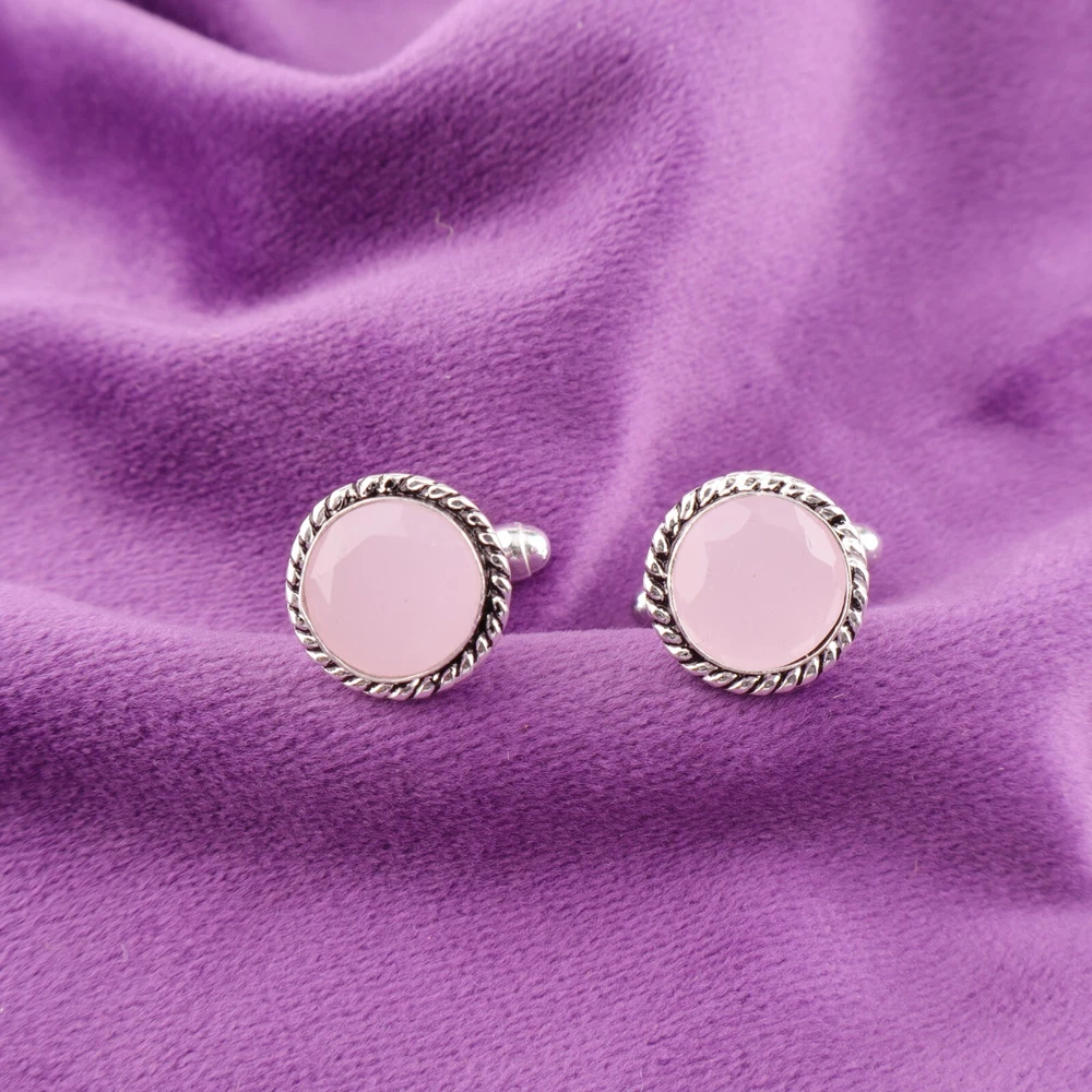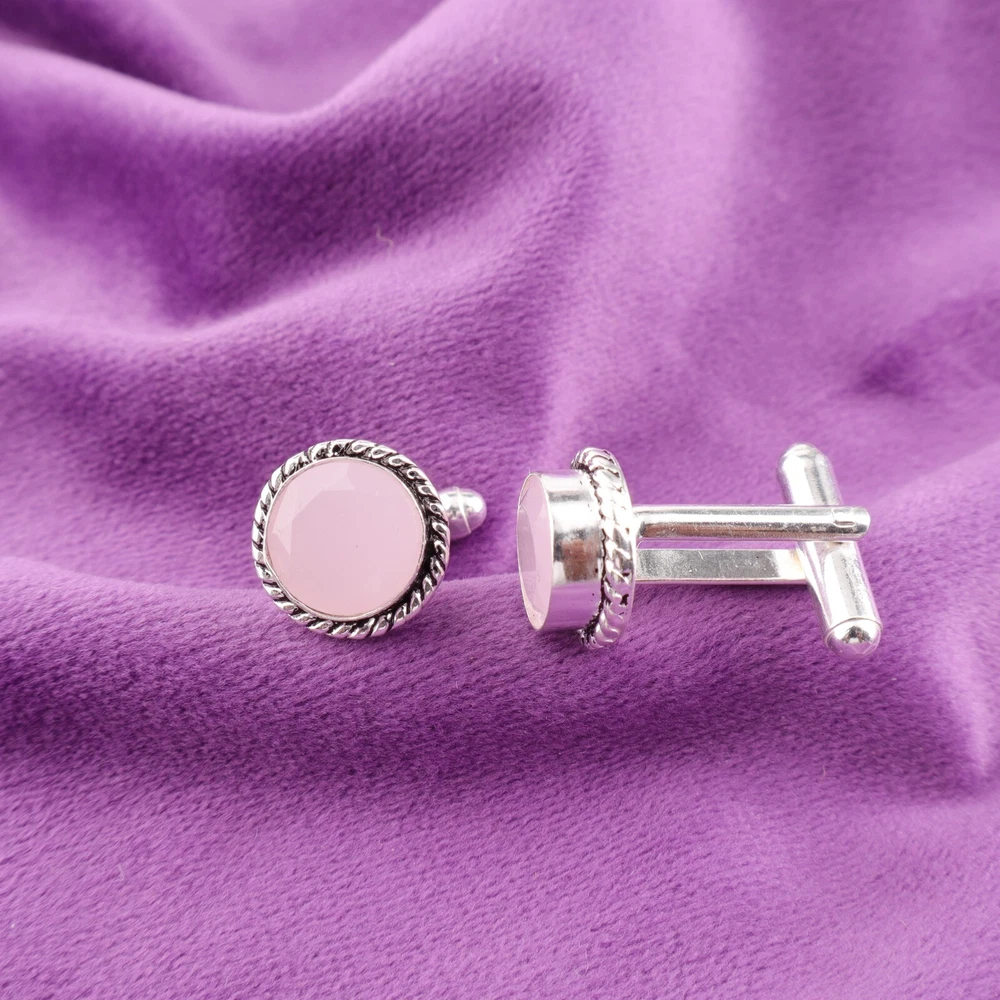 925 Sterling Silver Rose Chalcedony Stone Pink Luxury Mens Cufflinks Jewelry