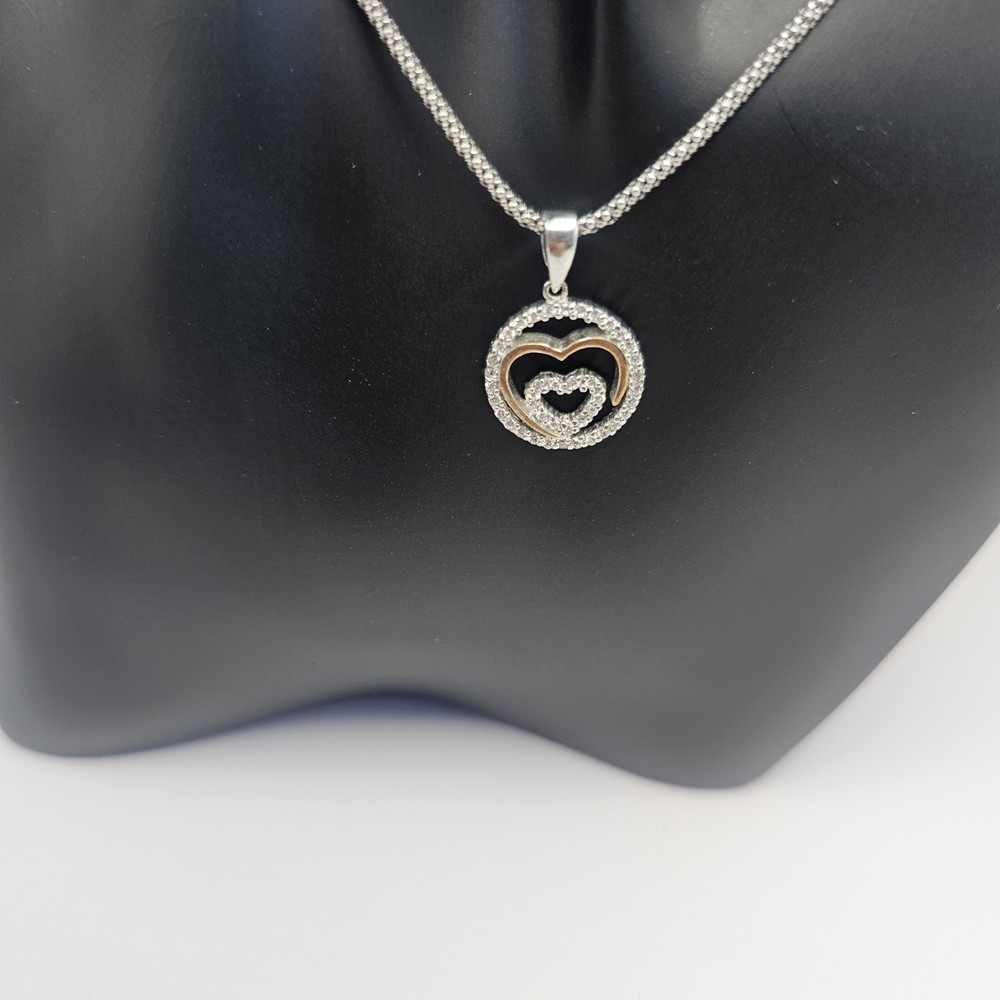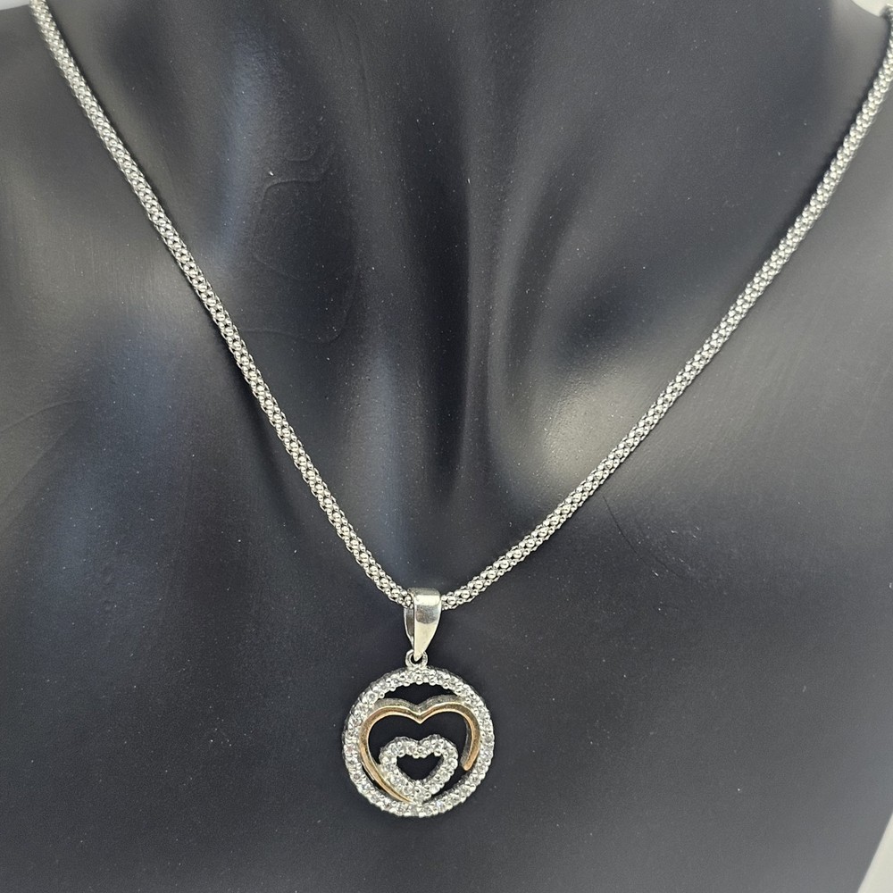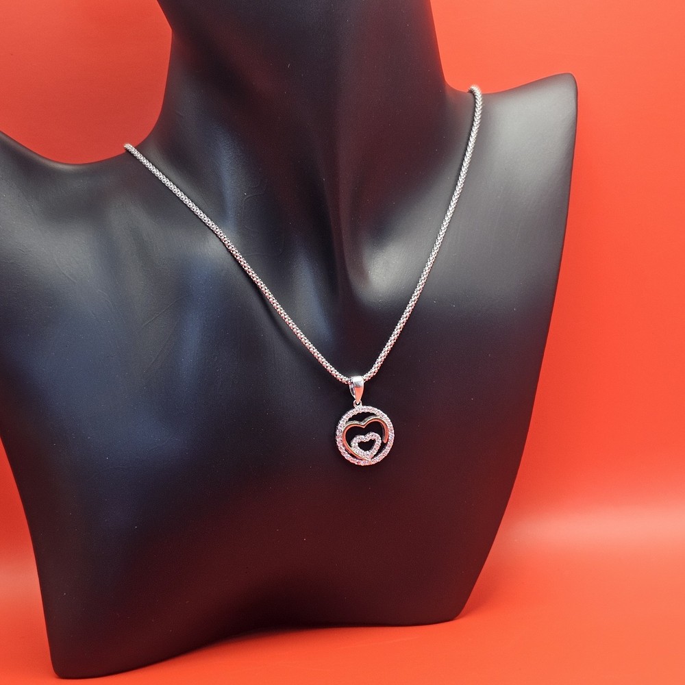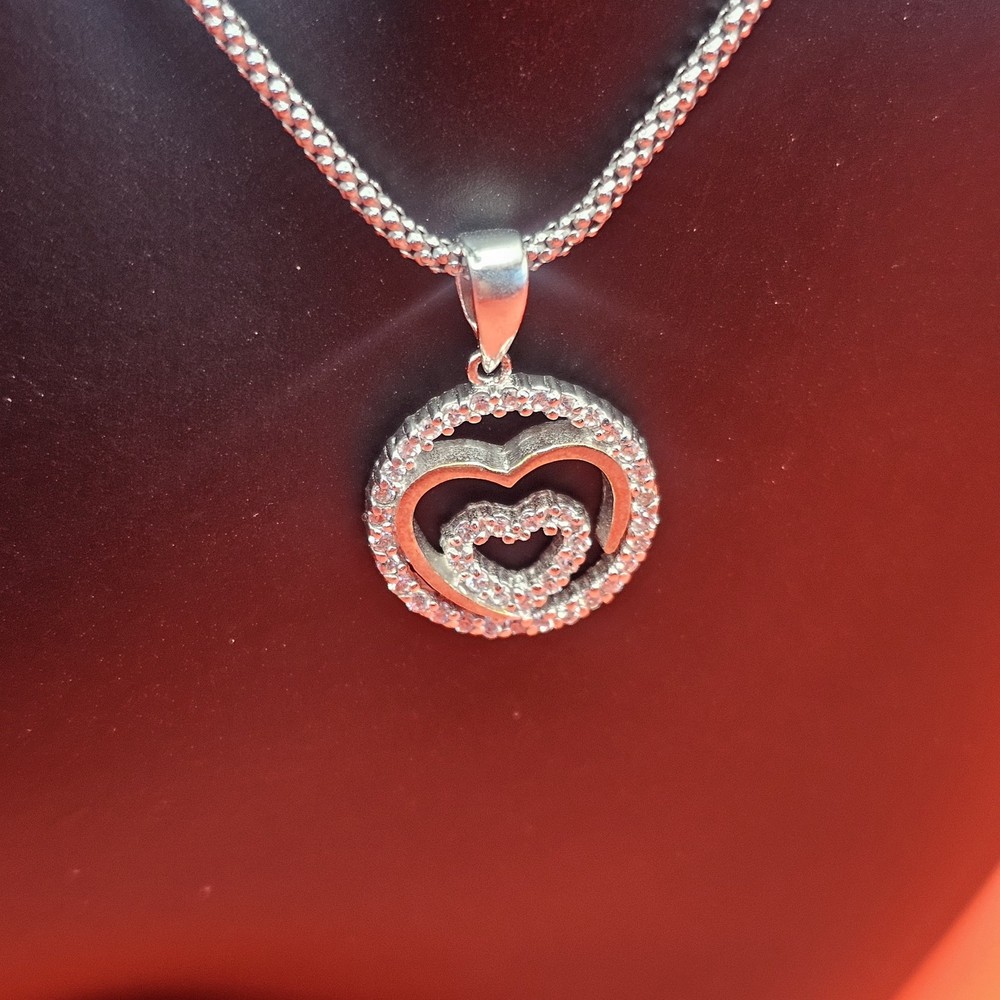 925 Sterling Silver Round Double Heart Pendant Valentine's Necklace