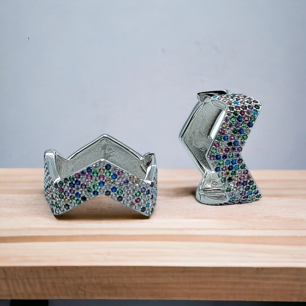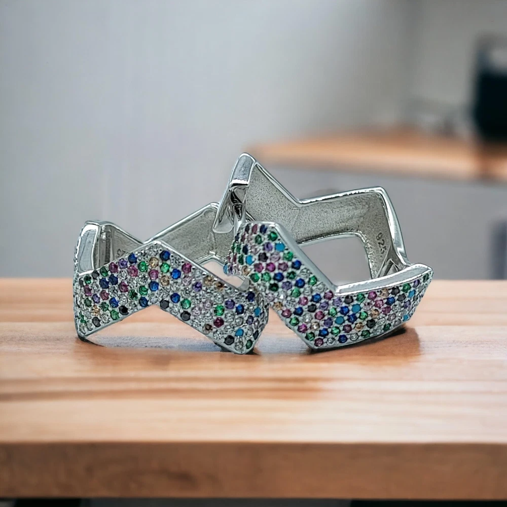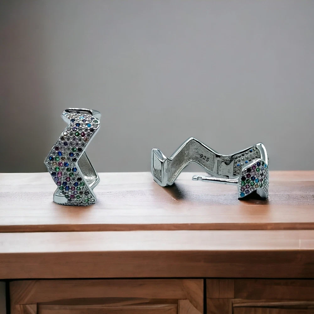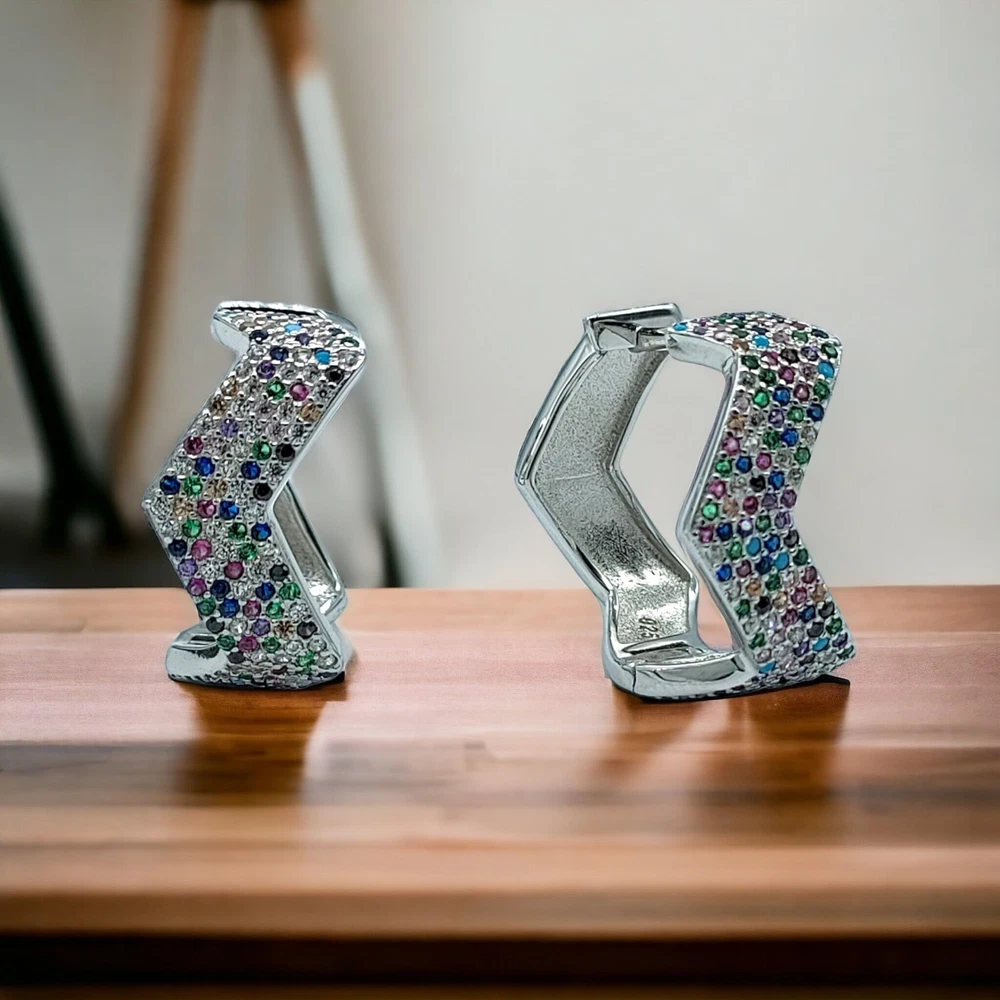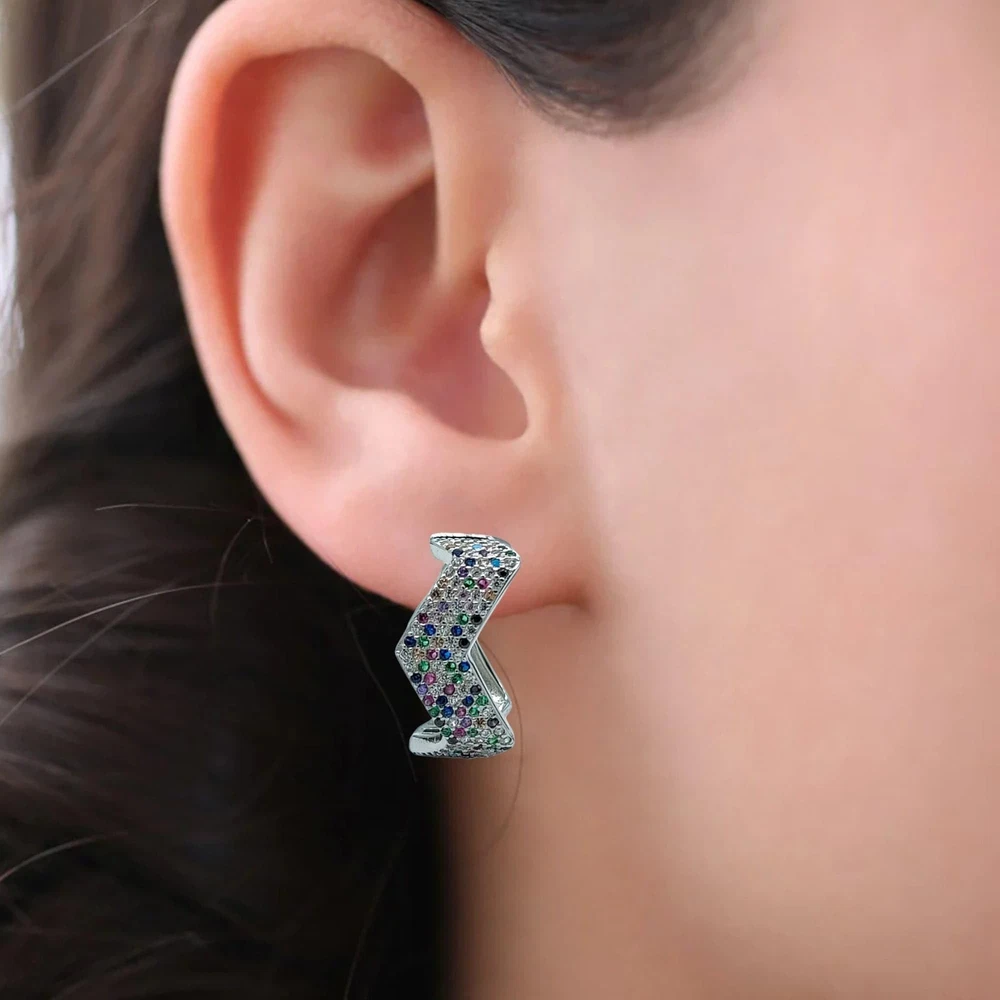 925 Sterling Silver Zig Zag Style Mutlicolor CZ Hoops Stylish Gift-19x7 mm