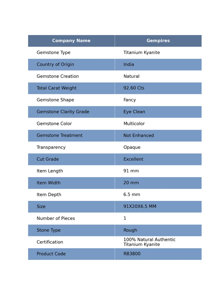 Welcome To Gempires This is a single piece of multicolor Titanium Kyanite gemstone, measuring 91mm in length and 20mm in width. The gemstone has an excellent cut grade and a fancy shape, with a natural creation and rough form. It is certified as 100% natural authentic Titanium Kyanite from India, where it was handmade. This unique gemstone is transparent and untreated, making it a special addition to any collection or jewelry piece. 92.60 Cts Titanium Kyanite Wire Wrap Earrings Making Rough Natural 91X20X6.5 MM Check My Other Titanium Kyanite Listings : Click Here Note: For Custom / Bulk Order, Please contact on Ebay Message Service. QUALITY ASSURANCE:- The photo may not give you the actual size, please refer to the item description for size details. Our product Images are original. We dont use Photoshop for any editing. We always do our best to display an actual image of the gemstone which is to be delivered to our customers. We check all our items and ensure the best quality standards. The item weight may vary 5% (+/-) at maximum and size may vary .10 cents (+/-) as per the gemstone standard. Return Policy:- Any reason, if you are not satisfied with our product, you may return item within 14 days from the date of product delivered. The Item must be returned in its original condition. Return shipping will be paid by buyer. Shipping Policy: At Gempires, we offer two shipping options for our customers: Standard Shipping: 13-15 Days Express Shipping: 5-7 Days Standard Shipping: Our standard shipping option takes approximately 13-15 days for delivery. Please note that this is an estimated time frame and may vary depending on your location and any unforeseen circumstances. We strive to ensure that your order is processed and shipped as quickly as possible. Express Shipping: If you need your order delivered quickly, we offer an express shipping option that takes approximately 5-7 days for delivery. This option is available at an additional cost, which will be displayed during the checkout process. Please note that this time frame is an estimated delivery time and may vary depending on your location and any unforeseen circumstances. Handling Time All orders are processed and shipped within 1-2 business days after payment has been received. Once your order has been shipped, you will receive a tracking number via Ebay notifications, which you can use to track your package. Custom Duty Note Please note that we are not responsible for any customs or import duties that may be charged once the package reaches your country. These charges are the responsibility of the buyer and are not included in our shipping fees. We take great care in packaging our products to ensure that they arrive at your doorstep in pristine condition. However, if your package arrives damaged or you have any other concerns about your order, please don't hesitate to contact us. We will do our best to resolve any issues and ensure that you are satisfied with your purchase. Feedback Policy:- At Gempires, we value your feedback and strive to provide the best customer experience possible. We welcome your reviews and appreciate your time in sharing your thoughts about your purchase with us. If you are satisfied with your purchase and our service, we would love to hear about it. Your positive feedback can help other buyers make an informed decision about our products and services. If for any reason you are not completely satisfied with your purchase or our service, please reach out to us before leaving a negative review. We are committed to resolving any issues that may arise and ensuring your satisfaction. Thank you for choosing Gempires for your natural gemstone needs. Your feedback is valuable to us, and we look forward to providing you with exceptional service in the future. Best Regards Gempires