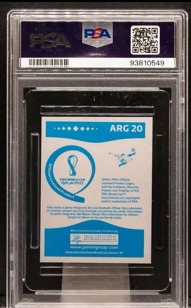 This is a rare opportunity to own a 2022 Panini FIFA World Cup Stickers Blue Back PSA 10 Lionel Messi trading card. This card features the soccer legend from Argentina and is perfect for collectors of sports trading cards. The card number is 938105!49 and it has been classified by Professional Sports Authenticator (PSA) with a score of 10. The card is a parallel/variety of the soccer legend Lionel Messi and is part of the Sports Trading Card category. It is a great addition to any collection and is perfect for fans of soccer and sports trading cards. Don't miss out on this opportunity to own a piece of soccer history!