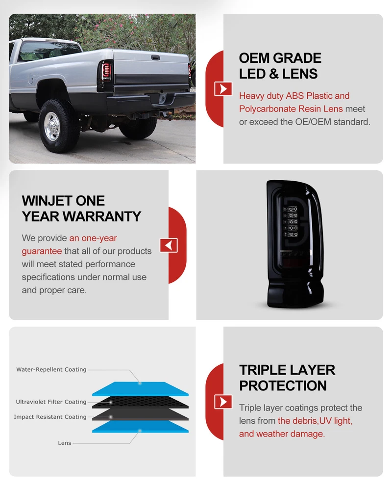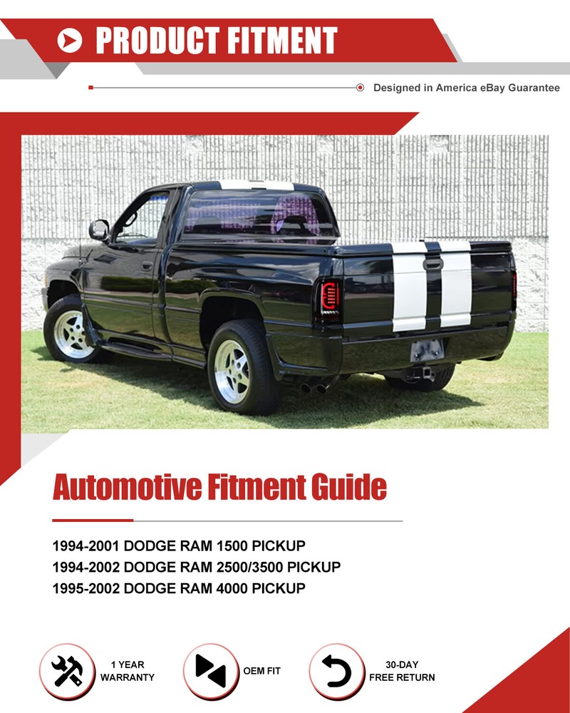 LED Tail Lights For 1994-2001 Dodge Ram 1500 2500 3500 Black Smoked Brake Lamps Fitment: 1994-2001 Dodge Ram 1500 Pickup 1994-2002 Dodge Ram 2500 Pickup 1994-2002 Dodge Ram 3500 Pickup Specification: Lens Color: Smoke Lens Housing Color: Black Housing Certification: DOT / SAE Compliance Material:PMMA(OEM Grade) Color Finish: Black Housing / Smoke Lens / Chrome Reflector Repalce OEM Number: L: 55055265AC R: 55055264AC Partslink Number: L: CH2801122 R: CH2800122 Package Includes: 1 Pair of LED Tail Lights(Driver(Left) & Passenger(Right) Side) Payment Delivery details Terms of sales About us Contact us Payment 🤟 We accept PayPal (Recommended), credit card, VISA, Google Pay & Discover etc. 🤟 Please submit your payment within 7 days after your purchase. 🤟 If not, eBay will automatically open an Unpaid Item Dispute on our behalf if the item(s) are not paid within 7 days. Delivery details 🤟 Please double check your delivery address and contact information. 🤟 All items will be shipped within 1 business days after payment received. 🤟 Tracking numbers will be easily accessible ASAP they are created and processed. Terms of sales 🤟 Free 60 days Return, we will cover the return post fee. 🤟 If a defective product was received, please do not hesitate to message us via eBay message. 🤟 We will response in 24 hours in business to resolve the problem 🤟 We stand behind our products. Items can be returned for exchange or full refund within 60 days from the date you receive. About us 🤟 Winjet has a huge warehouse and office located in the United States. 🤟 All US domestic 48 states customers are able to benefit from the FREE SHIPPING services. 🤟 Our experienced, professional customer service representatives offers prompt and courteous service. 🤟 Best quality products, outstanding services and professional experience keep our customers. Contact us 🤟 Please feel free to contact us if you have any problems. 🤟 Emails will be replied within 24 hours in working days. 🤟 After hours emails will be replied on the next business day.