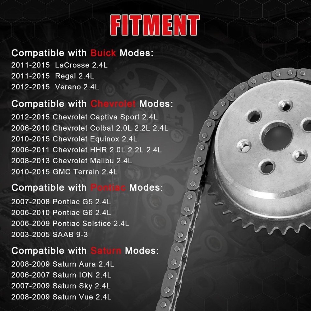 94201S Timing Chain Kit with Tensioner Guide Rail Crank Sprocket Shaft Sprocket Compatible with Chevy Malibu Equinox Buick LaCrosse L4 2.0L 2.2L 2.4L RELIABLE QUALITY: All parts are strictly tested to keep your car in good running order. Timing Chain kit it can improve the power and efficiency of the engine noise is small, the transmission resistance is small, and the operation is stable, which reduces the damage to the car FITMENT: Compatible with 2011-2015 Buick LaCrosse, 2011-2015 Buick LaCrosse, 2012-2015 Buick Verano, 2012-2015 Chevy Captiva Sport, 2006-2010 Chevy Colbat, 2010-2015 Chevy Equinox, 2006-2011 Chevy HHR, 2008-2013 Chevy Malibu, 2010-2015 GMC Terrain, 2007-2008 Pontiac G5, 2006-2010 Pontiac G6, 2006-2009 Pontiac Solstice, 2003-2005 SAAB 9-3, 2008-2009 Saturn Aura, 2006-2007 Saturn ION, 2007-2009 Saturn Sky, 2008-2009 Saturn Vue HIGH PERFORMANCE: Timing chain kit can also run normally in extremely bad weather. It is resistant to high temperature and low temperature, wear resistance and has a long service life DESIGNED FOR REPLACEMENT OEM: Timing chain kits are manufactured to meet the automaker's key requirements for OE quality fit, form, and function to ensure lasting peak performance, Replace C6209S, 9-4201S, 94201S, 9-4201SX, 94201SX, 9-4202S, 12680750 CHOOSE US: TEMSONE offers 1 year of product quality support to our customers, If you are uncertain of any problems, please contact us › See more product details Shipping USA-Based! Fast & Free Shipping Daily. Customer Satisfaction Guaranteed. Orders to U.S. territories (PR, AK, HI, GU, VI, Overseas) require you to contact us first to ensure we can ship to your location. Return We accept returns that are reported within seven (7) days, provided items are unused and in original packaging; otherwise, restocking fees or claim rejection may apply. Payment We accept PayPal and All Major Credit Cards. We strive to ensure your satisfaction and are happy to resolve any issues. Please visit our eBay store to check out other items for sale! Thank you for shopping at our store.