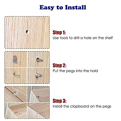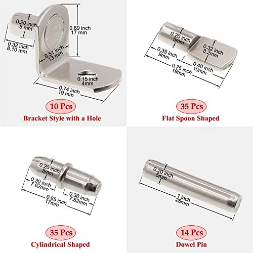 Return Policy Fast Delivery Trusted seller Shelf Support Pegs Kit, 94 Pcs 4 Styles Shelf Pegs, 5mm Nickel Plated Cabinet Shelf Bracket Pegs, Shelf Pins Holders for Bookcase Kitchen Closet Shelf Shelves Furniture Cabinet Product Description [Package] 10 x 1/5"(5mm) L-Shaped with hole shelf support pegs, 14 x 1/5"(5mm) dowel pin shelf pegs, 35 x 1/5"(5mm) flat spoon shelf pins, 35 x 1/5"(5mm) cylindrical shaped shelf bracket pegs, 1 x plastic box. [Application] The shelf support pegs used on bookcase, kitchen, closet, shelf cabinet, furniture, display cabinet, shelves supplies, wine cabinet, solid wood plywood plastic, bookshelf, shoe cabinet, glass plate etc. [Easy to Install] Cabinet shelf support pegs easy install by hand. [Material] Shelf support pegs & pins make from Iron with nickel plated, the shelf bracket pegs will not easily rust and oxidized, good quality and durable. [Tips] In order to make shelf support pegs a tight fit, your hole should be equal to or slightly smaller than the diameter shown. Shipping Returns Payment Shipping Shipping is FREE to all addresses other than APO/PO boxes in the lower 48 states. All our stock ships from US-based warehouses. Shipped via USPS or UPS (depending on location and package weight) Unless stated otherwise, all orders will ship within 24-72 hours of your payment being processed. Check our feedback to see the great reviews of FAST shipping we offer. Returns Seller does not accept returns Payment We currently accept payment via eBay managed payments only. Once payment is cleared, we will dispatch your shipment within 1-3 business days. Please refer to the "Shipping" tab for more information regarding shipping speed to your destination.