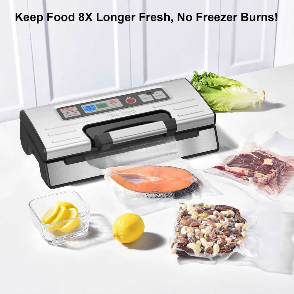 Vacuum Sealer Machine, 95kPa Food Sealer with Double Heat Seal for Dry/Moist Food, Easy-lock Handle, Built-in Bag Storage & Cutter, Progress Display, Removable Drip Tray, Silver Product Details Color: Silver Brand: Gasbye MPN: VS5166 UPC: Does not apply EAN: Does not apply Brand: Gasbye Material: Stainless Steel Color: Silver Product Dimensions: 15.7"L x 7.8"W x 4.7"H Item Weight: 6.5 Pounds Brand: Gasbye Material: Stainless Steel Color: Silver Product Dimensions: 15.7"L x 7.8"W x 4.7"H Item Weight: 6.5 Pounds Power Source: 95kPa Dual Pump Operation Mode: Automatic Wattage: 130 watts Voltage: 120 Volts Manufacturer: Gasbye Item Weight: 6.5 pounds Item model number: VS5166 Date First Available: April 14, 2024 [Double Heat Seal & 95kPa Powerful Suction] The Gasbye Vacuum Sealer Machine is equipped with dual heat sealing strips and a high-efficiency 95kPa vacuum pump, delivering stronger suction and tighter seals. Perfect for long-term food storage, it keeps air out and freshness in for months [Built-in Storage & Bag Cutter] Keep your kitchen organized and efficient. This model includes integrated storage for food bags and a built-in cutter that allows you to quickly and easily size your bags [Removable Drip Tray] Sealing juicy or marinated foods? No worries. The removable drip tray catches any overflow, making cleanup a breeze [Ready-to-Use Starter Kit] Jump straight into preserving your food with our complete starter kit, including the Vacuum Sealer, 5 pre-cut bags, one 11" x 10' bag roll, 2 replacement foam gaskets, and an external air suction hose (located at the top of bag storage compartment) [5-Year Quality Coverage] If you purchased our vacuum sealer based on a statement in our listing and feel it doesn't meet your expectations after use, you can directly contact Gasbye Support for a FULL REFUND or FREE REPLACEMENT. In addition, all replacement units we provide are BRAND NEW, not refurbished. You can trust Gasbyewe stand behind our products with confidence [Product Development Background] Our VS5166 model is an advanced upgrade of a classic market model. Each feature of this machine might be familiar from other models, but the VS5166 may be the only one on the market that combines all these features into a single unit