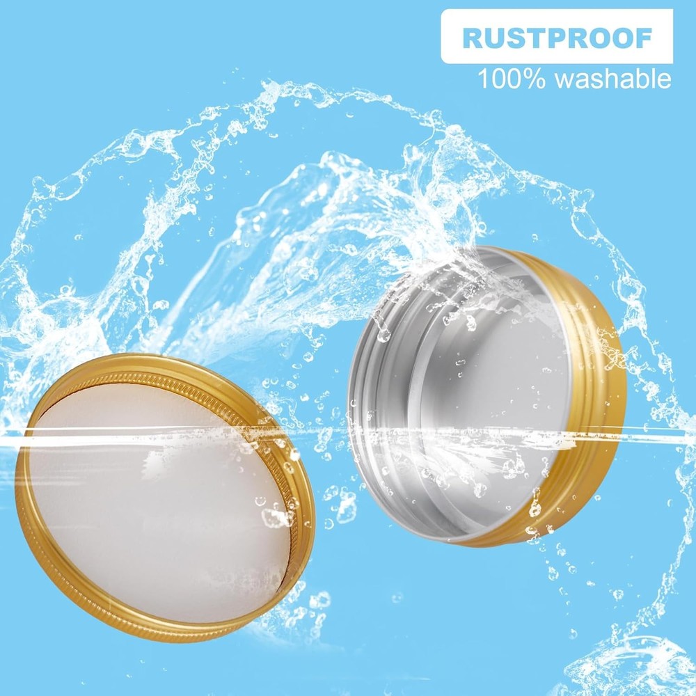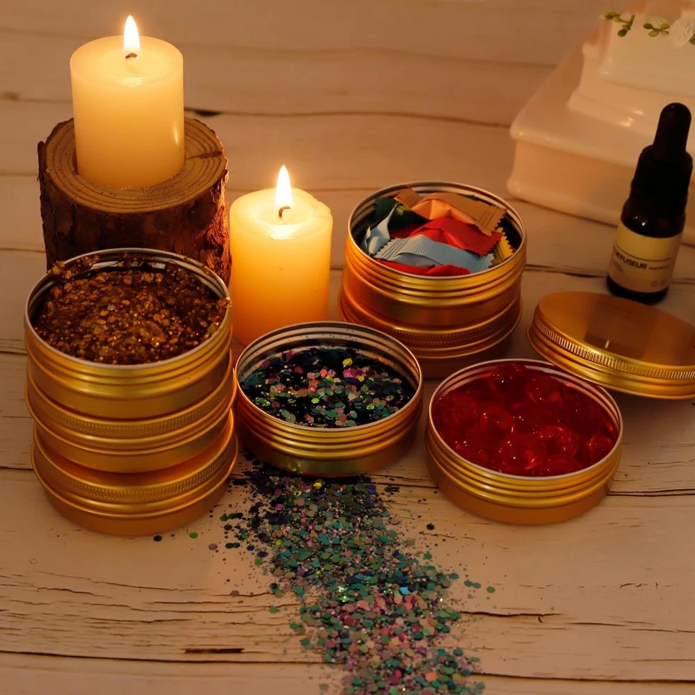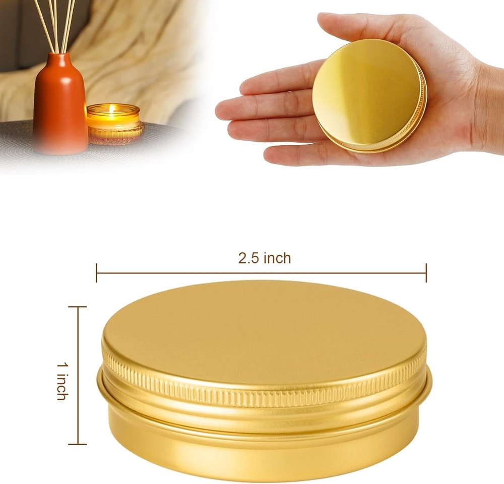 About this item 【Package Contains】96 aluminum tin cans with screw lids,4 pieces of white markers, 108 pieces of black labels 【Capacity】Stores up to 2oz/60ml 【Premium & Safe Material】Made of high-quality metal aluminum, the tin can is beautiful in shape, light in weight yet durable, Smooth surface ,can be labeled with small labels for easy identification. 【Sealing and Leak-Proof】The metal aluminum tin can adopts a tightly sealed screw twist lid structure, it can prevent liquid from leaking efficiently.The best gift for your friends or family who love making jars or cosmetics by themselves. 【Wide Application】- These empty aluminum containers are perfect be widely used to make candles or store DIY ointments, food storage, beard balms,DIY balm, cosmetic packaging, candy storage, and so on. Brand: Color: gold Material: Aluminum Material Feature: Food Grade Capacity: 2 ounces