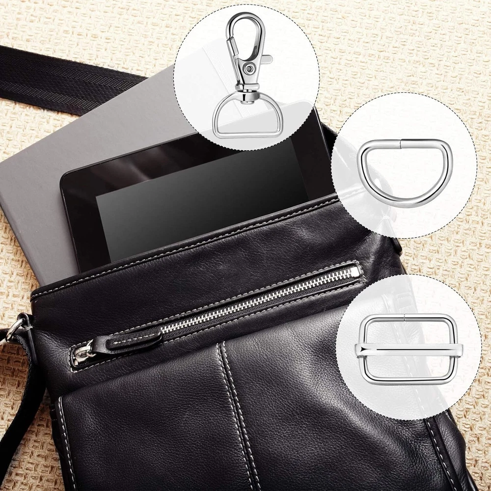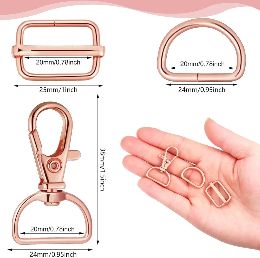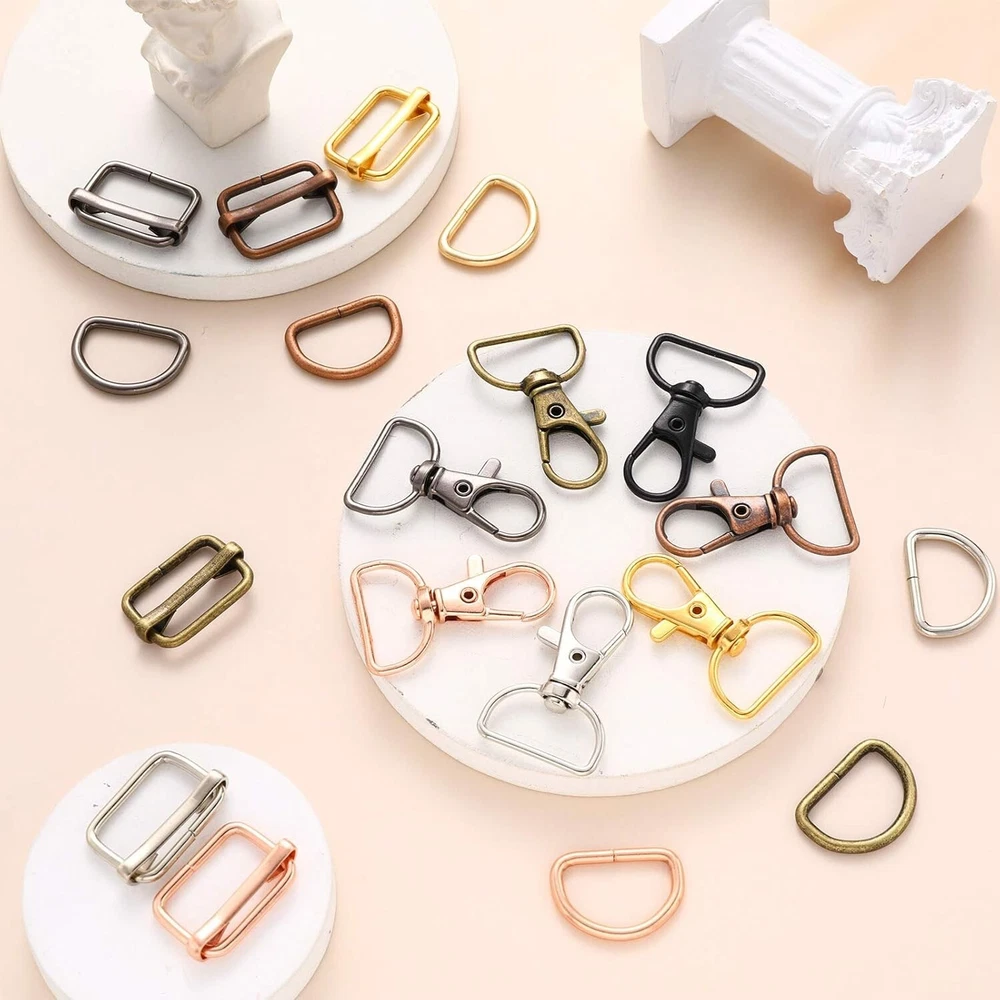 96 Pieces Swivel Clasps with D Rings and Slide Buckles Set Lanyard Snap Hooks Keychain Clip Hooks D Keychain Rings Lobster Claw Clasps for Keychain Purse Hardware Sewing Craft Project, 8 Colors About this item Package details: there will be 32 pieces swivel clasps, 32 pieces D-rings and 32 pieces slide buckles for you, all contain 8 different colors, 4 pieces per color for each kind of metal item, sufficient quantity and classic colors will meet your multiple DIY needs Multiple colors: the lobster clasps, D-rings and slide buckles come with multiple colors, such as silver, gold, black, rose red, bronze and so on, which are also not easy to fade and can be maintained for a long time, you can match them with different DIY projects, sewing projects or keychain making projects Durable to use: these keychain making accessories are made of sturdy quality metal material, not easy to break or deform, easy to use and convenient to store, metallic luster on the surface makes these accessories look shiny and delicate Can be rotated: these metal keychain buckles can be rotated up to 360 degrees, which allows you to rotate them in any direction to easily install your keychain, brings you much convenience and saves you much effort Extensive functions: keychain clip hooks with D-rings and slide buckles can be widely applied for backpack pendants, necklaces, wallets, anklets, sweater chains, dog collars, etc., or to make jewelry crafts, and other small objects