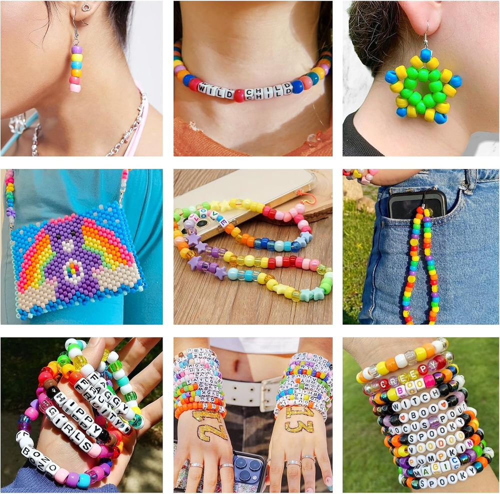 PROPER QUANTITY - 2016pcs Rainbow Pony Beads and 560pcs Letter Beads, about 21 Pony Beads per color, Alphabet Beads contain 4 of the most popular styles, perfect for making all kinds of jewelry SPECIAL COLORS - 96 different colors, including 5 styles: solid color, transparent, pearlescent, glitter, AB color, each color is completely different, these pony beads with special shiny colors can meet your diverse DIY needs SIZE - The size of rainbow beads is 6*9mm, and the hole diameter is 4mm; the size of flat letter beads is 4*7mm, and the hole diameter is 1mm; the size of square letter beads is 6*6mm, and the hole diameter is 3.5mm. All beads are made of healthy plastic, with a smooth surface, sturdy and waterproof, so you can wear them safely while bathing or swimming CONVENIENT STORAGE - You will receive 4 separate plastic boxes, beads of different colors and different kinds are placed separately, which is very convenient for you to store and carry. The box itself is also sturdy and closes tightly. You can buy with confidence MULTIPLE APPLICATIONS - The rainbow beads set can be used not only to make beautiful necklaces, bracelets, pendants, etc., but also to make cute cartoon or animal patterns. You can use your infinite imagination to combine these rainbow beads with letter beads to make your own keepsakes Product Description Package includes WE PREPARE ALL YOU NEED! 2700 pcs pony beads (96 different colors). 560 pcs letter beads. 60 pcs heart beads and fruit beads. 2 rolls 10 meters stretchy strings. BEST TEEN GIRL GIFTS! Imagine Her Reaction as she opens her pretty pony bead box to see a beautiful pony beads kit for the first time. It’s a Precious Moment that you’ll want to capture. ALUABLE COLLECTION AND GIFTS! How exciting to image your kids getting different charms and beads every day from different creative advent, and when festival arrives, she makes her unique bracelet and bead pets!