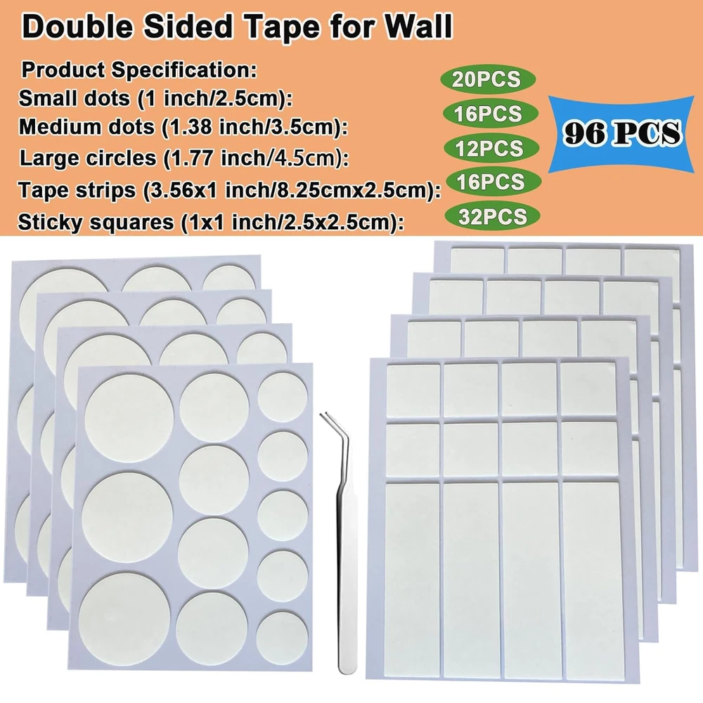 Store New Arrivals Add to Favorite View Feedback Contact 96PCS Double Sided Tape for Walls, Mounting Tape, Picture Hanging Strips Description Item model number KH-AZJL Number of Items 96 Color White Product Dimensions 7.72 x 5.28 x 0.51 inches; 4.23 ounces Material Adhesive Recommended Uses For Product Arts And Craft, Indoor Brand KAIHENG Manufacturer kaiheng 【Strong Adhesive Double Sided Tape】Mounting poster tapes are made of good adhesive material that is elastic, durable, transparent and unobtrusive. Due to its strong adhesion, it is very suitable for hanging and pasting small and medium-sized objects. At the same time, clear tapes contain various double-sided, sticky, dots, rectangles and squares shapes, which can be used in combination, so that the paste is more firm and lasting in the using process. 【No Residue】This kind of adhesive mounting dots squares are suitable for plastic, glass, metal, fabric, wood, ceramic tile and other smooth and flat surface. Note that it can't be used for wet, rough, inferior, painting walls. Removing it may damage your painted wall, therefore, careful consideration should be given when using it on painted walls as it is very sticky. 【Washable and Reusable】This transparent pre-cut wall hanging strips can be reused. You just need to rinse it with water and wait for it to dry to regain its stickiness, which is more convenient to use. 【Meet Different Demands】One package comes with 48 circles, 16 strips, 32 squares, a total of 96 PCS, which provides a strong and versatile bond for your hanging and taping needs. More importantly, different shapes, sizes and multiple quantities are available to meet different needs. 【Wide Range of Applications】These adhesive strips can be used to hang pictures, lightweight picture frames, posters, balloons, room decoration small items, carpets, can also stick art crafts, envelopes. It is essential for home, office, school, party, wedding, decoration. Product Description Double Sided Tape Multipurpose Mounting Squares Transparent It is multi-purpose, trace-free, heavy-duty removable double-sided adhesive, which is indispensable in our daily life. Leave no traces and high elasticity This adhesive mounting square is highly elastic and relatively sticky, suitable for smooth and flat surfaces, such as plastic, glass, metal, fabric, wood, tile. High elasticity and relatively strong adhesion. Strong and long-lasting adhesion This thin (0.8 mm) adhesive dot is very suitable for hanging and pasting small and medium-sized items due to its super strong adhesive force, which will not easy move after pasting and has high fixity. 1.Clean the pasted surface to ensure it is dry and dust-free 2.Press the object tightly against the adhesive strips for 3 seconds 3.Remove the release film 4.Press the object tightly against the adhesive strips for 3 seconds Removable Double Sided Tape for Walls Mounting Squares Dots This clear mounting ddhesive strips mainly use to stick balloons, hang pictures, posters, banners and some light items for party and room. It can also be used to fix mouse pads, tablecloths, and table small decorations. In addition to that, it's also great for crafts, sticking cards, making envelopes, and more! 1. Question: will these work for sticking objects to the wall? Answer: These double sided tape very useful to sticking objects to the wall, simply follow the instructions - no painted walls and no surfaces that are rough, wet inferior, or damaged. In the same way, objects that stick to surfaces should be flat, smooth, and clean. It has been lasted one month without problem. To be more effective, items that are slightly larger and heavier, it is suggest that to sticky more tapes. 2. Question: Is it still sticky when rinse these off with water and can it still be used? Answer: You could rinse these off with the water, and in a few minutes it can still sticky again. It works well. Have to say you need to wait for these mounting tapes to dry when using, as they are not sticky while wet. By the way, they regain 75% of its original stickiness even though repeated rinsing. 𝟑. Question: Are these work better than foam style mounting tapes ? Answer: Thinks this style works better than foam style ones. As these sticky tape are precut and comes in many sizes(circles, stripes and squares), which can choose the right one based on the objects and where it is stick. In addition to this, since this adhesive tape is not too thick, it can make the items more flush against the wall, which is more practical. 𝟒. Question: It is suitable for decorating party and doing crafts ? Answer: Hanging strips perfect for these. can use them for sticking balloons, photos, and also for making adhesive flowers and cookies, and they stick firmly. All my decorations are easy to remove without damage the walls which think is so great. Note:Needless to say, it is not suitable for sticking too heavy objects, and valuable objects. Items with a little weight need to be attached with multiple stickers or mounting dots for better fixation. ABOUT US We offer the best prices around on high quality products. Our E-store includes media such as books, movies, music and games while offering electronics, toys, sporting apparel, clothing, tools, general home, garden items and more. SHIPPING We are always working hard to ensure your package arrives as soon as possible. Please understand that some factors like weather, high postal traffic, and the performance of shipping companies are outside of our control. We offer free shipping to the lower 48 states and ship within 2 business days of payment, usually sooner. We do not accept P.O. Boxes. Please provide a physical address. RETURNS We offer a 30-Day Return Policy on items which you are not completely satisfied with. You have the option for a full-refund or an exchange of the item. No returns are available on items shipped outside of the USA. PAYMENT We accept PayPal. CONTACT US This page content is yet 