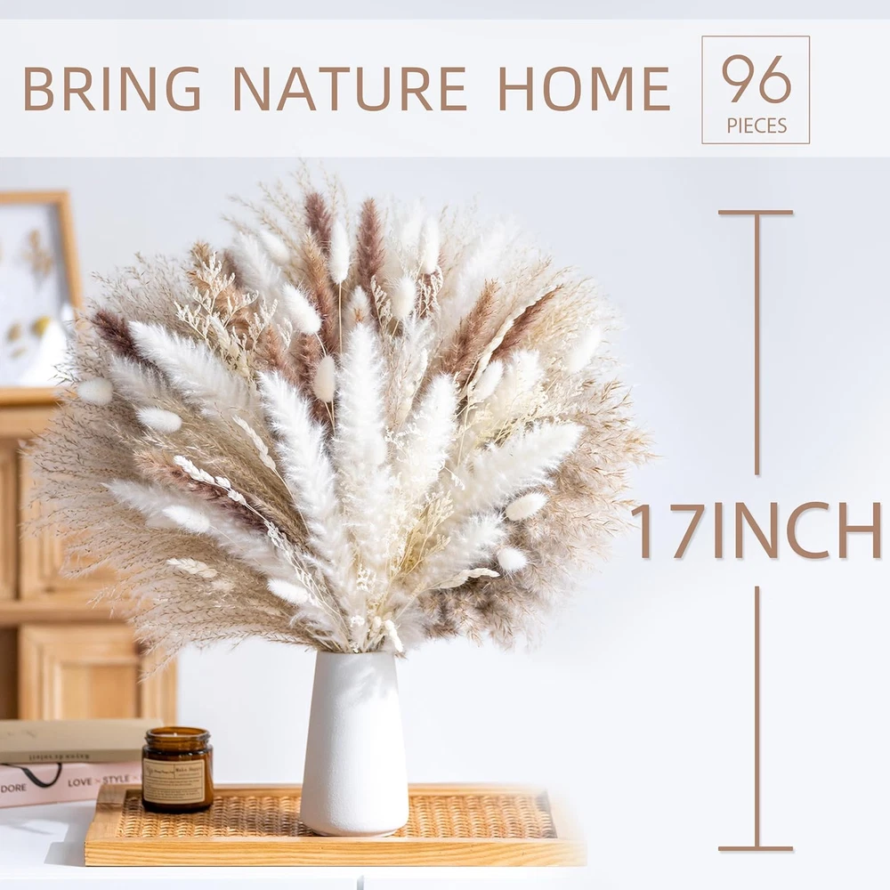 BEAUTIFUL HOME DECOR - Be ready for our attention-grabbing pampas grass to stand out in any room!Whether it be homes, offices, or weddings, our pampas grass fits effortlessly with boho, farmhouse, and modern style decorations! With proper care -our Pampas Grass Bouquet can last up to three years, making it a sustainable and eco-friendly decorating option.keep it dry and enjoy the beauty of this low-maintenance floral arrangement,our pampas grass is an easy and low-maintenance way to add natural beauty to your home or wedding floral arrangements. EASY AND LOW-MAINTENANCE - Easy to maintain simply lightly shake,Leave the pampas grass in the sun for three to six hours to allow the sun's energy to fluff it up. and Spray some hairspray to preserve pampas fluffy. BRING NATURAL IN TO YOUR HOME - Our pampas grass is ethically sourced and all-natural,making it the perfect choice for environmentally conscious-consumers who want to decorate their homes with sustainable products. ENJOY FLOWER ARRANGEMENTS - Trim it to the length you like and insert it into the vase . It will be a surprise to decorate your life and a perfect gift for your friends. our pampas grass bouquet is the perfect choice. Product Description Hi~ We are committed to bringing nature into your home. The bouquet is made up of six kinds of high-quality materials selected by our experienced florist. We hope high quality Pampas bouquets will take your home decorating style to the next level. Hopefully it's not just a pampas bouquet but integrated into your home and into your life. We are always developing new home decoration products. Bring you the best shopping experience through high quality and imagination. We try different styles to find the perfect home decor for you. As we all know, the fall of pampas is inevitable. Therefore, enjoy the gift of nature and inclusive for this little imperfection. Thank you for your choice and love~~ Bring nature home perfect for creating a cozy and inviting atmosphere.