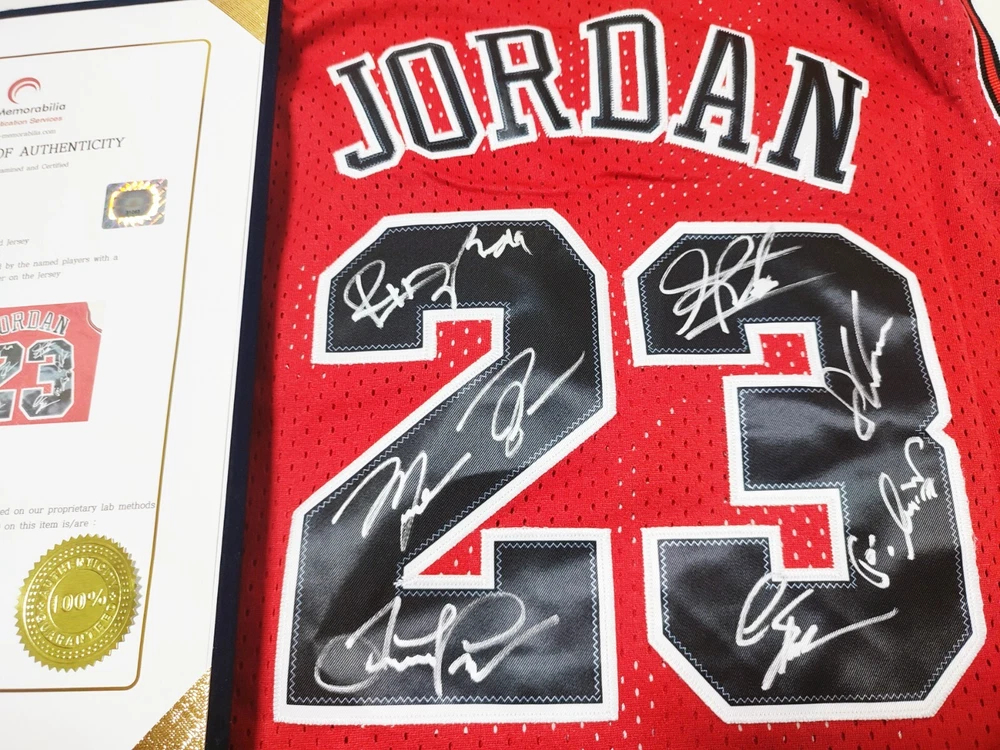 Chicago Bulls No.23 Jordan Jersey Product Details Signed By: Michael Jordan, Scottie Pippen, Dennis Rodman, Toni Kukoc, Ron Harper, Steve Kerr, Phil Jackson Jersey Size: Men's XL Condition: New With Tags Certificate of Authenticity (COA): Provided by PROMemorabilia Certificate Number: 31065 Security Features: Bar Code, Hologram Sticker, Book Case, and Photo in COA Return Policy Returns are accepted, but the buyer is responsible for return shipping costs . Why Buy This Item? This is a rare and iconic autographed jersey signed by the legendary Chicago Bulls team, including Michael Jordan and other members of the dynasty. It is authenticated by PROMemorabilia, ensuring its legitimacy and value. Perfect for collectors and fans of the greatest basketball team in NBA history! Contact me for any questions or additional information. Thank you for visiting!