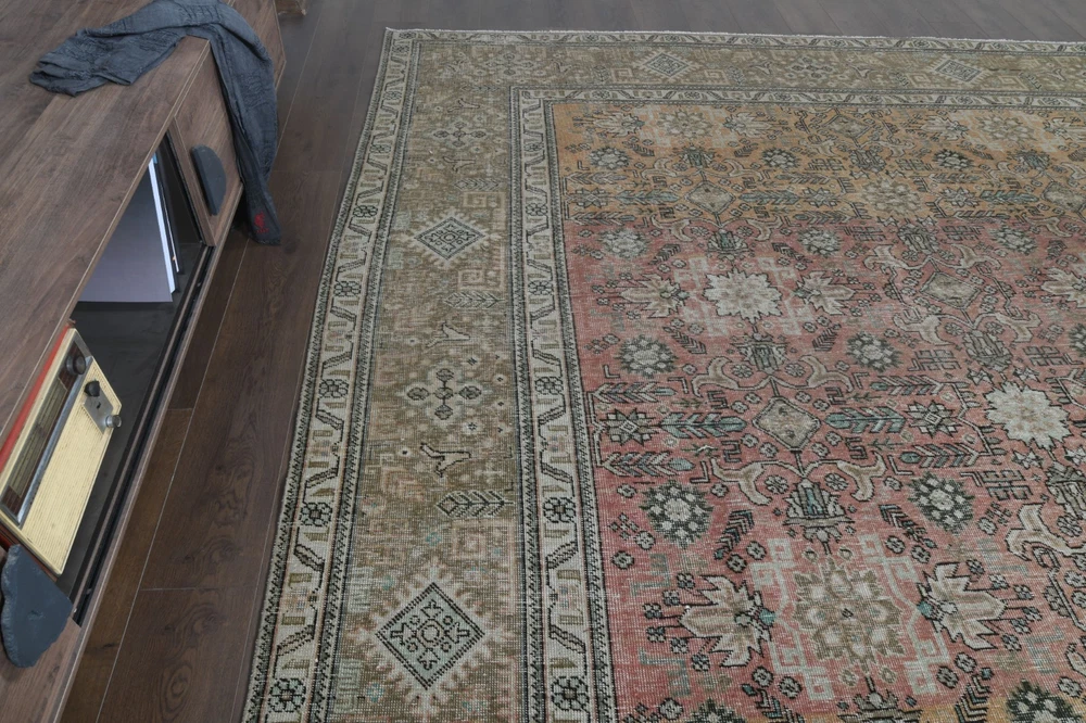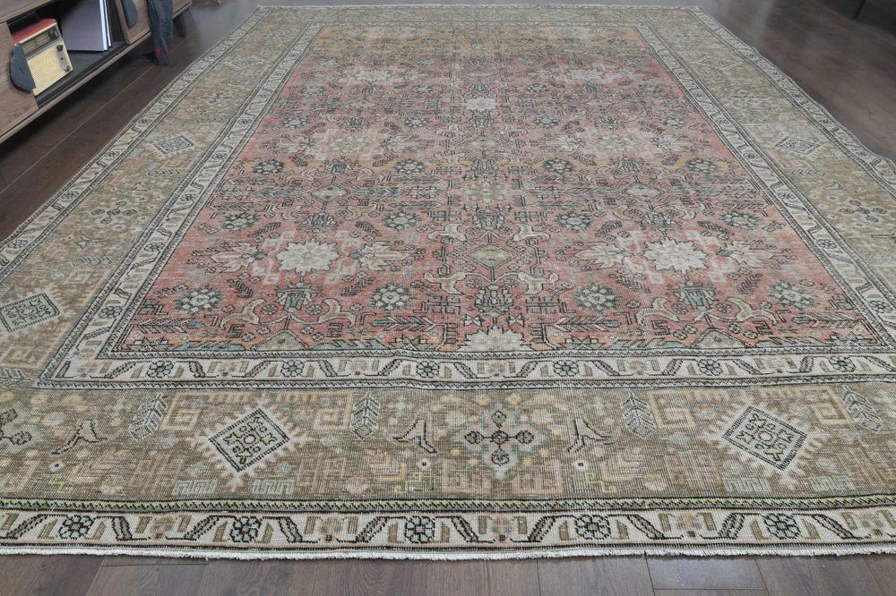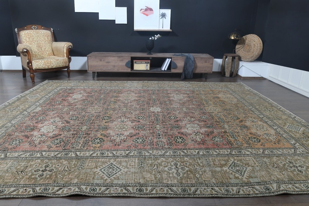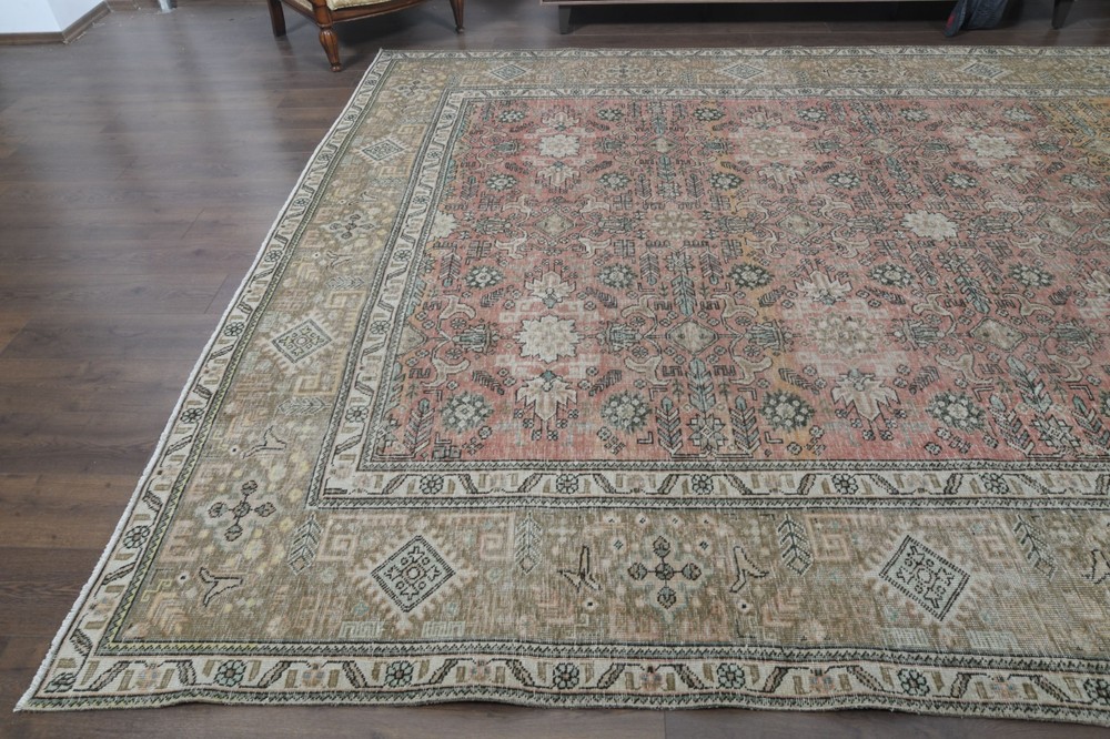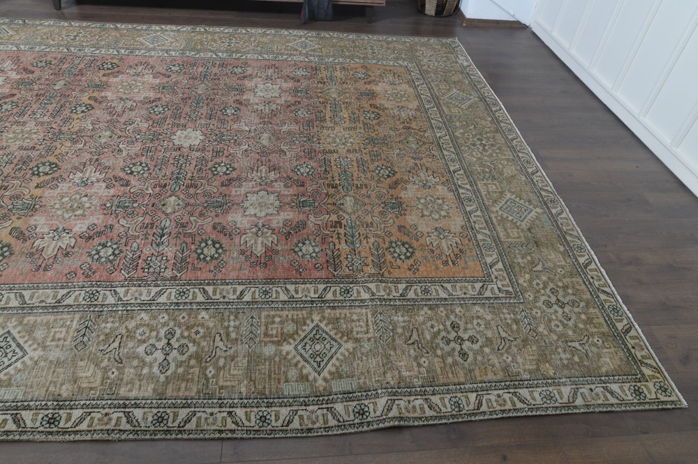 $ 1663.29.4x12.8 ft, OVERSIZED Vintage Turkish Oushak Rug, Faded Red Handmade Wool Rug