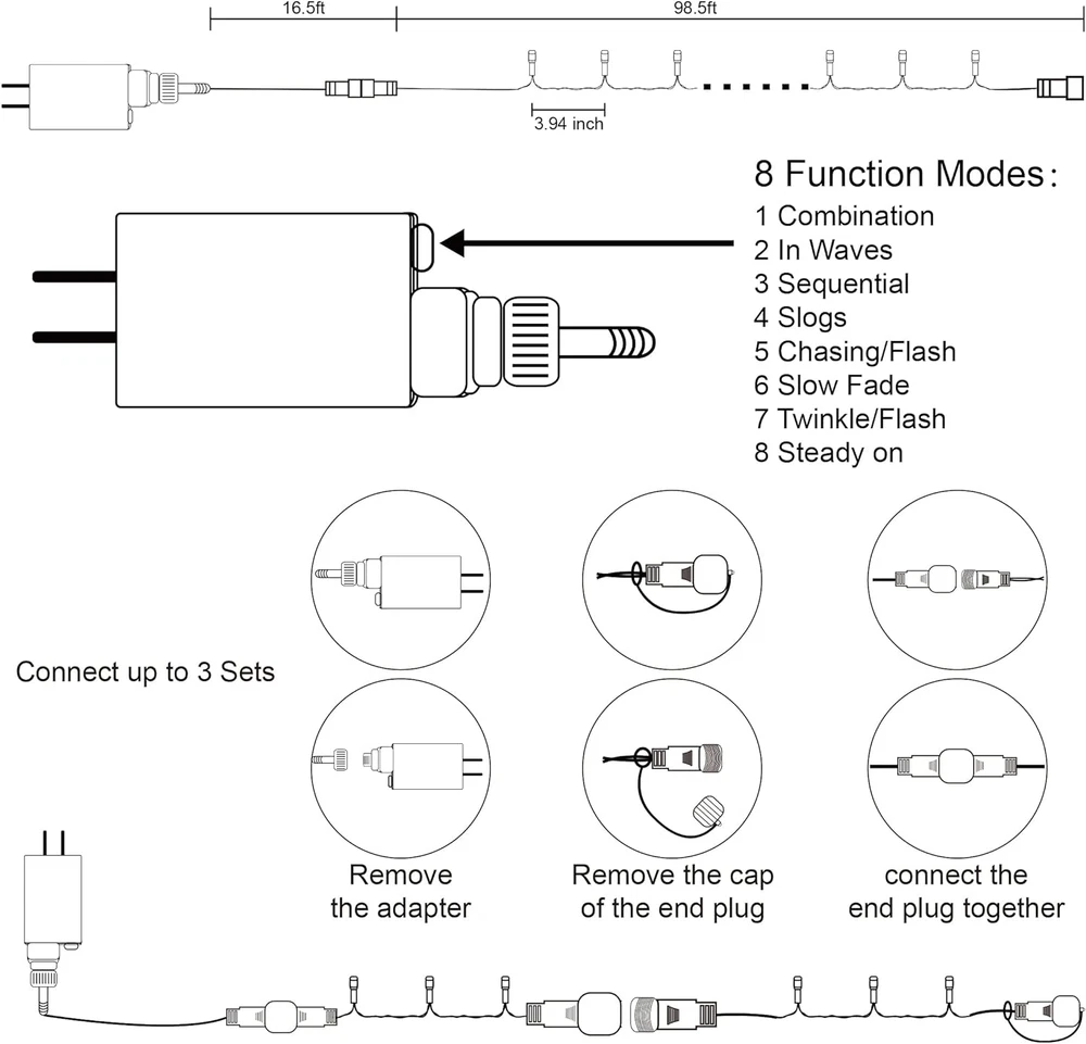 Store New Arrivals Add to Favorite View Feedback Contact 300 LED Christmas Lights, Extra Long 98.5FT Xmas String Lights Outdoor Indoor, 8 Lighting Modes, Plug in Waterproof Fairy Lights for Wedding Party Bedroom Decorations (Red & Green) Description Item model number HB-300COI Light Source Type LED Style Modern Number of Items 1 Power Source Corded Electric Number of Light Sources 300 Control Method Remote Theme Christmas Batteries Included? No Controller Type Remote Control Batteries Required? No Material Polyvinyl Chloride Seasons Christmas Form Factor String Package Dimensions 6.73 x 4.37 x 4.13 inches Included Components LED Lights Indoor/Outdoor Usage Outdoor, Indoor Light Color Red Water Resistance Level Waterproof Item Weight 1.34 pounds Occasion Wedding, Christmas Special Features Waterproof Special Feature Waterproof Color Red & Green Wattage 33 watts Voltage 1.1E+2 Volts 98.5ft Christmas Decorations string lights: With 300 Red & Green individual LED bulbs. Each lights has end-to-end connection, you can connect up to 3 sets together to illuminate a wider range. Fit different occasions, moods, feelings, holidays, festivals, anniversaries, etc 8 Lighting Functions with Memory Function: Our Christmas string lights have 8 lighting modes- combination, in waves, sequential, slogs, chasing/flash, slow fade, twinkle/flash, and steady on. Just pressing the round button on the transformer to change the lighting modes. Comes with memory function, will remember last setting automatically after cutting off the power, no need to reset again Safety Transparent Wire String Lights: Made of high quality copper wire and PVC for long time using. Keep at a low temperature state after lighting up for hours, ensure and maximize the safety. Directly plug in and unplug it for power on and off. US standard outlet, voltage 110V. Adapter to the first LED light: 16.5ft. Total length(lights string and leading line): 115ft Waterproof & Widely Use: The strong construction makes the string lights tough and sturdy, and waterproof designed string lights perfect for indoor outdoor decorations, ideal for Christmas, wedding, party, home, bedroom, wall, garden or balcony decorations. Tips- Please note that the LED and transformer are IP 44 waterproof, so it can meet normal use outside but not enough to put under water directly Perfect Holiday Gift: These light up outdoor Christmas decoration comes with a beautiful box, is an ideal gift for friends and family. Each is unique art for decorate Christmas festival, Halloween, lawn, front porch, yard, garden or place anywhere outside your home and add a whimsical touch to Xmas indoor and outdoor decorations Product Description LJLNION 300 LED Christmas Lights, Extra Long 98.5FT Xmas String Lights 98.5ft Christmas Decorative string lights with 300 red and green individual LED bulbs. Perfect for indoor and outdoor decorations. Perfect for Christmas, party, Valentine's Day, wedding, home, window, bathroom, festival, Holiday, shows, restaurant, hotel, commercial building, shopping center etc. With 300 red and green individual LED bulbs. Perfect for indoor and outdoor decorations. Each string is full wave rectified, which eliminates any flickering making these LED Christmas lights brighter than ordinary LED mini light. High bright and luminous intensity, good heat dissipation, low light decay, and create romantic life for you. Adapter to the first LED light: 16.5ft. Total length (lights string and leading line): 115ft. Specification: Light Color: Red, Green LED Quantity: 300 LED Total Length (end to end): 115FT String lights: 98.5FT Waterproof Level: IP44 Voltage: 110V Power Supply: Adapter Powered Package Including: 1 x 300 LED Christmas String Lights Notes: 1. Please note that the lights and transformer are IP 44 waterproof, so they can meet normal use outside but not enough to put under water directly. 2. Please make sure the male or female connectors are connected correctly. If you can not turn on the whole light, it may caused by the false connection for the connectors, please disconnect them and change another direction to connect them again. Some More Christmas Decorations Add to Cart Add to Cart Add to Cart Add to Cart Add to Cart Add to Cart Customer Reviews 4.5 out of 5 stars 771 4.5 out of 5 stars 771 4.5 out of 5 stars 922 4.5 out of 5 stars 922 4.5 out of 5 stars 922 4.5 out of 5 stars 922 4.4 out of 5 stars 2,494 Price $25.99 $ 25 . 99 $25.99 $ 25 . 99 $11.39 $ 11 . 39 $9.99 $ 9 . 99 $12.99 $ 12 . 99 $9.49 $ 9 . 49 — Package: 1 Pack 1 Pack 8 Tubes 8 Tubes 8 Tubes 8 Tubes 1 Pack & 3 Pack Number of Light Sources: 360 LED 360 LED 288 LED 288 LED 288 LED 288 LED 150 Each Powered Source: Adapter Powered Adapter Powered Adapter Powered Adapter Powered Adapter Powered Adapter Powered Plug In Material: Plastic Plastic Plastic Plastic Plastic Plastic Plastic Light Color: Multicolor Warm White Cool White Warm White Multicolor Blue Multicolor Some More Christmas Decorations Add to Cart Add to Cart Add to Cart Add to Cart Add to Cart Customer Reviews 4.4 out of 5 stars 258 4.4 out of 5 stars 258 4.4 out of 5 stars 403 4.2 out of 5 stars 724 4.5 out of 5 stars 217 4.5 out of 5 stars 135 4.3 out of 5 stars 104 Price $28.20 $ 28 . 20 $29.69 $ 29 . 69 — — $39.99 $ 39 . 99 $29.99 $ 29 . 99 $18.04 $ 18 . 04 Package: 1 Pack 1 Pack 2 Pack 1 Pack Set of 4 Set of 3 Set of 6 Number of Light Sources: 1000 LED 1000 LED 50 LED Each 10 Count 70 LED 60 LED 100 Count Powered Source: Adapter Powered Adapter Powered Battery Powered Plug In Adapter Powered Adapter Powered Plug In Material: Plastic Plastic Plastic Plastic PVC Plastic, Metal PVC Plastic, Organza Plastic Light Color: Multicolor Warm White Multicolor Clear Warm White Warm White Clear Some More Christmas Decorations Add to Cart Add to Cart Add to Cart Add to Cart Customer Reviews 4.4 out of 5 stars 5,211 4.4 out of 5 stars 2,726 4.4 out of 5 stars 5,211 4.4 out of 5 stars 2,957 4.3 out of 5 stars 133 4.3 out of 5 stars 133 3.6 