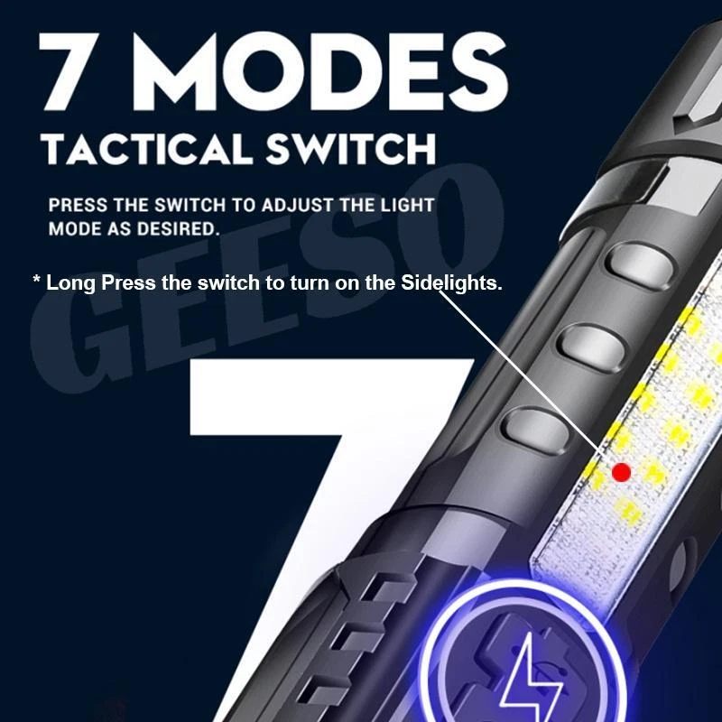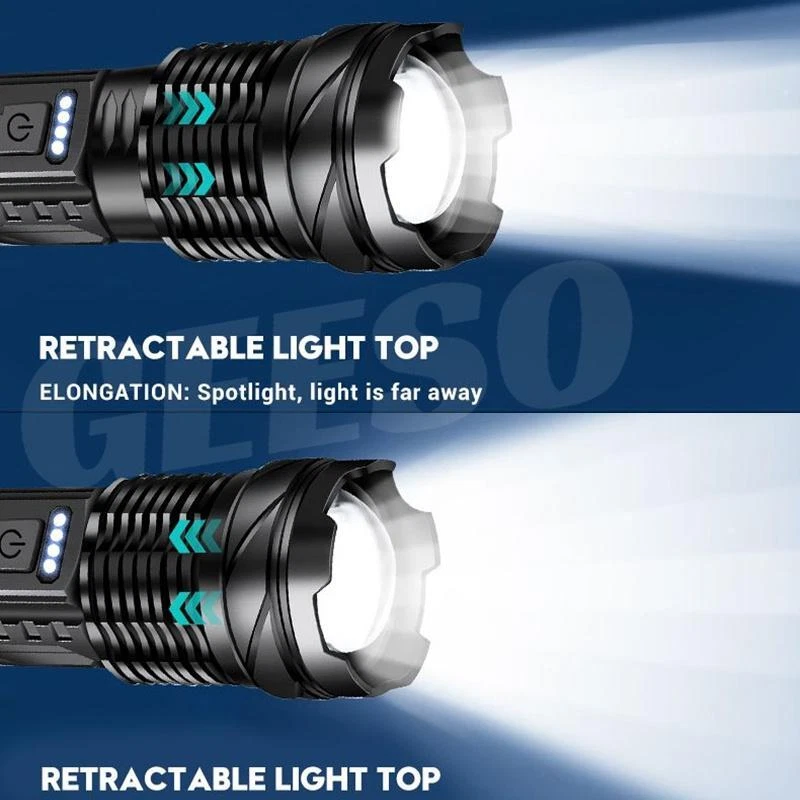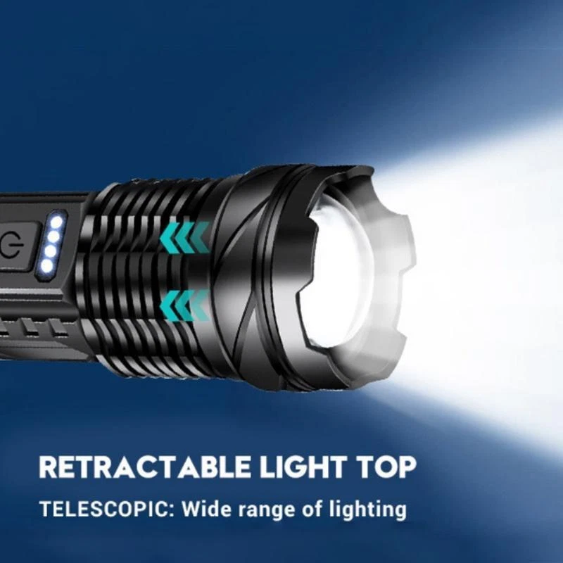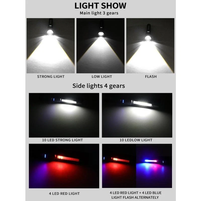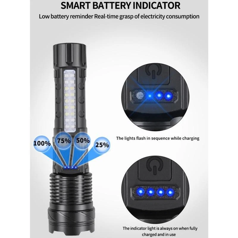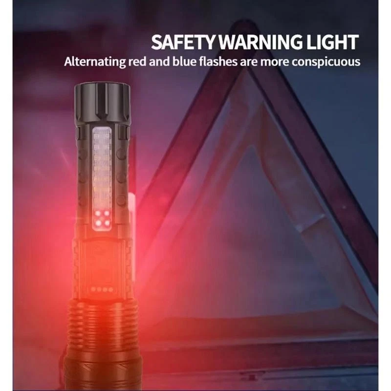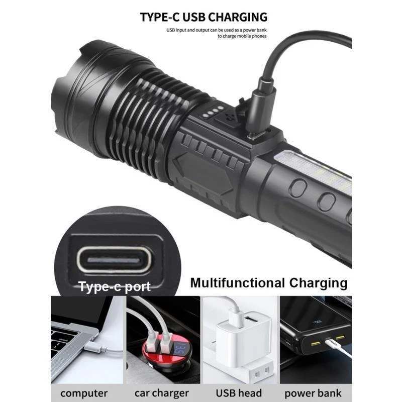 Product Description Bead Type: 30W LED+18LED (10*LED white+4*LED red+4*LED blue) Product Size: 16.5*4.1*2.8CM Net weight: 132G Product Material: Aluminum alloy + ABS Switch Type: Push switch Battery Capacity: Built-in 2600 mAh 18650 battery Charging mode: Type-C USB charging, using rechargeable batteries, can be charged through the USB cable (included), low-light mode can be used for 6 hours Switch gears: Main light 3 gears: strong light - low light - flash Long press to switch to the side light 10 * LED strong light Side light 5 speeds: 10 * LED strong light - 10 * LED low light - 4 * LED red light - 4 * LED red light + 4 * LED blue light alternately flash There are various working modes for you to switch freely to meet your different requirements for lighting. Zoom mode: Telescopic zoom Waterproof Rating: IPX4 life waterproof, the flashlight body is made of high quality splash-proof aluminum alloy to ensure that it can be used even in rainy days, suitable for outdoor use. Product Lumens: About 800 lumens Product range: about 1000-1500 meters Product Features: Strong light far shooting with side lights Electricity display with a tail rope with a pen clip easy to carry Three kinds of light sources to meet a variety of scenarios Charging instructions: four blue LED power indicator Charging time: about 2 hours Discharge time: about 5-6 hours Package Includes: Flashlight + tail rope + USB charging cable