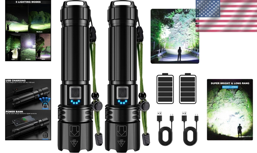 990,000 Lumens Rechargeable LED Flashlights - Waterproof & Versatile 2 Pack ‹ › ‹ › ‹ › ‹ › ‹ › ‹ › ‹ › ‹ › ‹ › 990,000 Lumens Rechargeable LED Flashlights - Waterproof & Versatile 2 Pack Features: Super bright with a maximum output of 990,000 lumens for optimal brightness and comfort. USB fast charging with a large capacity 5000mAh battery for energy conservation. IPX6 waterproof rating, making it suitable for any weather condition. Constructed of high-quality aviation aluminum, capable of withstanding drops up to 10 feet. 5 Lighting modes (high/medium/low/flash/SOS) for various needs. Adjustable focus with a maximum viewing range of 3280 feet for crystal-clear long-distance observation. Comfortable & Efficient Use: Innovative design provides a comfortable grip for prolonged use. Each flashlight takes only 3-4 hours to charge and provides 8-12 hours of powerful illumination. Lightweight and easy to carry, making it perfect for any situation. Why Choose Ultra Bright Flashlights? Experience the ultimate in illumination with our impressive 990,000 Lumens Rechargeable LED Flashlights. Whether you need a reliable light during a power outage, for hiking, camping, or general household use, these flashlights exceed expectations. Crafted from high-quality materials for durability and engineered for comfort, our powerful flashlights illuminate your surroundings with a flicker-free beam, ensuring a pleasant visual experience. Don't settle for less. Equip yourself with the best—order your 2-pack today and enjoy unparalleled brightness wherever life takes you! Shipping Free & Fast Shipping - We offer free shipping to most of the USA with a normal delivery time of 3-7 days. However, due to the current situation, additional delivery time (up to 3 weeks) may be required for some items. Alternative Carriers - We may use alternative carriers (e.g. USPS, FedEx, UPS, etc.) to ensure your package arrives safely and on time. Due to the use of multiple carriers, we are unable to provide a tracking number automatically. Handling Time - Orders are processed and shipped within 1-2 business days of receiving cleared payment. Shipping Restrictions - Shipping to Alaska, Hawaii, Puerto Rico, Guam, and other US territories may incur shipping charges or delivery restrictions. Please contact us before ordering, or your order can be refunded/cancelled. State Restrictions - There may be restrictions based on your state of purchase. For example, certain items may not be shipped to California due to state regulations. Contact for Tracking Updates - If you require tracking updates or have any concerns about the delivery of your order, please feel free to contact us, and we will be happy to assist you. Return 30-Day Hassle-Free Returns - We want you to be completely satisfied with your purchase. If you are not, you can return the item within 30 days of receiving it for a full refund or exchange. Easy Return Process - To start a return, simply contact us and we will provide you with a prepaid return shipping label and detailed instructions. Restocking Fee - There are no restocking fees for returns. However, the buyer is responsible for return shipping costs if the return is not due to a seller's error. Refund Processing Time - Refunds will be processed within 5 business days of receiving the returned item in its original condition. Payment We accept all major credit cards, PayPal, and Apple Pay for your convenience. Your payment information is secure and encrypted to ensure a safe and seamless transaction. Please complete your payment within 3 days of purchase to avoid any delays in shipping. Feedback Your feedback is extremely important to us. We strive to provide the best products and customer service possible. If you are satisfied with your purchase, please take a moment to leave us a positive review. If you have any concerns or issues with your order, please contact us before leaving negative feedback. We are committed to resolving any problems and ensuring your satisfaction. Contact Us If you have any questions or concerns, please feel free to reach out to our customer support team. You can contact us through the eBay messaging system. We are available Monday to Friday, 9:00 am to 5:00 pm EST, and we will do our best to respond to your inquiry within 24 hours. Thank you for supporting our small family business! UPC: Not Set Voltage: 3.7 volts (dc) Item Height: High Lumen Rechargeable Flashlights Item Length: High Lumen Rechargeable Flashlights Item Weight: 1.43 pounds Item Width: Not Set Model: Not Set Lumens: 990000 Number of LEDs: Not specified Unit Quantity: 2 Pack Features: Handheld,Rechargeable,Waterproof,Super Bright,USB Fast Charging,Energy Efficient,Environmental Friendly,5 Lighting Modes,Adjustable Focus,Anti-Drop Function Material: Aluminum Brand: Unbranded Type: Flashlight Lighting Technology: LED Power Source: Battery Operating Range: 3280 feet MPN: Not Set Battery Technology: AAA Number of Batteries: 2 Aaa Batteries Required. (included) Color: Black Country/Region of Manufacture: Not Set IP Rating: IPX6 Operating Time: 8-12 Hours Number of Lights: Not specified Unit Type: lb Personalize: Not Set